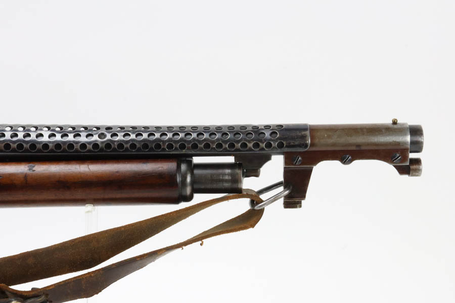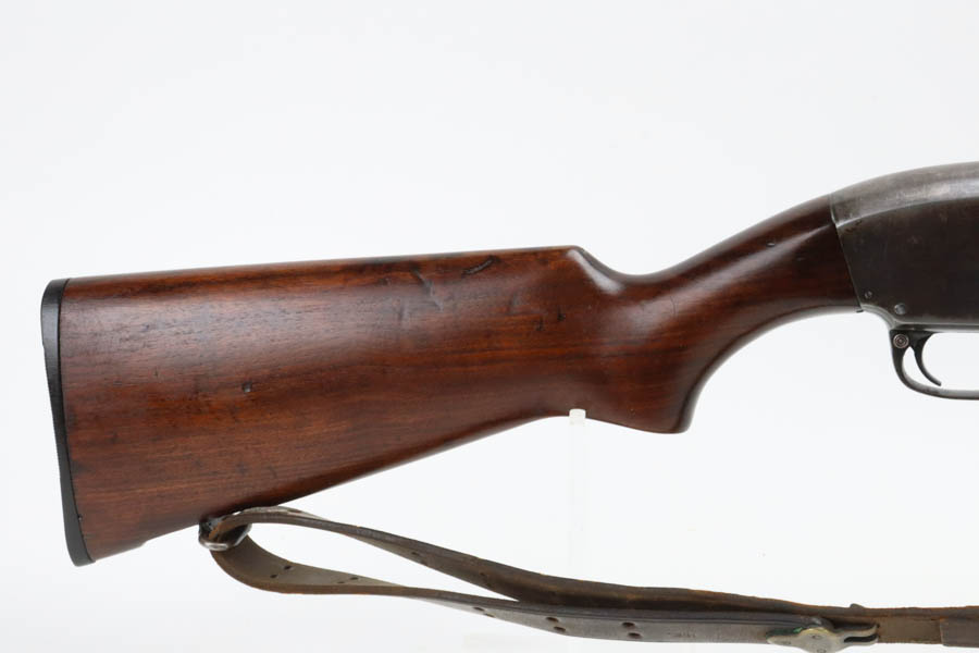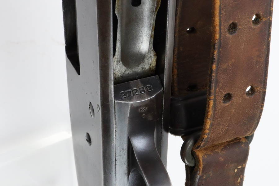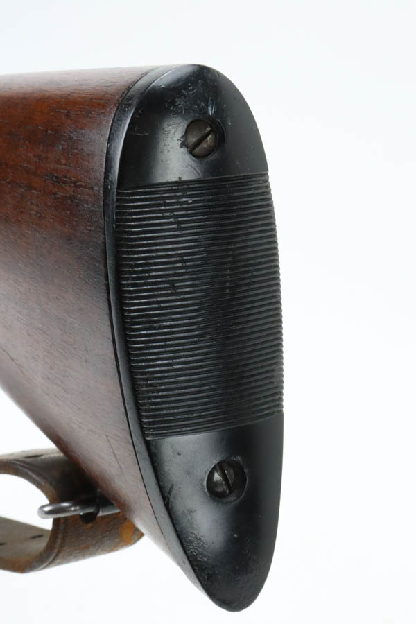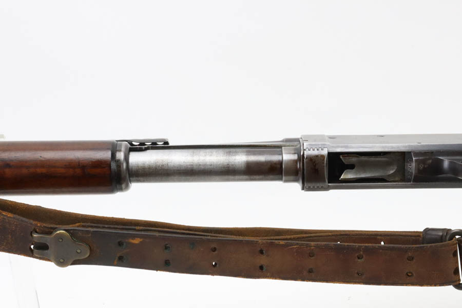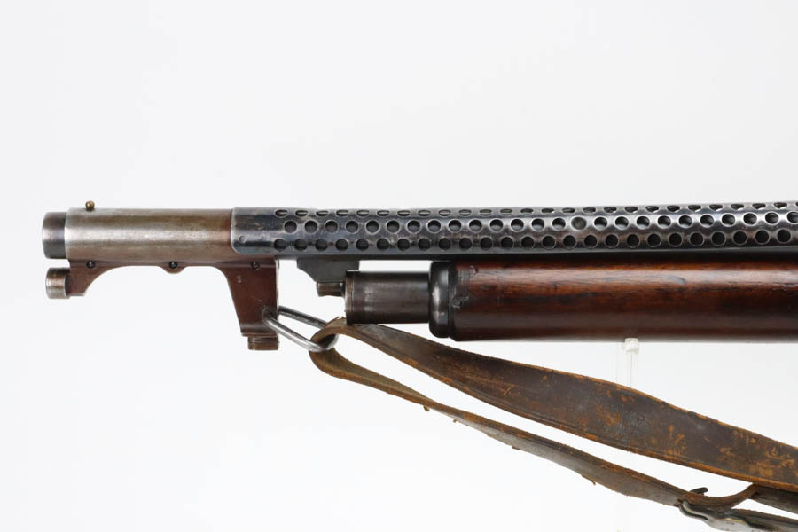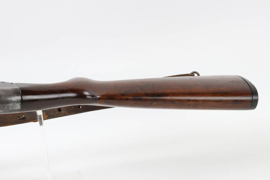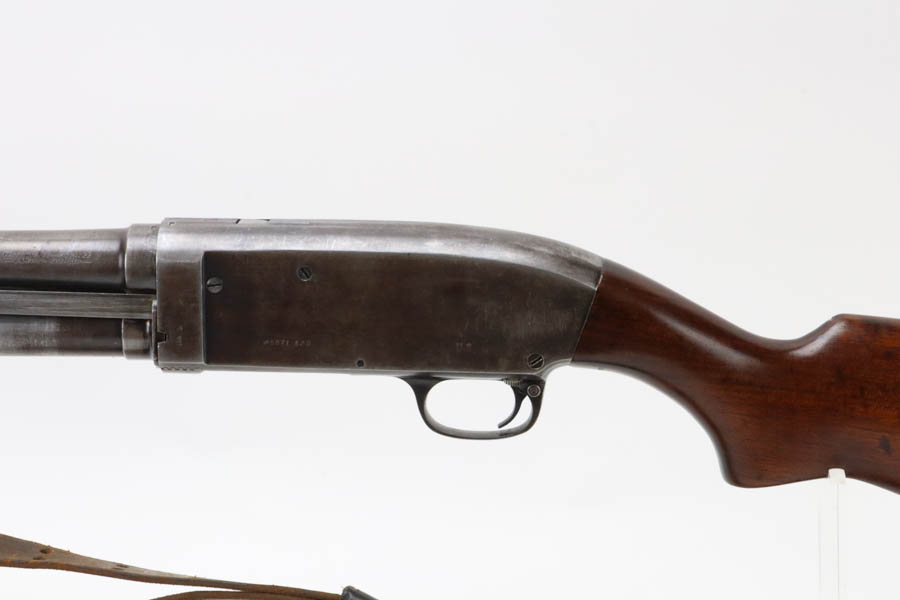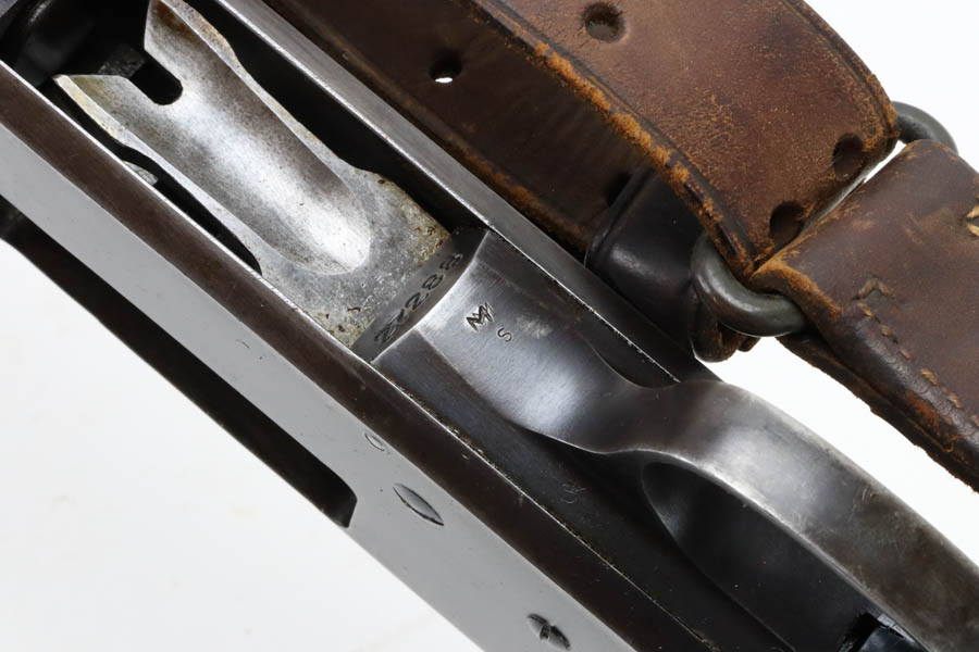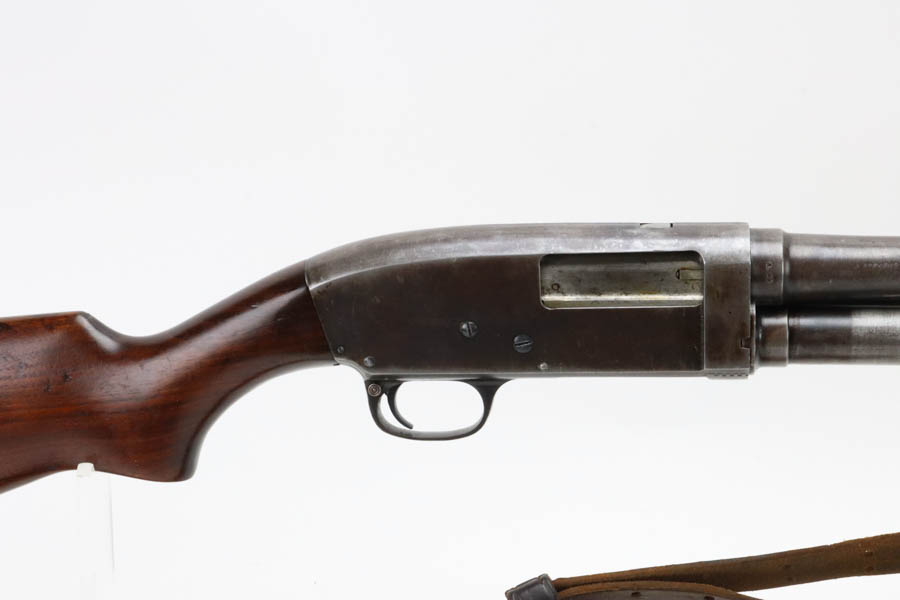 6/7/24 – This is a very rarely encountered Stevens Savage Model 620 trench shotgun, made as a part of US military procurement during WWII. Unlike its M520 counterpart, this was a hammerless model, very much like Winchester M12. It was produced in trench configuration in limited numbers and is very difficult for a collector to acquire. This particular gun is a textbook example, with all the correct military markings, original finish and all original parts including the bayonet lug and heat shield. Canfield reports that fewer than 10,000 military trench examples were ordered during WW2. This particular example is in good condition with but does have thinning to the finish on the receiver and heat shield throughout. Receiver and barrel both have the flaming bomb proofs, and the receiver is ‘U.S.’ marked. The wood parts are in great shape with minor handling wear. Excellent, shiny bore. Comes with a very nice Winchester bayonet with scabbard, though the Winchester proof is somewhat faded.