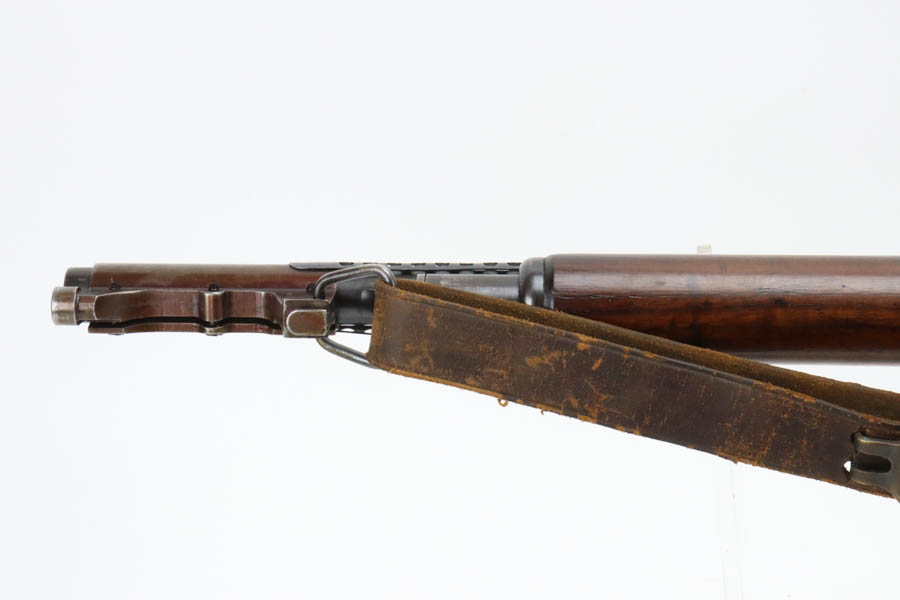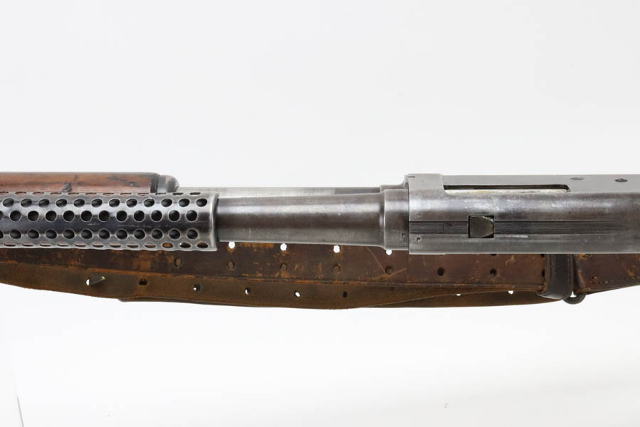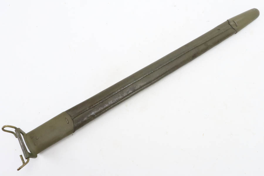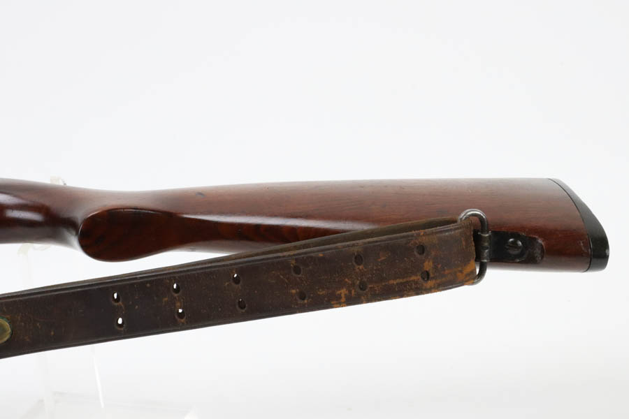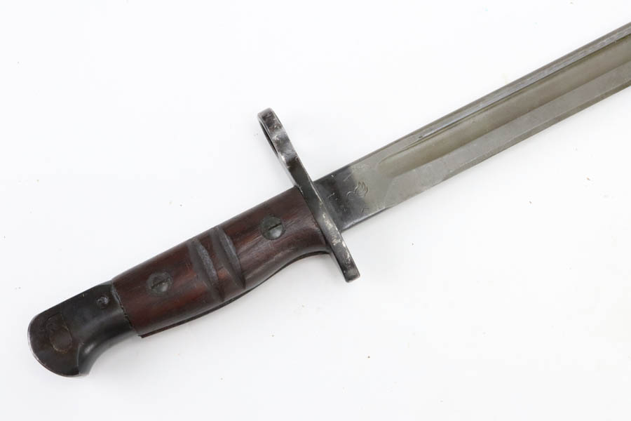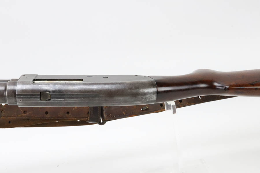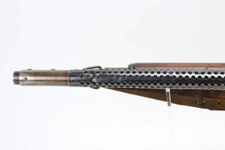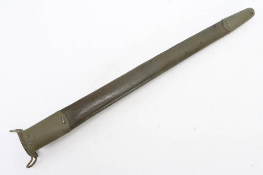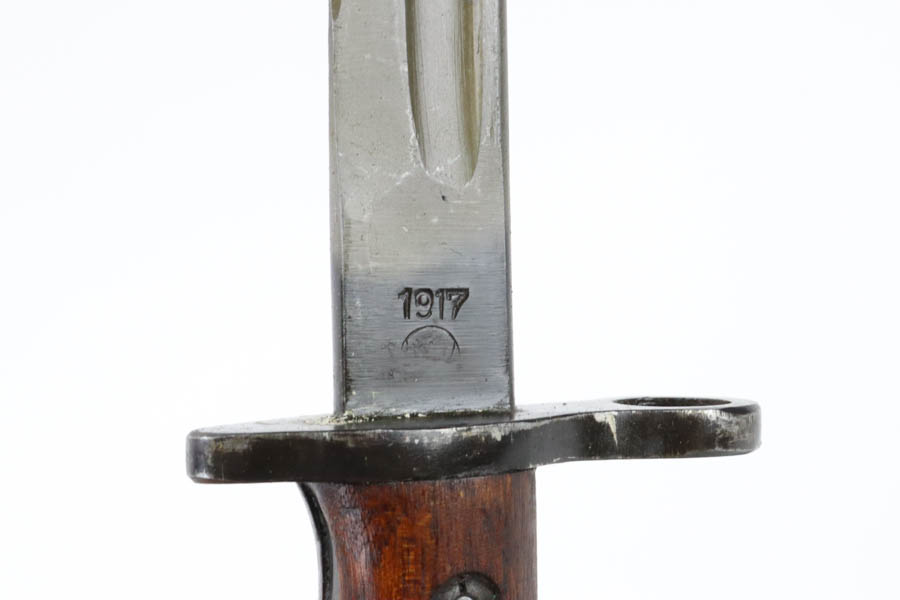 6/7/24 – This is a very rarely encountered Stevens Savage Model 620 trench shotgun, made as a part of US military procurement during WWII. Unlike its M520 counterpart, this was a hammerless model, very much like Winchester M12. It was produced in trench configuration in limited numbers and is very difficult for a collector to acquire. This particular gun is a textbook example, with all the correct military markings, original finish and all original parts including the bayonet lug and heat shield. Canfield reports that fewer than 10,000 military trench examples were ordered during WW2. This particular example is in good condition with but does have thinning to the finish on the receiver and heat shield throughout. Receiver and barrel both have the flaming bomb proofs, and the receiver is ‘U.S.’ marked. The wood parts are in great shape with minor handling wear. Excellent, shiny bore. Comes with a very nice Winchester bayonet with scabbard, though the Winchester proof is somewhat faded.