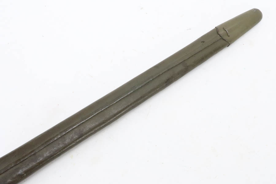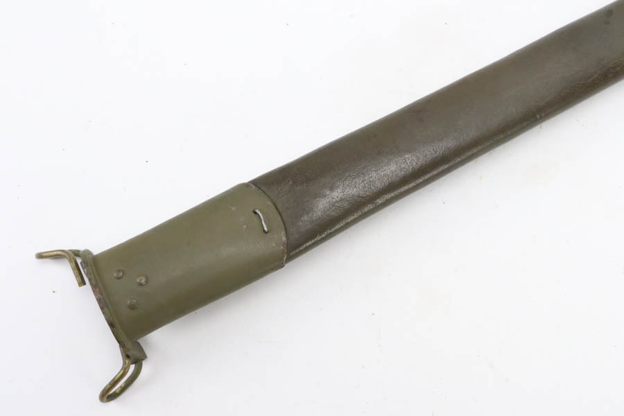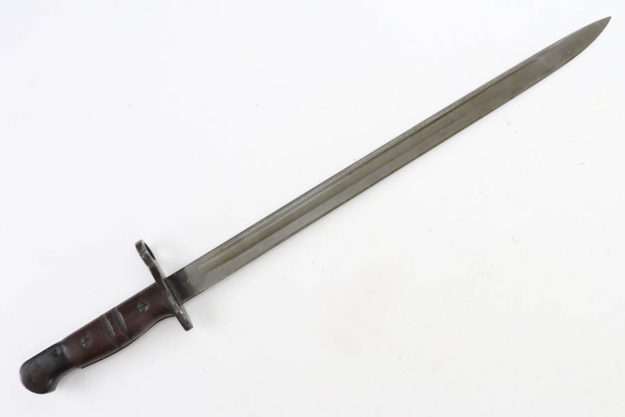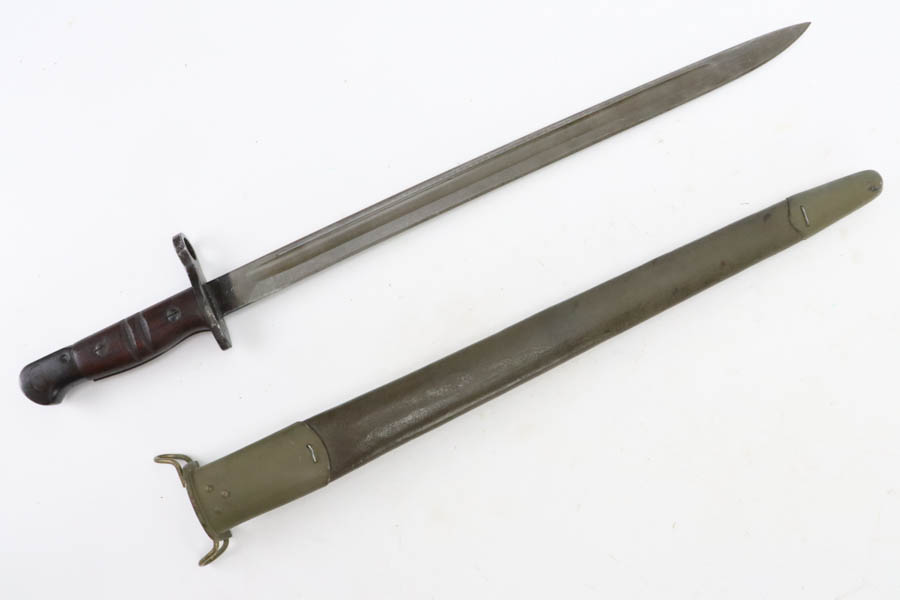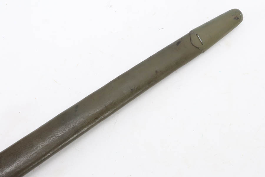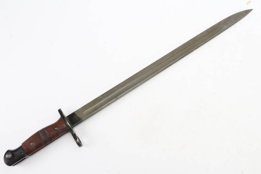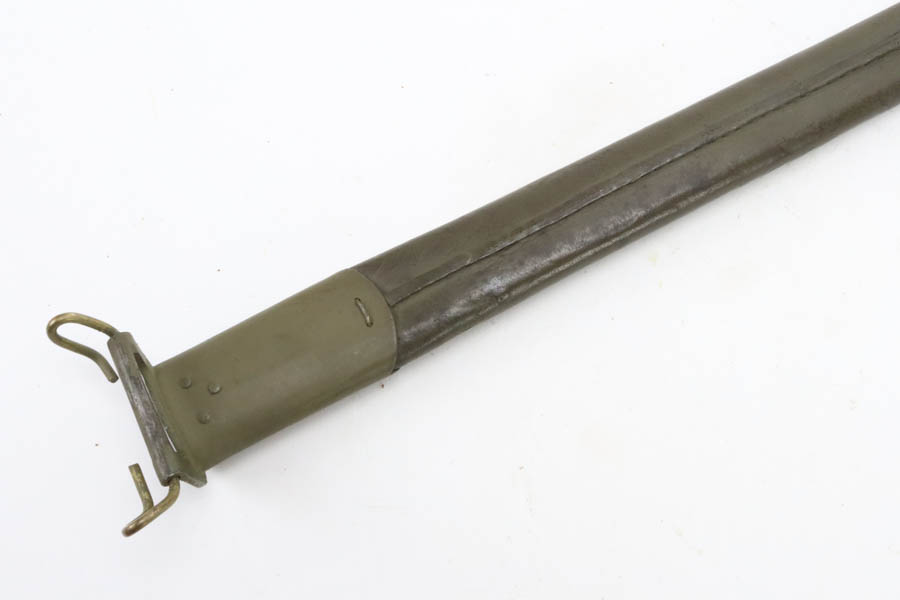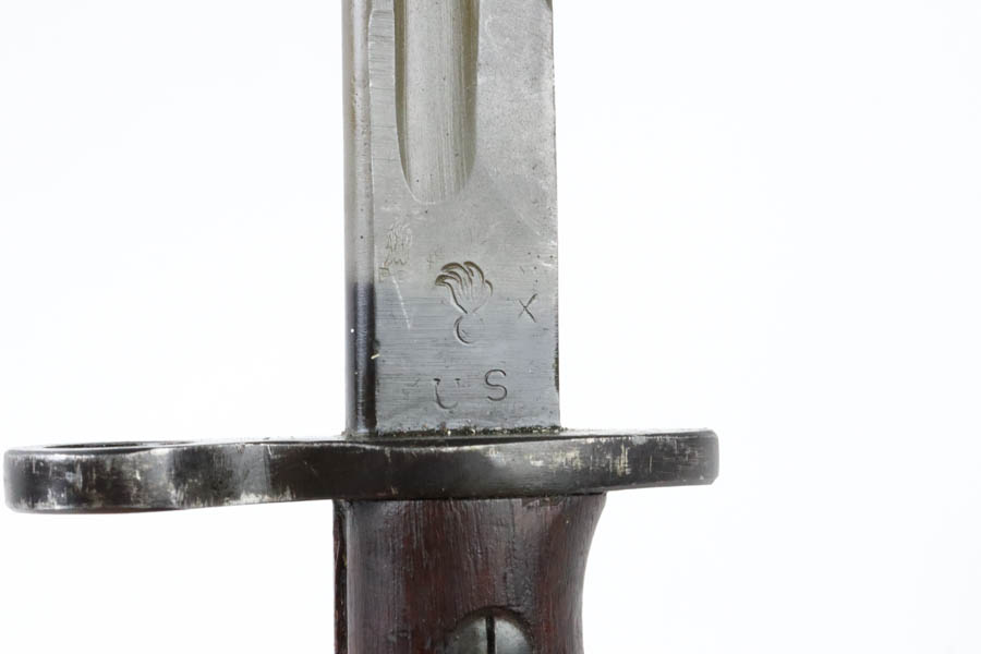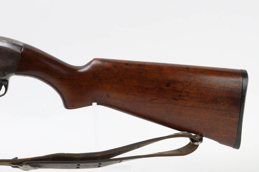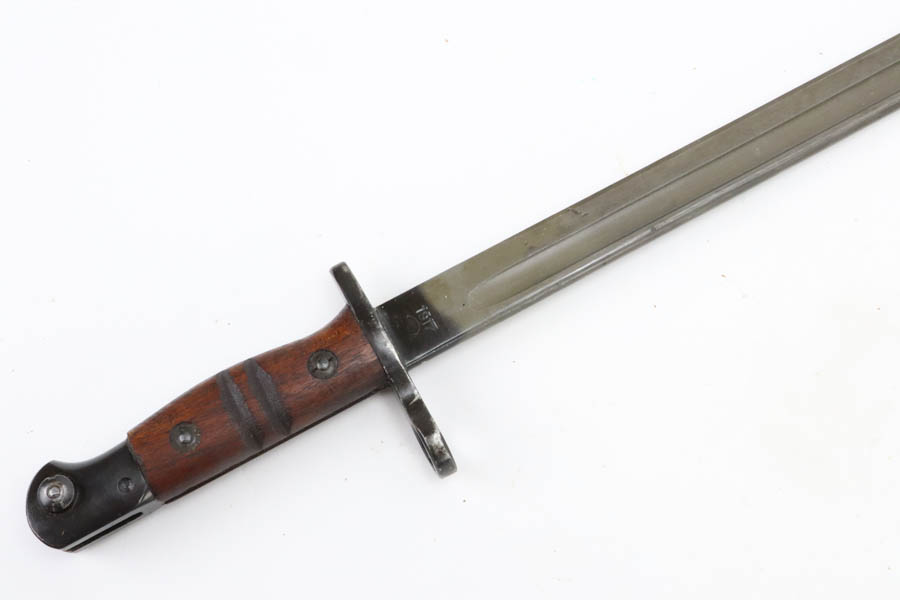6/7/24 – This is a very rarely encountered Stevens Savage Model 620 trench shotgun, made as a part of US military procurement during WWII. Unlike its M520 counterpart, this was a hammerless model, very much like Winchester M12. It was produced in trench configuration in limited numbers and is very difficult for a collector to acquire. This particular gun is a textbook example, with all the correct military markings, original finish and all original parts including the bayonet lug and heat shield. Canfield reports that fewer than 10,000 military trench examples were ordered during WW2. This particular example is in good condition with but does have thinning to the finish on the receiver and heat shield throughout. Receiver and barrel both have the flaming bomb proofs, and the receiver is ‘U.S.’ marked. The wood parts are in great shape with minor handling wear. Excellent, shiny bore. Comes with a very nice Winchester bayonet with scabbard, though the Winchester proof is somewhat faded.