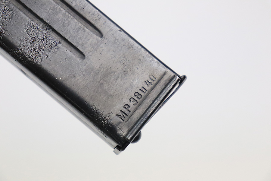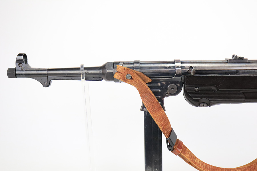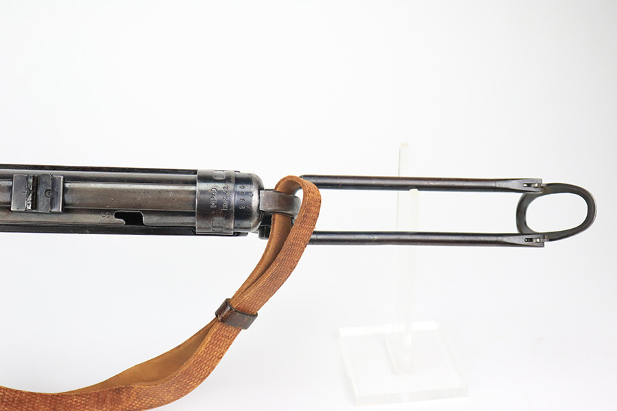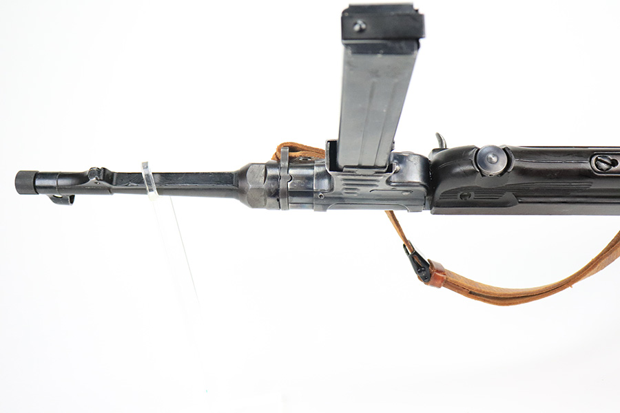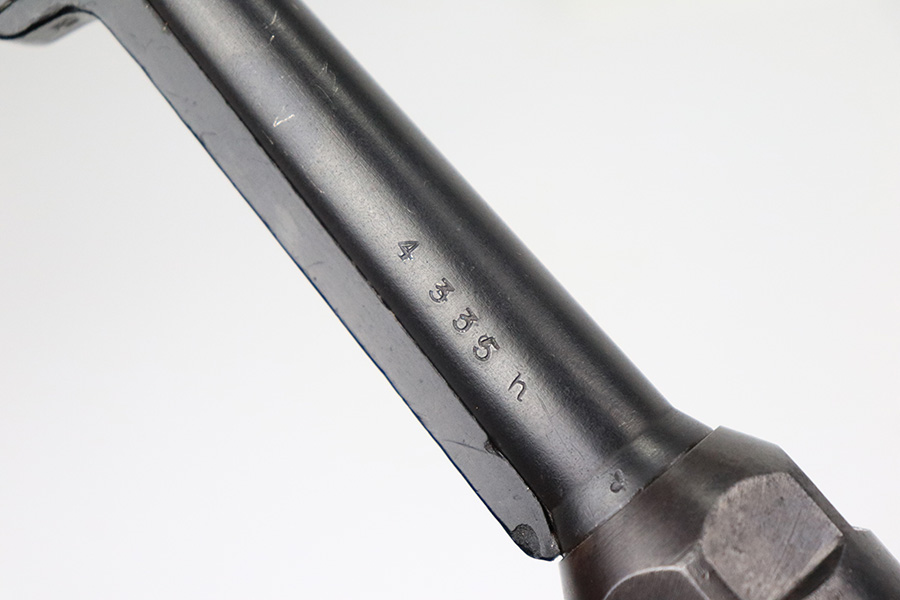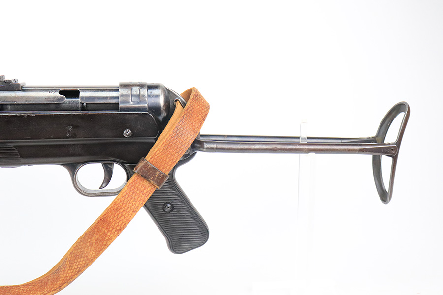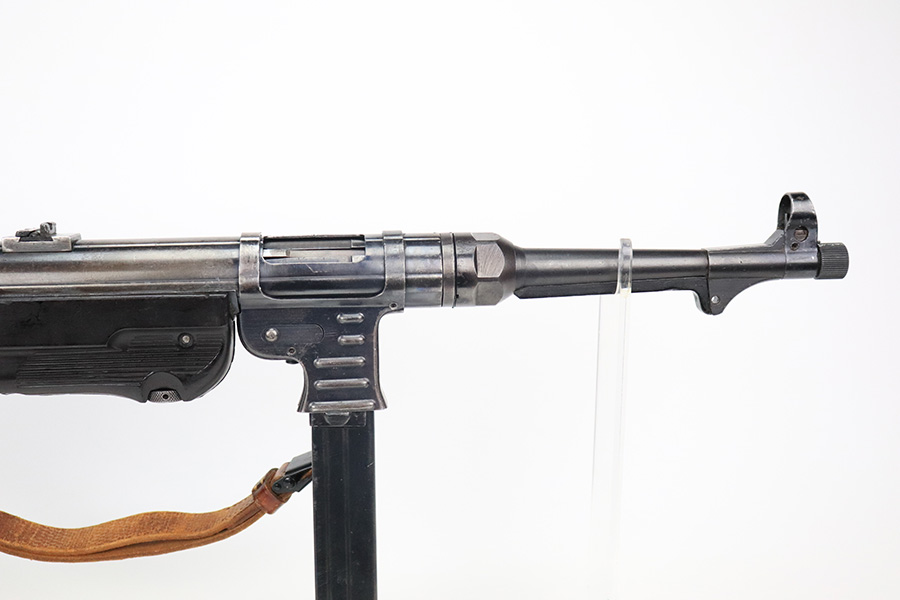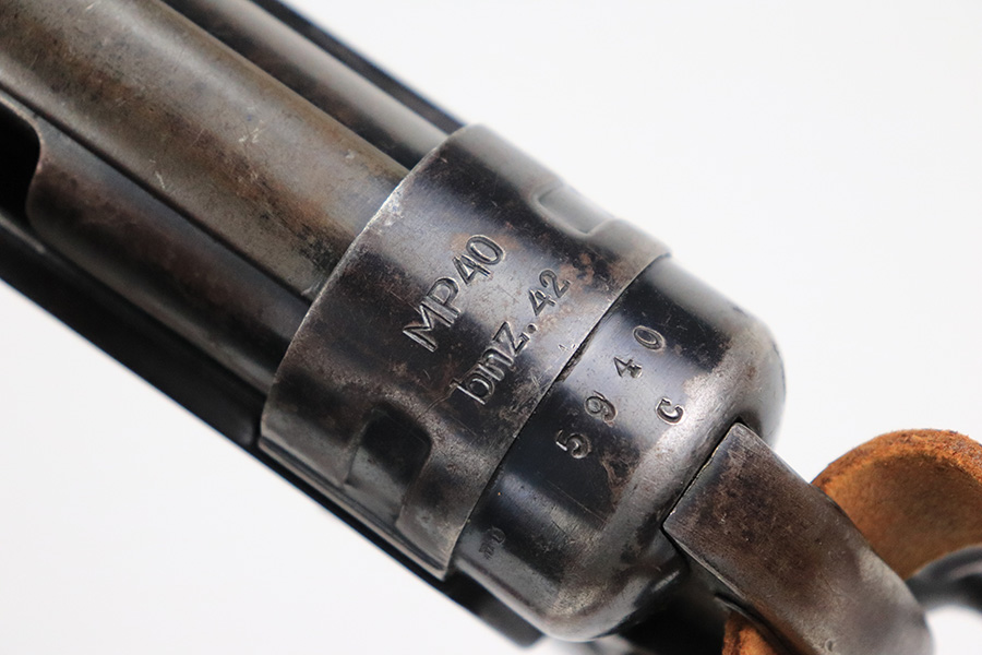 6/21/22 – This is a nice example of the iconic MP40 submachine gun as produced by Steyr in 1942 for the German military. The MP40 made extensive use of metal stampings and synthetic materials to make a weapon robust enough to withstand the stress of war while being simple enough to manufacture to keep up with the demand. Nearly every armed branch and paramilitary organization in Germany made use of the MP40, and many also found their way into the hands of opposition forces such as the French Resistance and Poland’s Home Army, making it one of the signature weapons of the war. This particular example is mostly matching numbers, except for a mismatched firing pin and mismatched barrel. The barrel is a WW2 original example with better remaining blue quality than the rest of this firearm. The receiver and grip show notable thinning throughout. The magazine is period original but was refinished at some point and does have a few patches of pitting under the blue. The mechanics appear all good and correct on this rifle. The bore shows strong rifling but frost and freckling throughout. There’s also a small area with a visible gouge that we attempted to show in photos. Fully transferrable curio.
