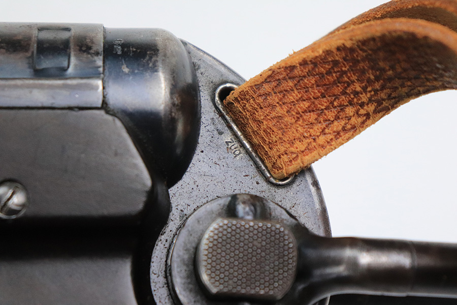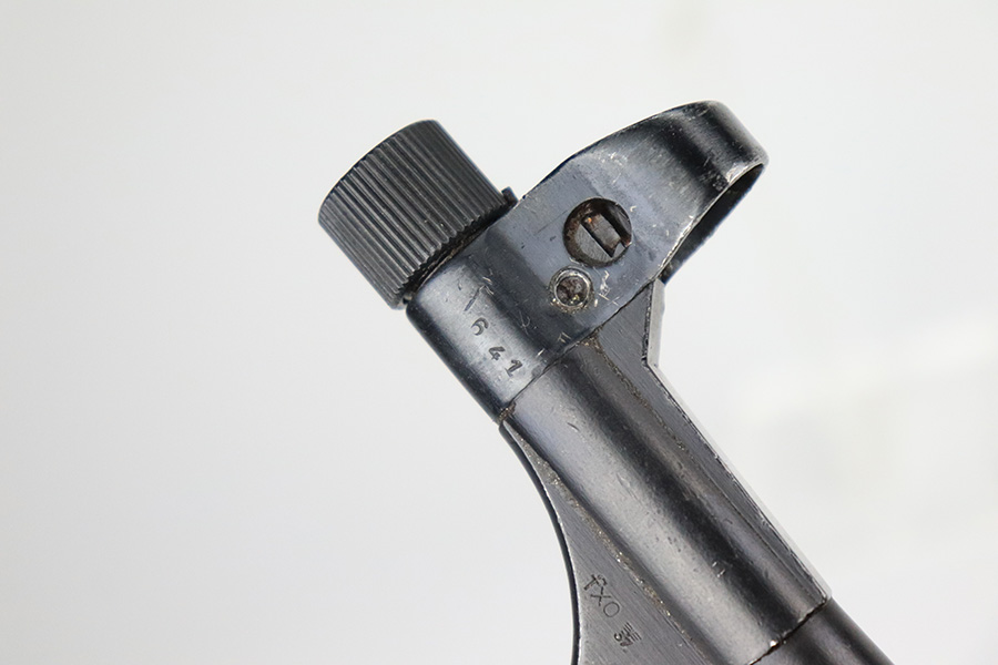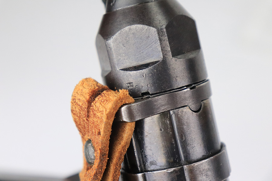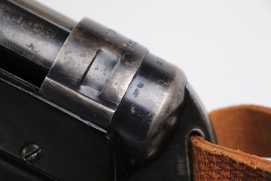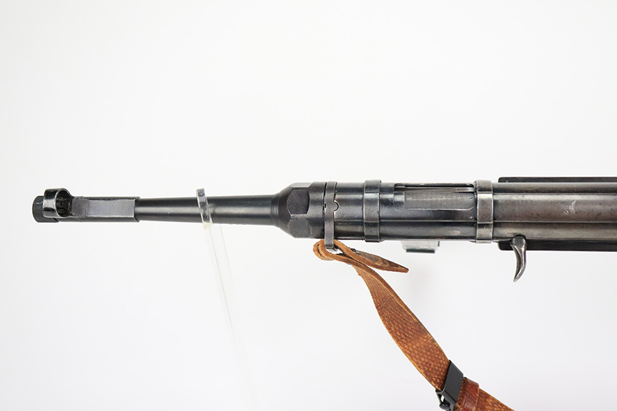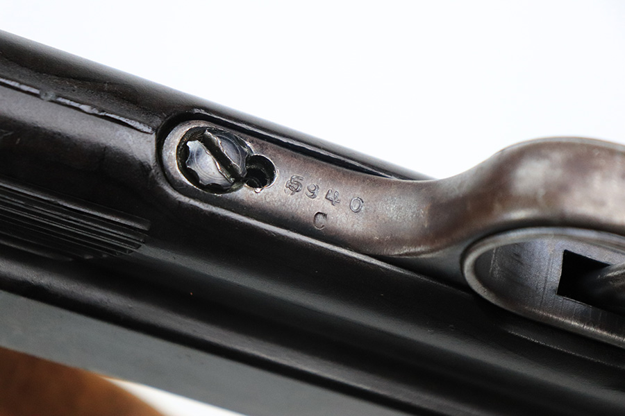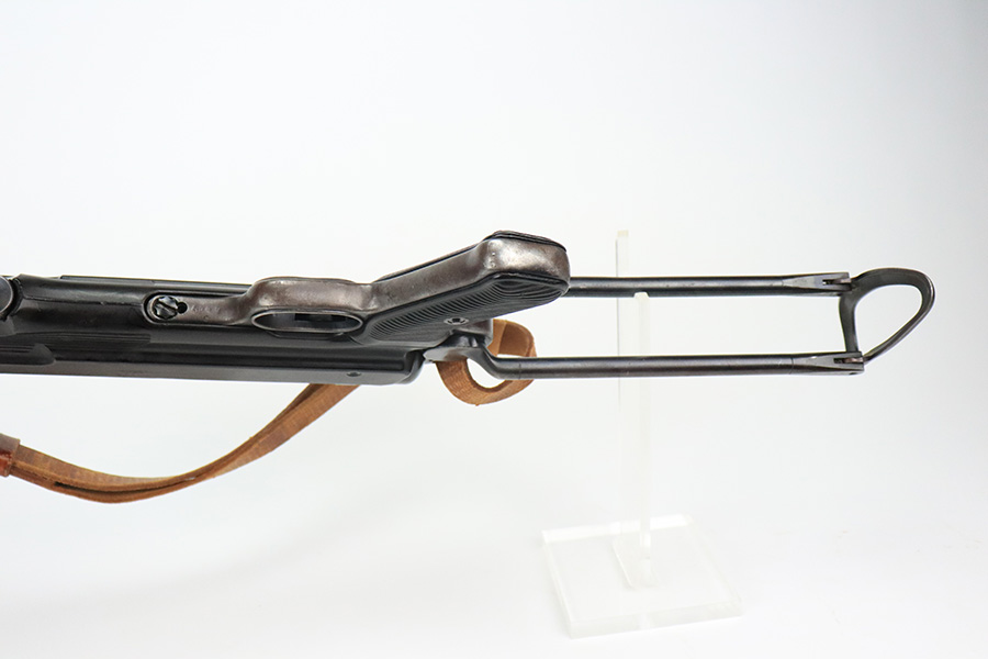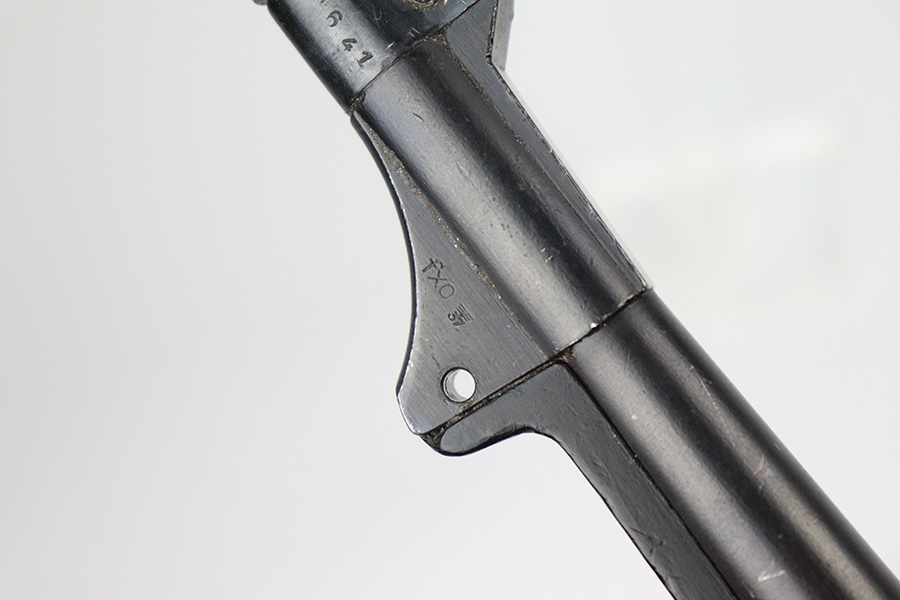 6/21/22 – This is a nice example of the iconic MP40 submachine gun as produced by Steyr in 1942 for the German military. The MP40 made extensive use of metal stampings and synthetic materials to make a weapon robust enough to withstand the stress of war while being simple enough to manufacture to keep up with the demand. Nearly every armed branch and paramilitary organization in Germany made use of the MP40, and many also found their way into the hands of opposition forces such as the French Resistance and Poland’s Home Army, making it one of the signature weapons of the war. This particular example is mostly matching numbers, except for a mismatched firing pin and mismatched barrel. The barrel is a WW2 original example with better remaining blue quality than the rest of this firearm. The receiver and grip show notable thinning throughout. The magazine is period original but was refinished at some point and does have a few patches of pitting under the blue. The mechanics appear all good and correct on this rifle. The bore shows strong rifling but frost and freckling throughout. There’s also a small area with a visible gouge that we attempted to show in photos. Fully transferrable curio.