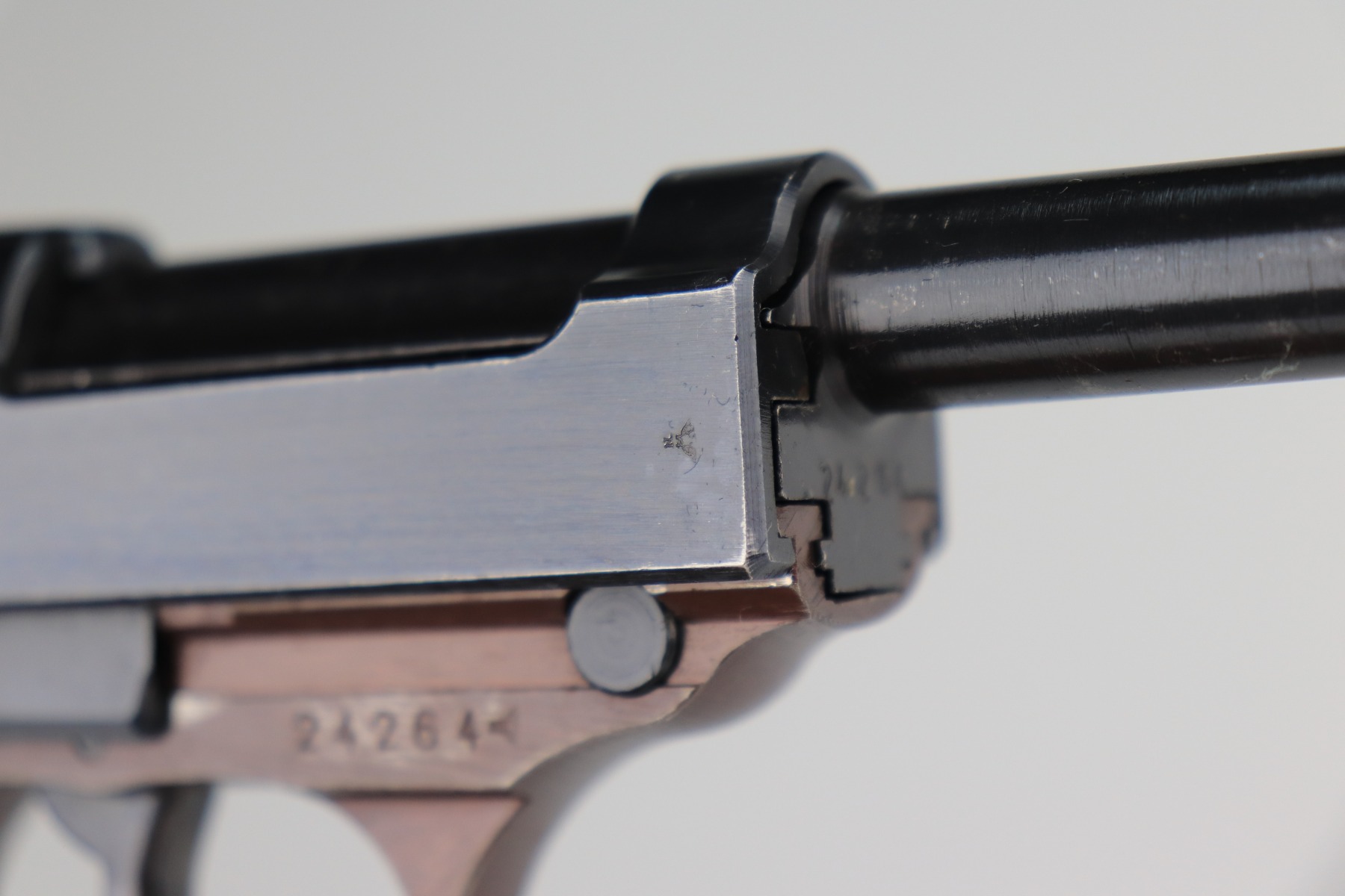 1/8/21 – This is a stunning example of a rare Walther Mod P.38 sold in the commercial market during WW2. This one is all matching and has the proper “Eagle N” proofs. This gun is rare as only 1,800 were produced. It has retained about 98% of its original bluing. This one has a gorgeous, vibrant, plumb-colored frame. Just a gorgeous gun. There is minor wear around the muzzle, on the barrel, and a hint of thinning on the front strap. It comes with excellent red grips and a slightly plumb-colored magazine. The bore is mint.