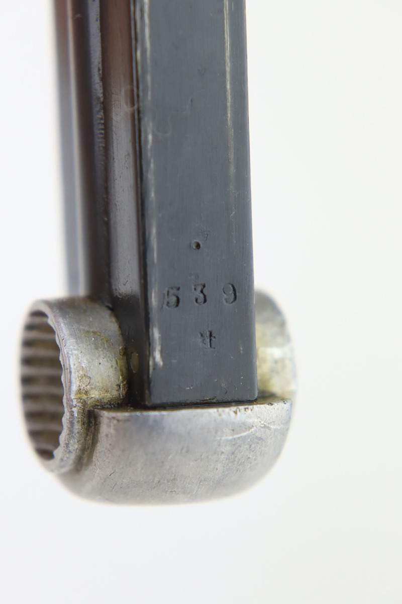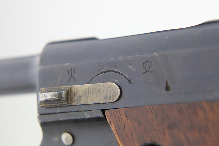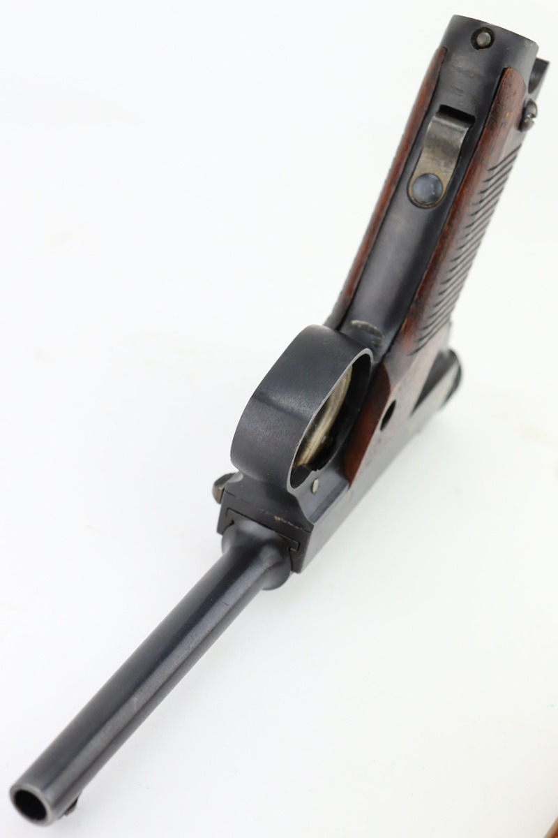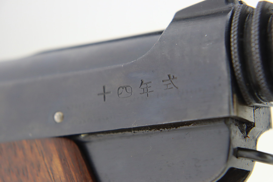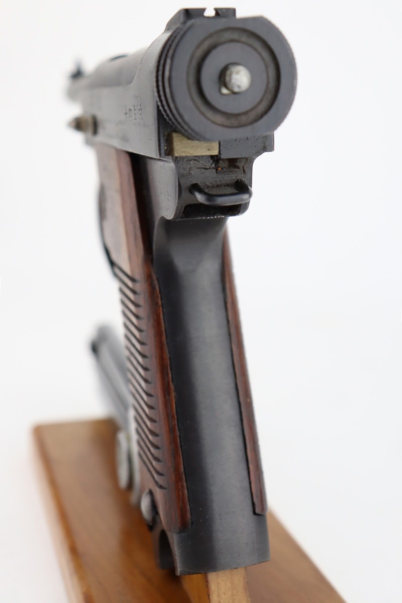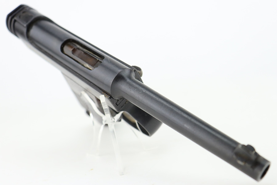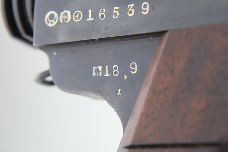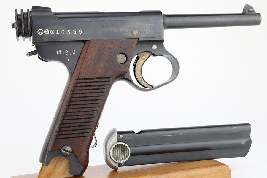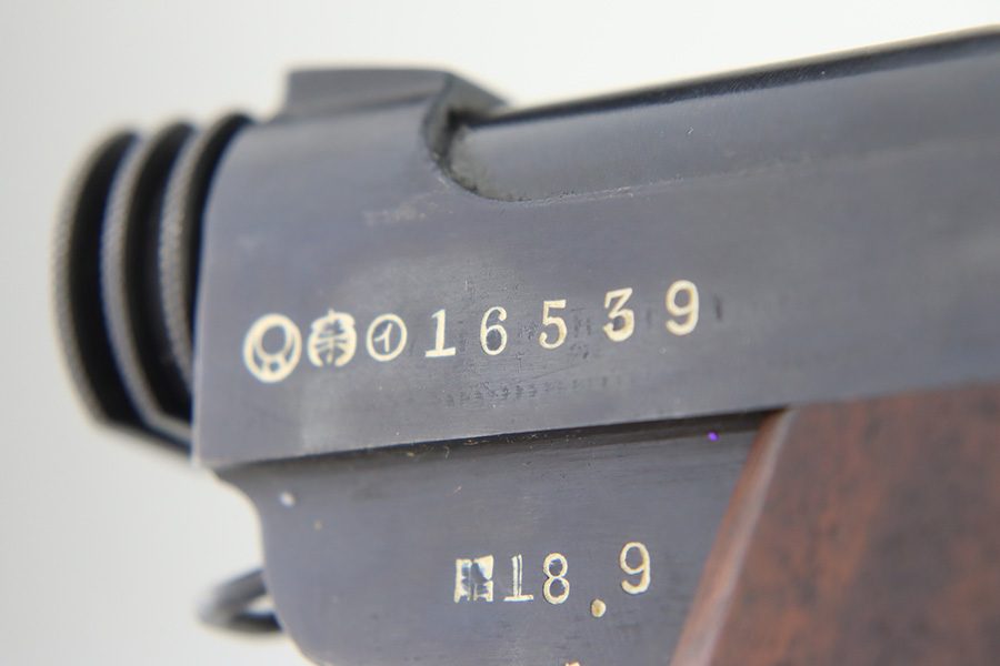 2/1/24 – This is a beautiful example of a Nambu Type 14 issued to the Japanese military in September of 1943. It is all matching, comes with one original matching-numbered magazine, and has transitional features, such as a large trigger guard with straw-colored small parts. It has retained virtually all of its bluing with just some tiny scratches on the right side of the slide. Vibrant straw-coloring on the small parts. Fitted with mint matching hand-numbered grips. Stone-mint bore.
