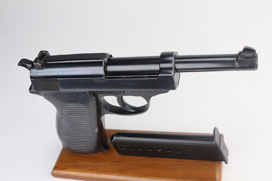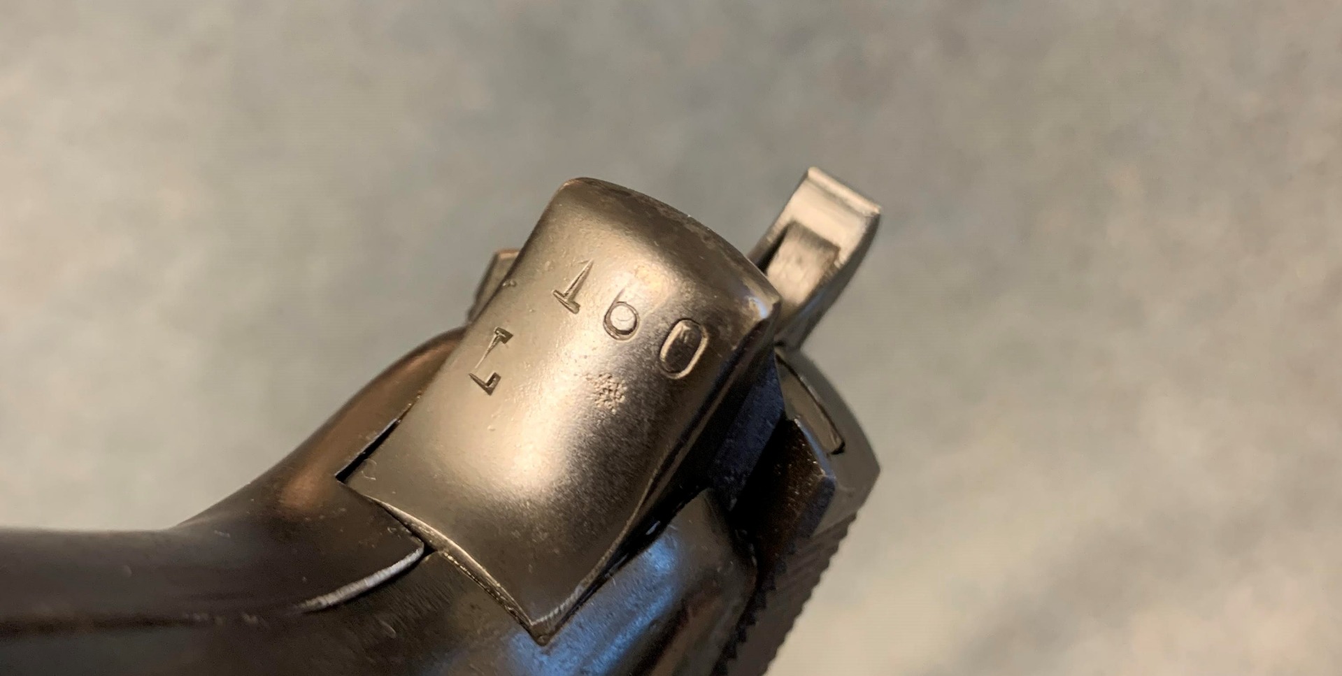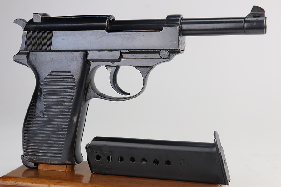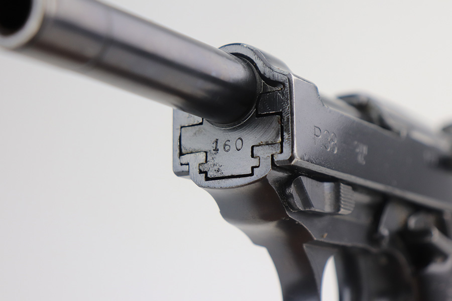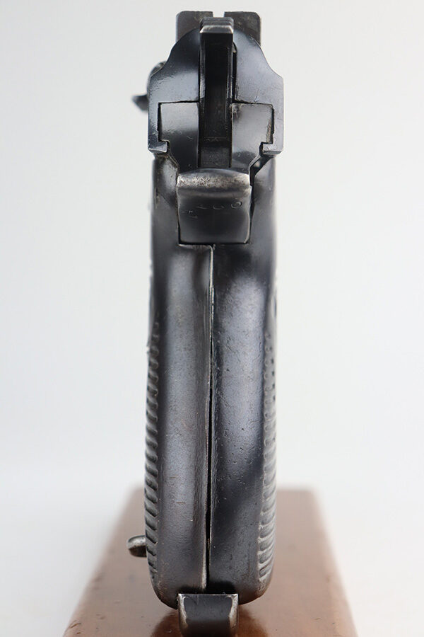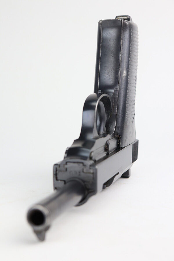 6/8/21 – This is a rare French Mauser P.38 manufactured in 1946. It has a rare “L” block serial number, and is one of the last ones made. It is all matching and has retained about 98% of its bluing. There is minor wear at the front of the slide and around the muzzle. A few areas of minor pin-pricking, most noticeable on the straps. Comes with nice post-war French grips with minor wear along the edges. Also comes with a “jvd” marked magazine. Mint bore. Functional de-cocker.