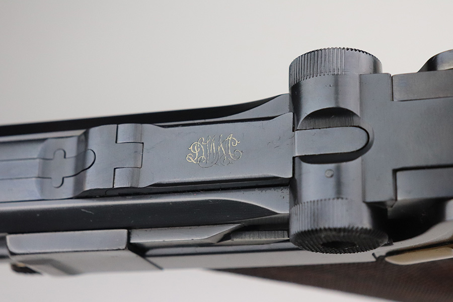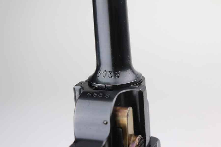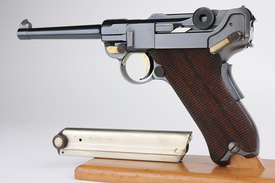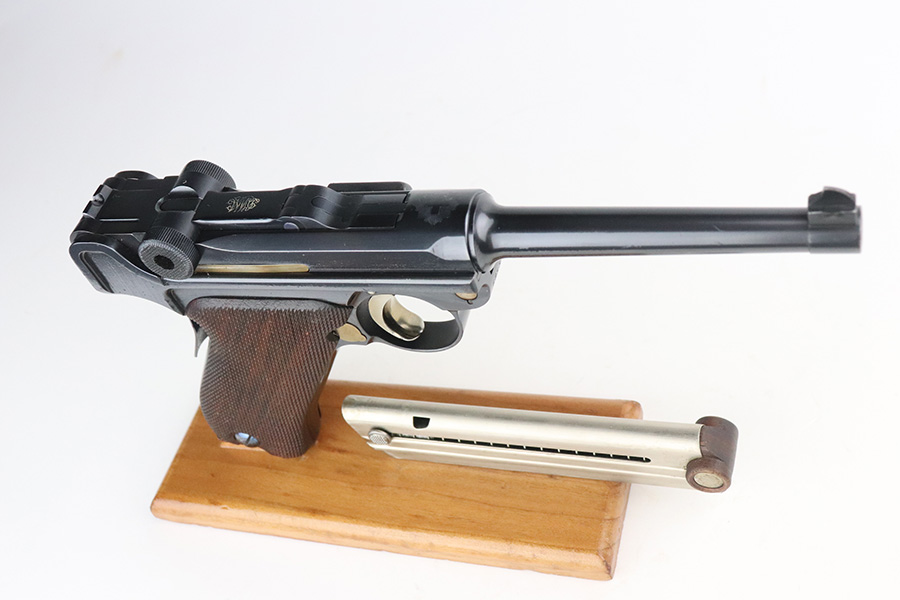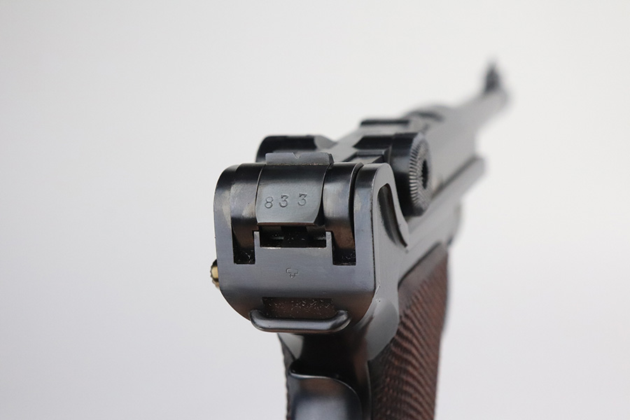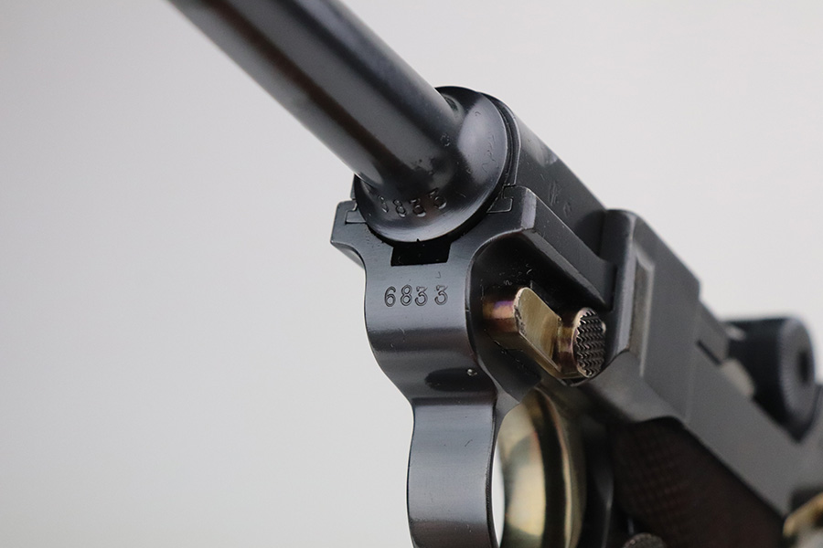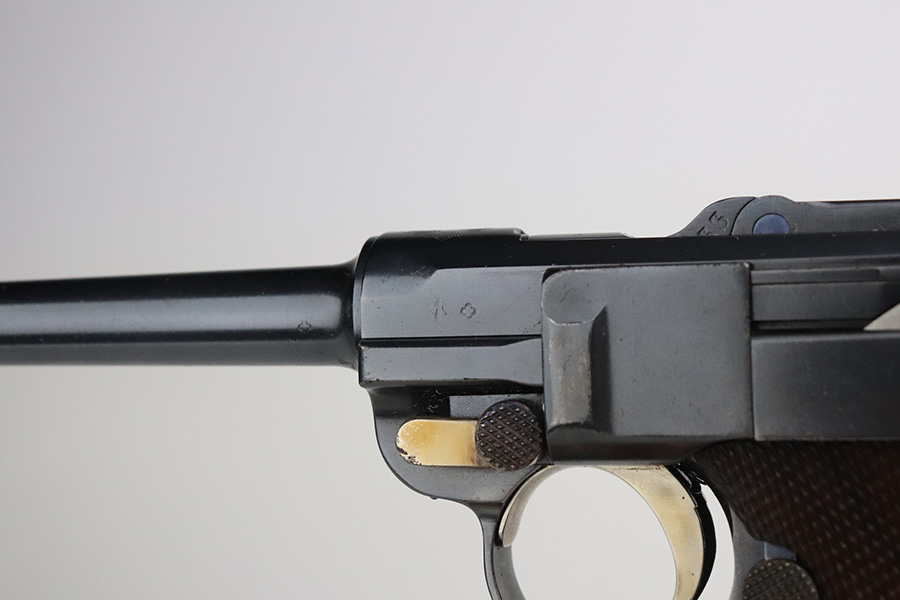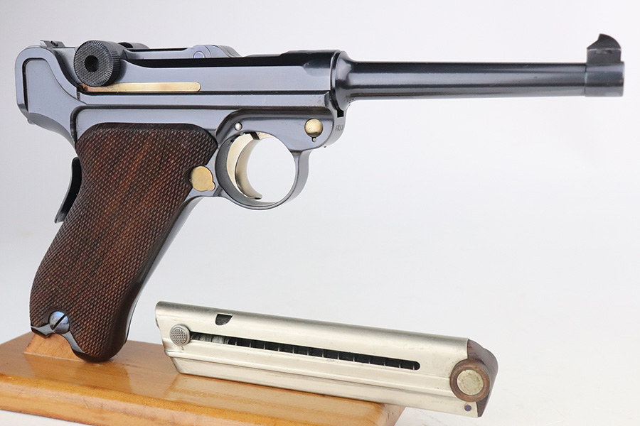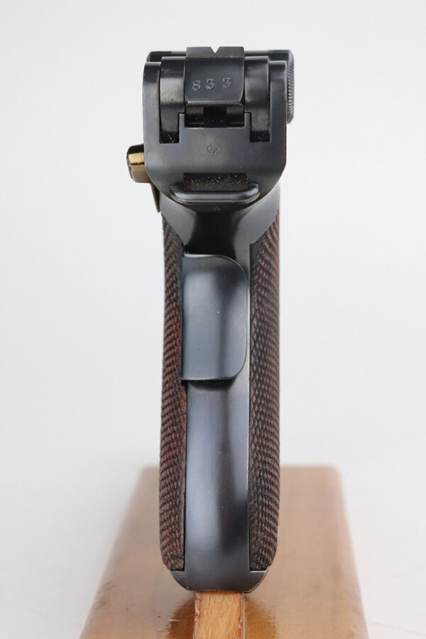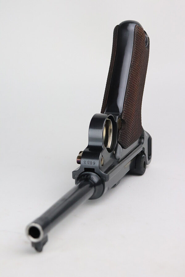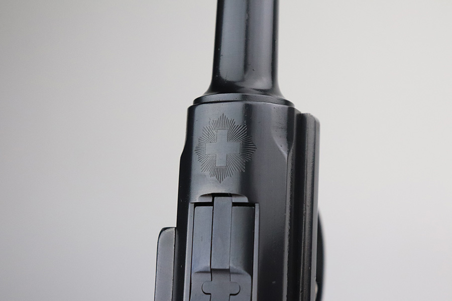 7/27/21 – This is an excellent example of a Swiss DWM Model 1906 Luger, chambered in .30 Luger. It is all matching, has the proper Swiss cross inspection proofs throughout, and has the proper Swiss Cross Sunburst logo on the chamber. The entire gun has been professionally restored, so it is in beautiful condition. There is just very minor somewhat scratchy wear on the side plate. Comes with excellent grips and a proper Swiss magazine that has a crack in the mag bottom. The bore is mint.