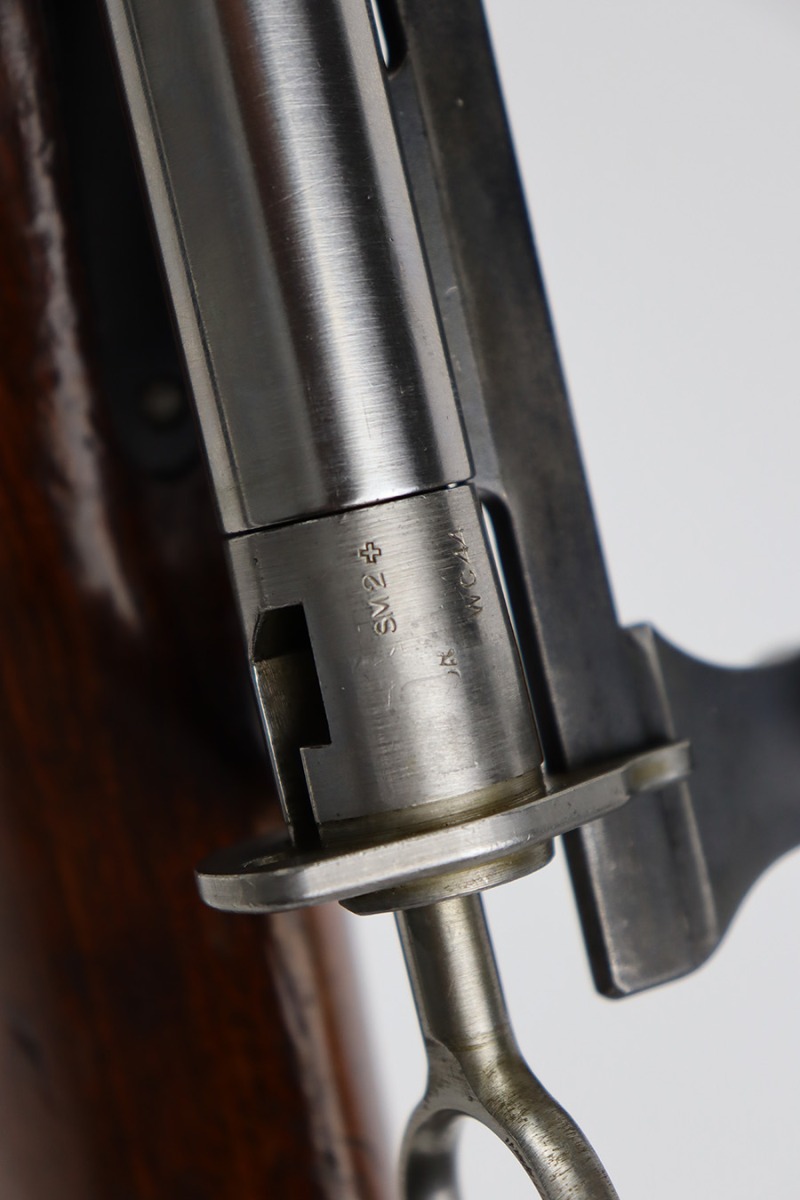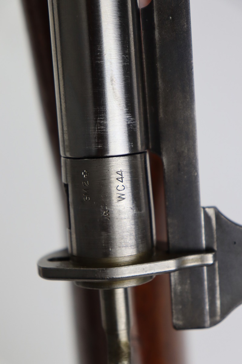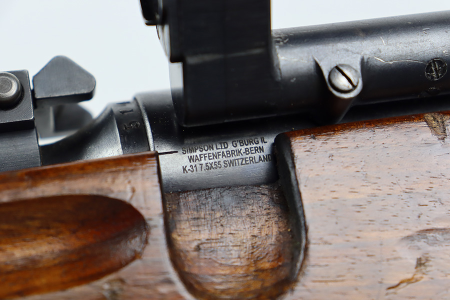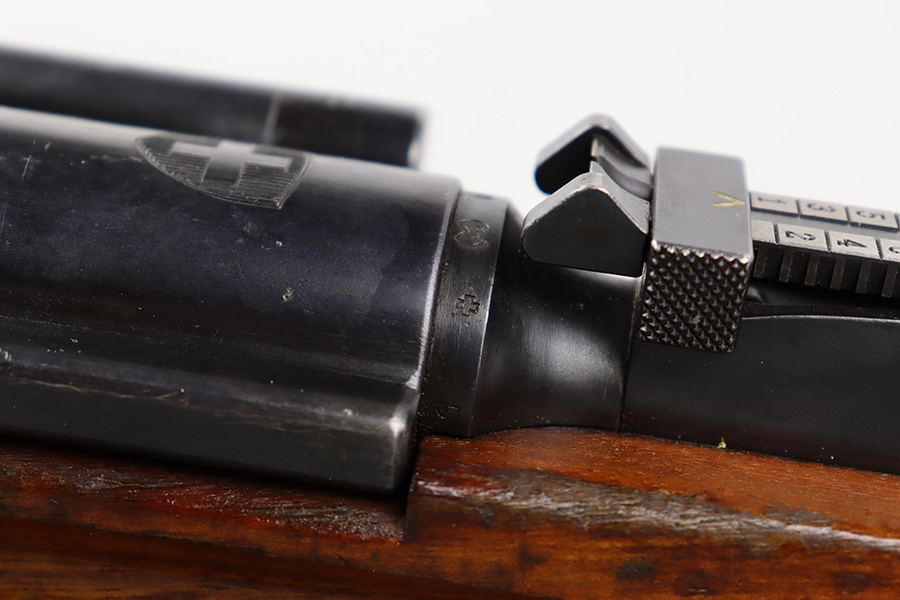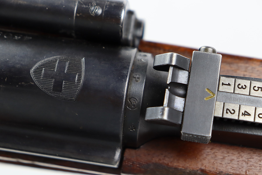 7/13/23 – This is a beautiful example of a super rare Swiss K31/42 sniper rifle from 1942. There were only 2,300 ZFK31/42 and ZFK31/43 rifles produced in total, with the only distinction being the zoom power of the optic. A variant of Swiss K31 straight-pull service rifle, these were the first Swiss sniper rifle designed during WWII and used a 1.89x side mount sniper scope with a folding front objective head that folds down on to the side of the stock for protection during transport. The scope was designed this way to keep the snipers head down. It has the standard Swiss wide, inverted “v” reticle and the optics on this particular example are clear/excellent. It also features an adjustable sight with slider to compensate for bullet drop. The rifle features matching numbers on the barrel, receiver and magazine. Terrific bluing throughout, aside from on the scope itself which shows nearly all of the bluing loss. The stock shows various dings and nicks throughout but no structural issues. Small import mark discretely hidden under the flip up portion of the scope. Minty bore. Comes with a leather sling.