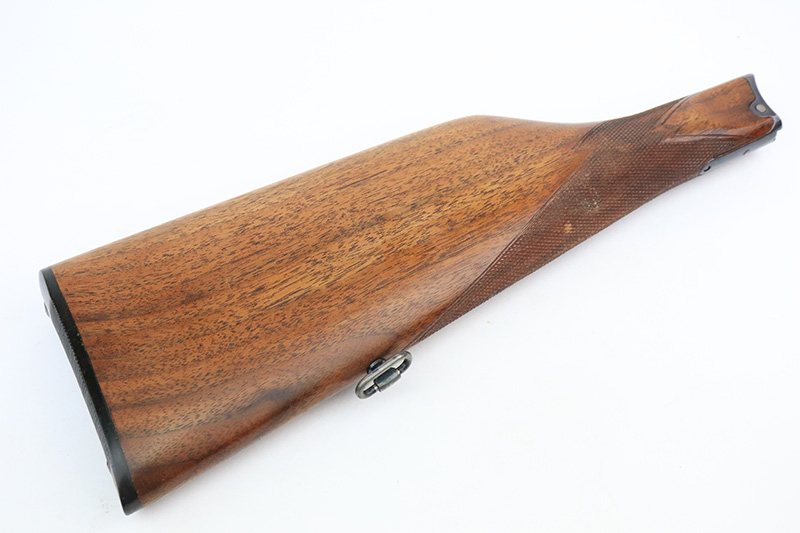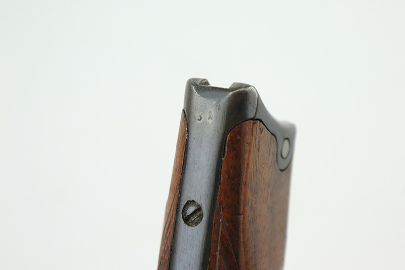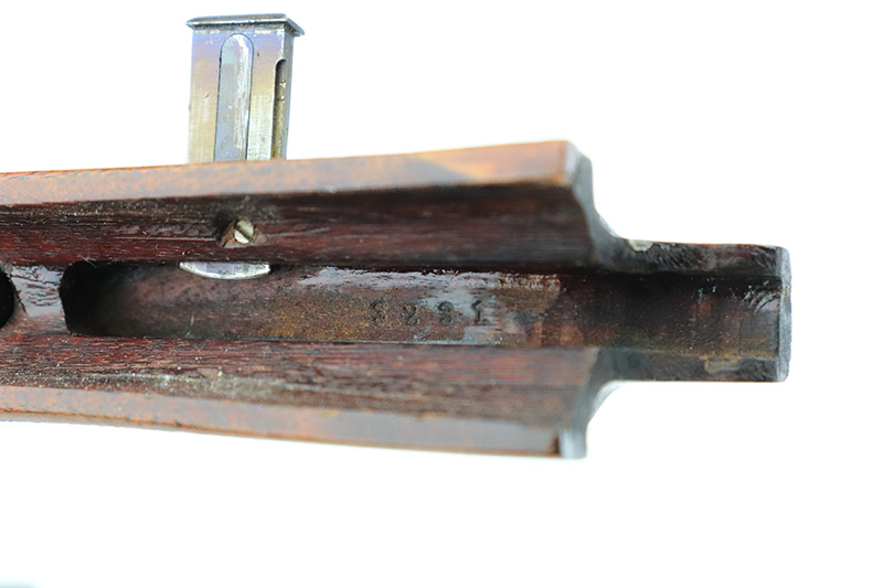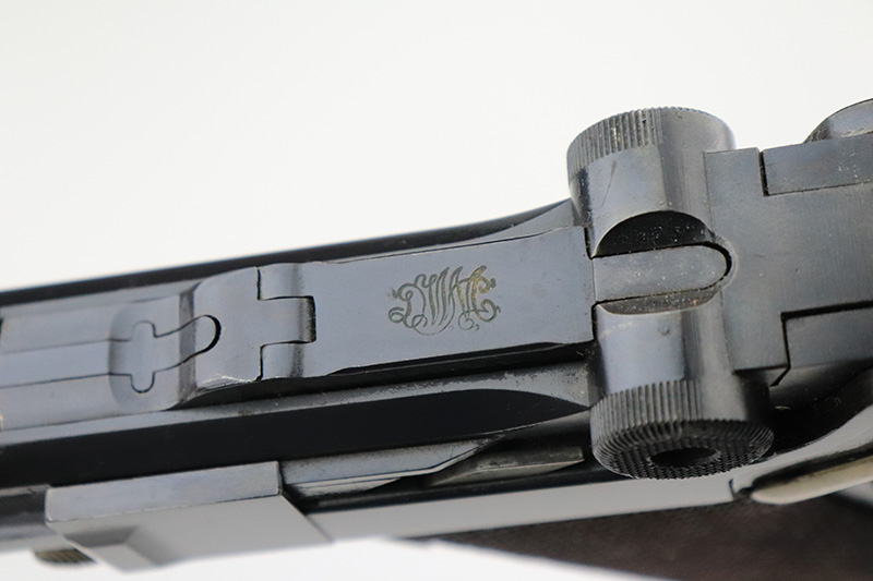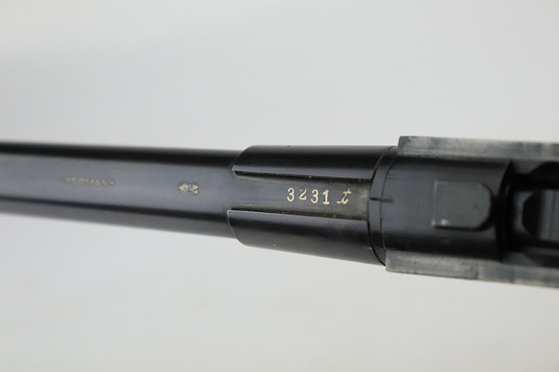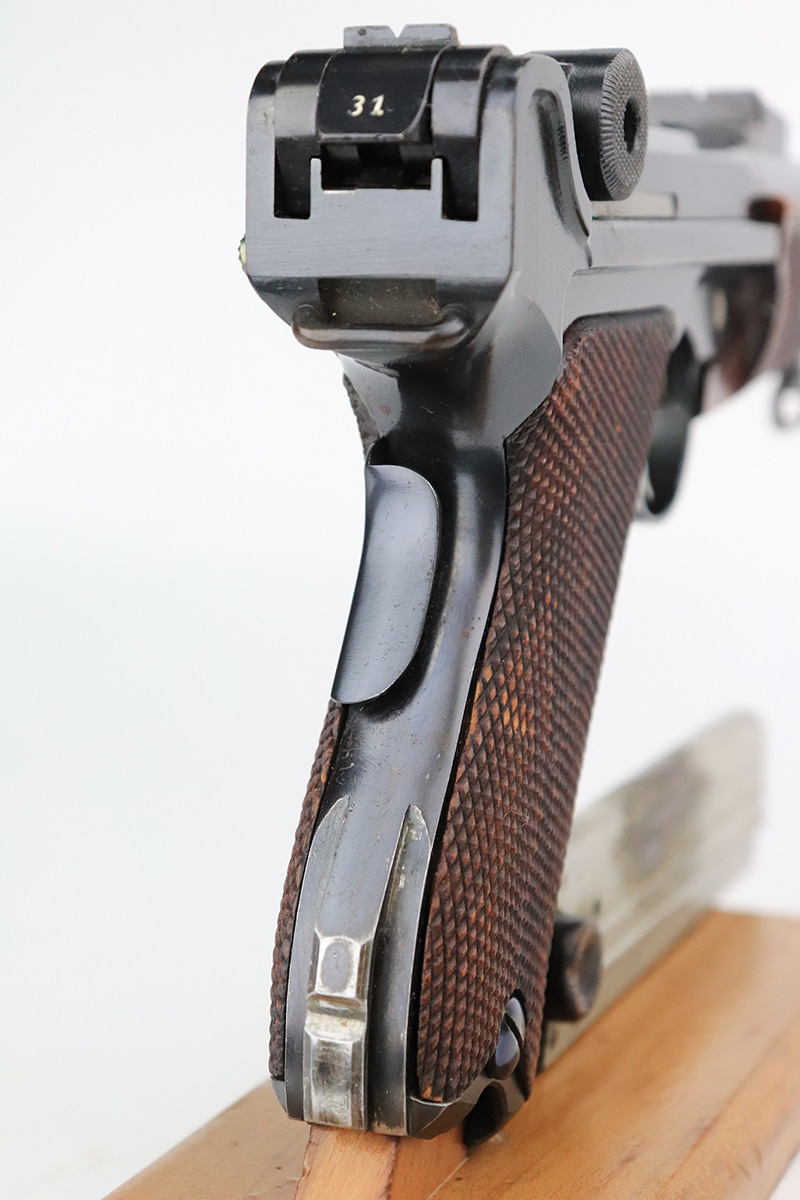 8/14/24 – This is a beautiful and interesting example of a 1920 DWM Luger Carbine rig with case and stock. These pistols were made for general commercial sales, both within Germany and abroad. This particular example is marked ‘MADE IN GERMANY’, so was originally sent to the United States. Serial numbers do match throughout, including the stock. The bluing is excellent, with only minor wear on the lug due to attaching the stock. It has a 1920-style forend with no cracks or chips. It’s fitted with wood grips in excellent condition. Mint bore. The stock is numbered on the wood and metal attachment, and matches the pistol. It’s in very good condition with no cracks and fits the stock lug correctly. The listing also includes a rare holster that fits all the items, and is in excellent condition. Robert Saltsman collection.
