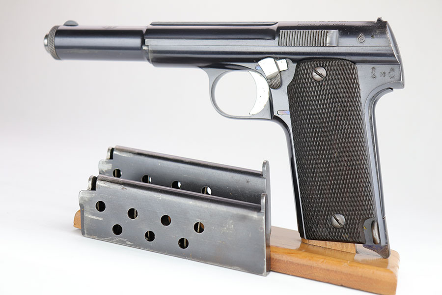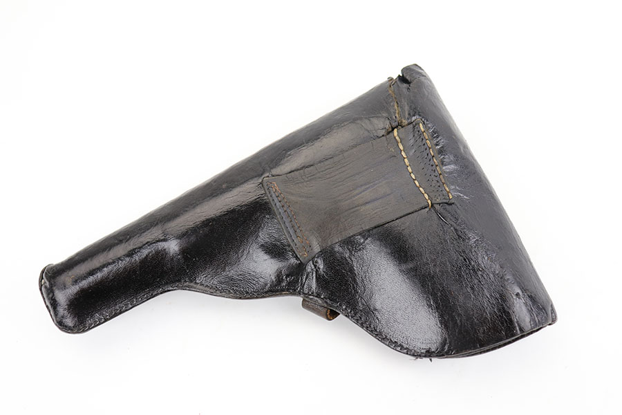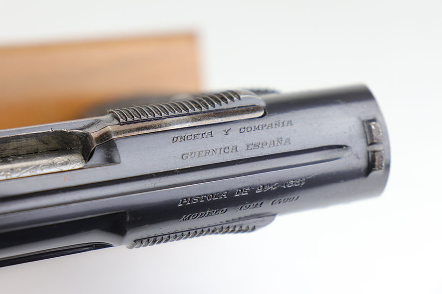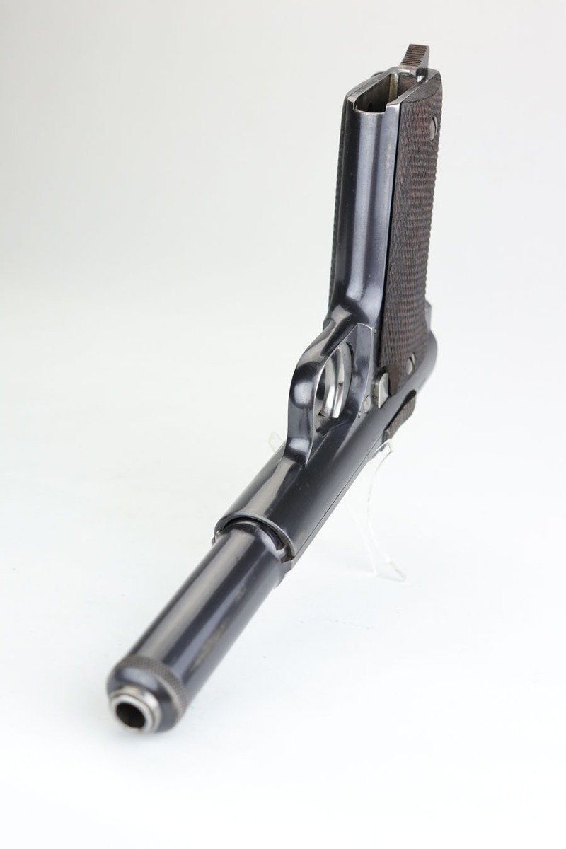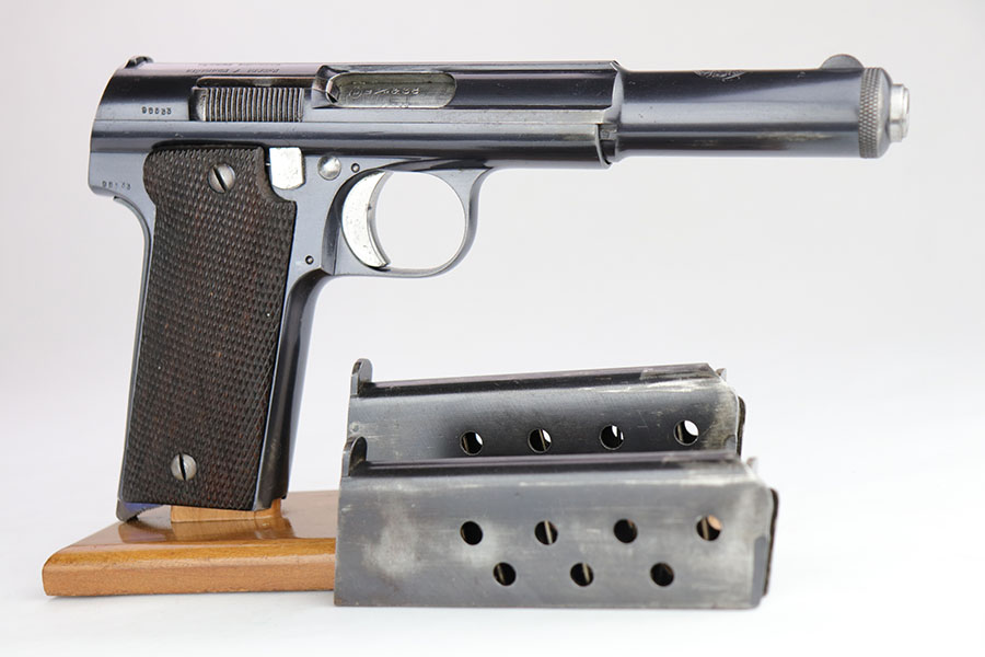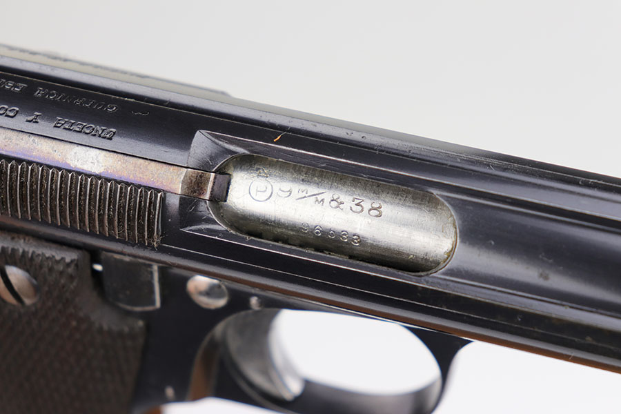3/31/20 – This is a terrific example of a rare Nazi contract pistol rig – the Spanish Astra 400. There were only ~6,000 Astra 400’s produced for the Nazi contract, all in 1941, as evidenced by the Awschalom factory letter which detailed the serial range for this contract. This pistol is fully original and correct with about 97% blue remaining. There is some standard high edge wear, as well as some edge thinning on the trigger guard and rear left portion of the slide. Rig includes two original magazines. Grips are in great shape with only minor handling wear. Rig is complete with an ersatz holster that appears to be from the time period and fits the gun well.