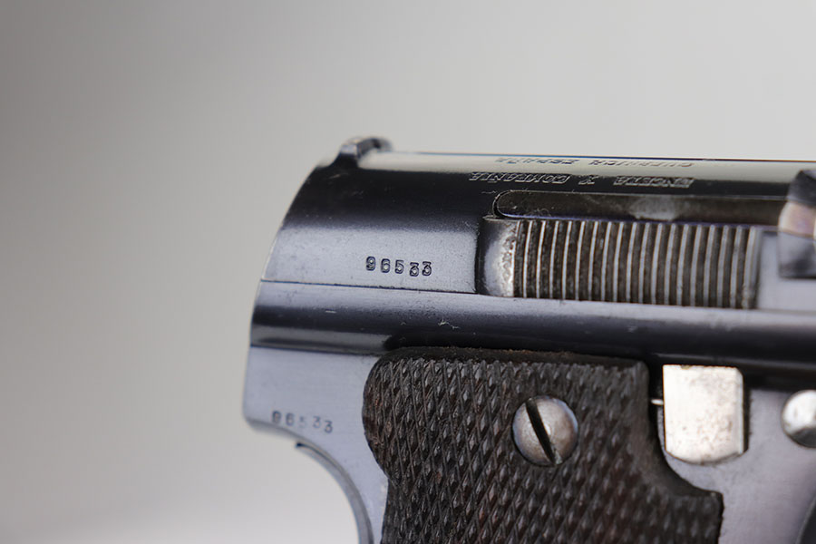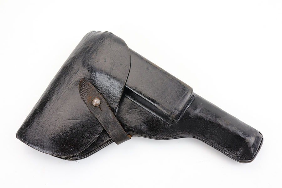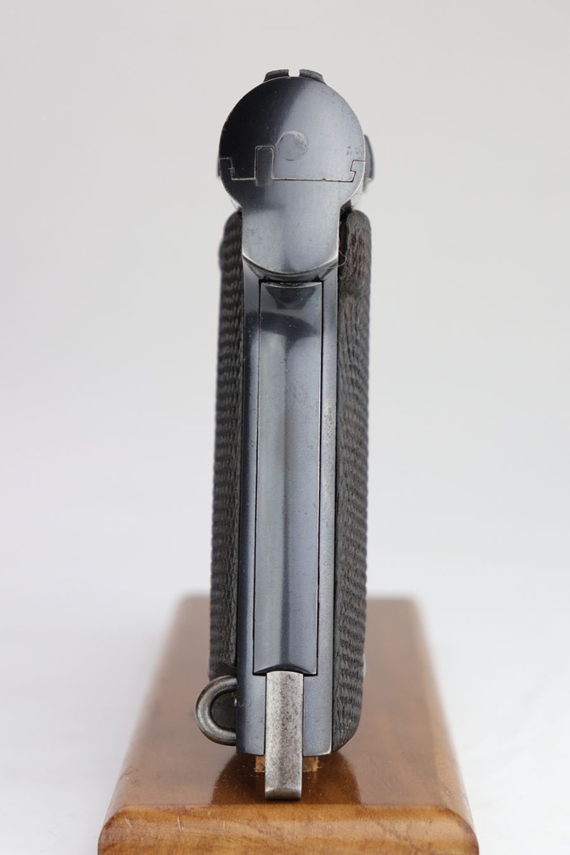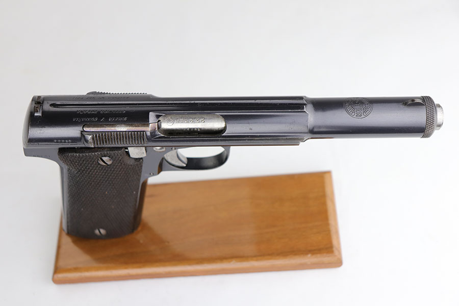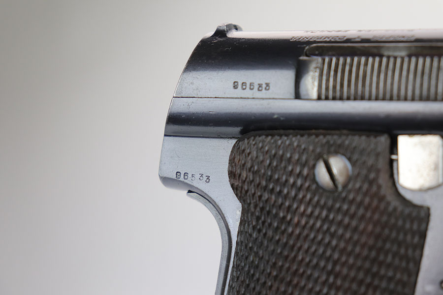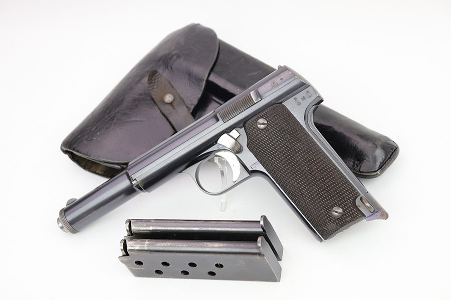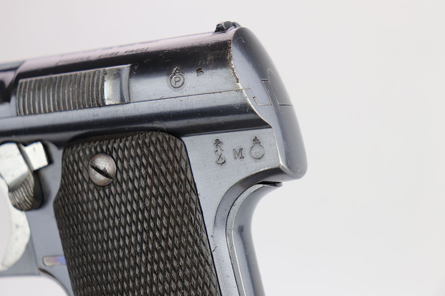 3/31/20 – This is a terrific example of a rare Nazi contract pistol rig – the Spanish Astra 400. There were only ~6,000 Astra 400’s produced for the Nazi contract, all in 1941, as evidenced by the Awschalom factory letter which detailed the serial range for this contract. This pistol is fully original and correct with about 97% blue remaining. There is some standard high edge wear, as well as some edge thinning on the trigger guard and rear left portion of the slide. Rig includes two original magazines. Grips are in great shape with only minor handling wear. Rig is complete with an ersatz holster that appears to be from the time period and fits the gun well.