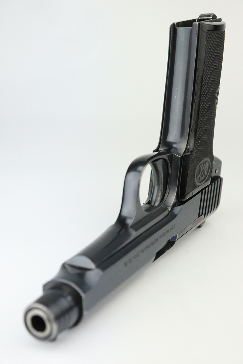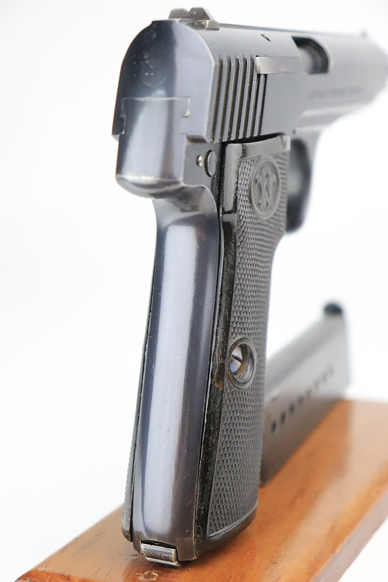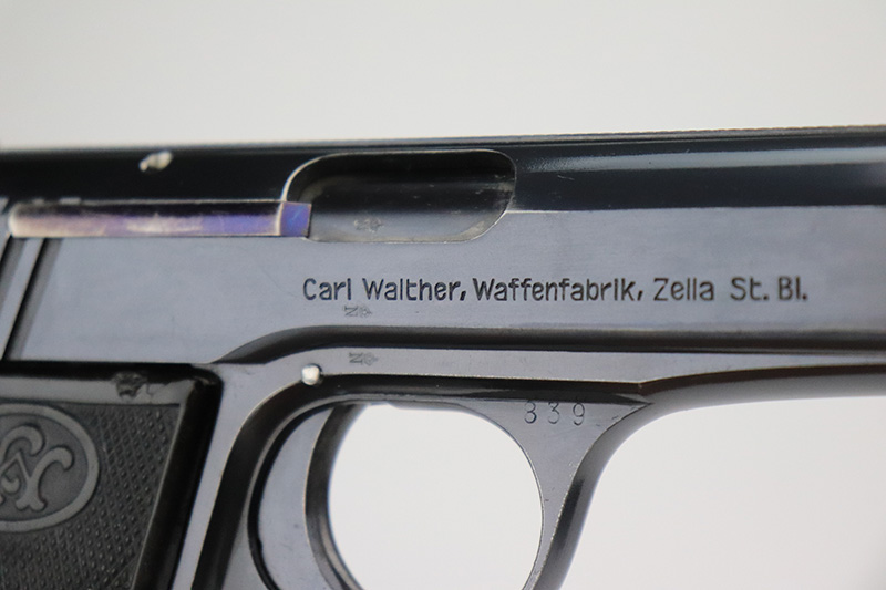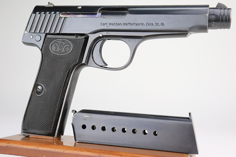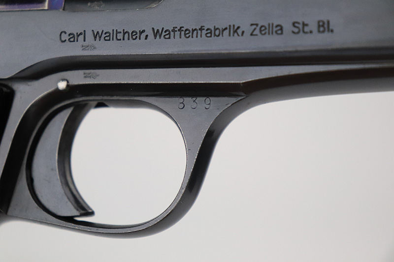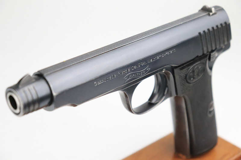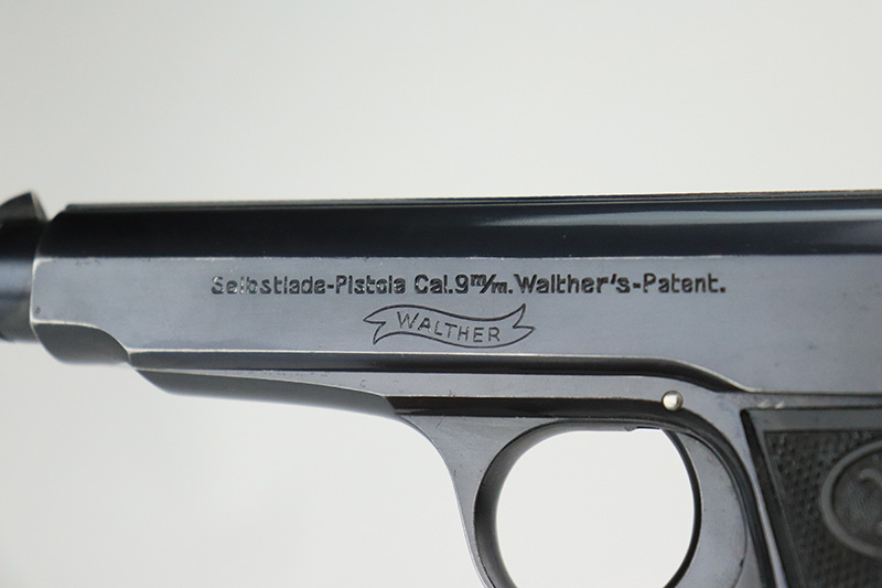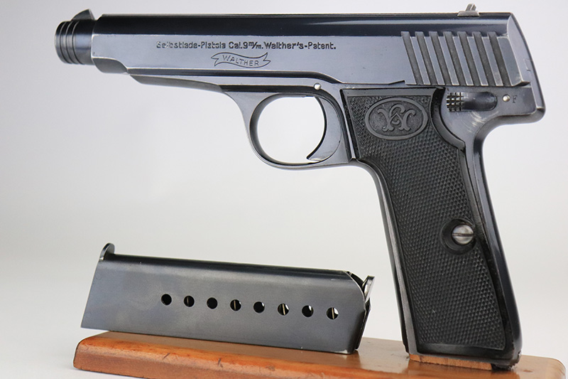 9/15/22 – This is one of the finest known examples of the super rare Walther Model 6, one of only 1,000 produced. The Model 6 was an attempt by Walther to develop a service pistol for the armed forces in the standard military caliber of 9mm Luger. The design was refused due to weak mechanics, so very few were ever military accepted. Some officers did buy their own model 6 on the commercial market, and carried them as their service pistol. This particular example is all original and has about 97% of the original blue remaining. There’s minor high edge wear, and a few small dings on the rear of the slide. The original grips have minor handling wear but no cracks. There’s a minor surface chip on the right panel. Rare, original magazine is included but may have been reblued. Bore is shiny and clean with just a little frost.