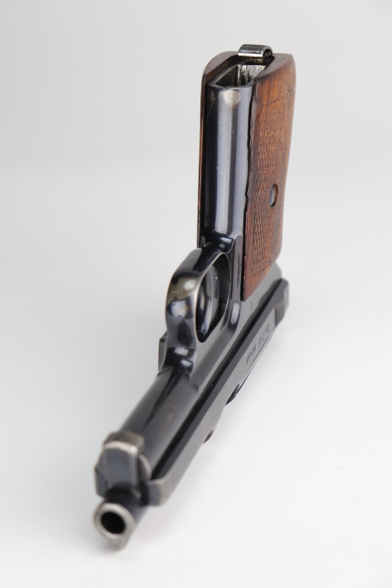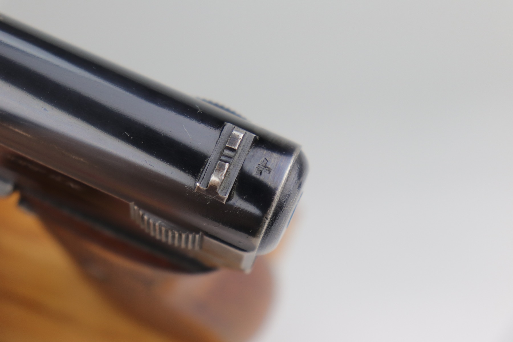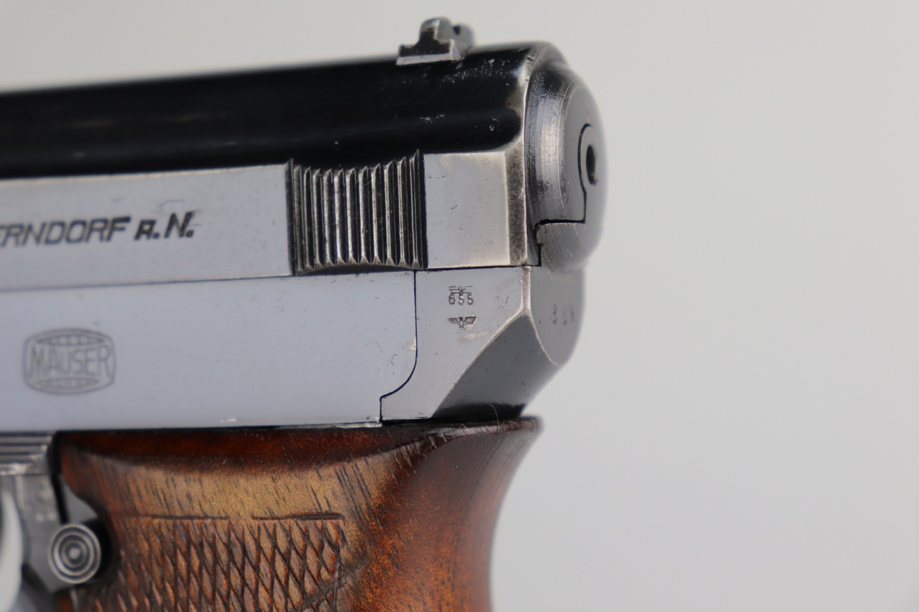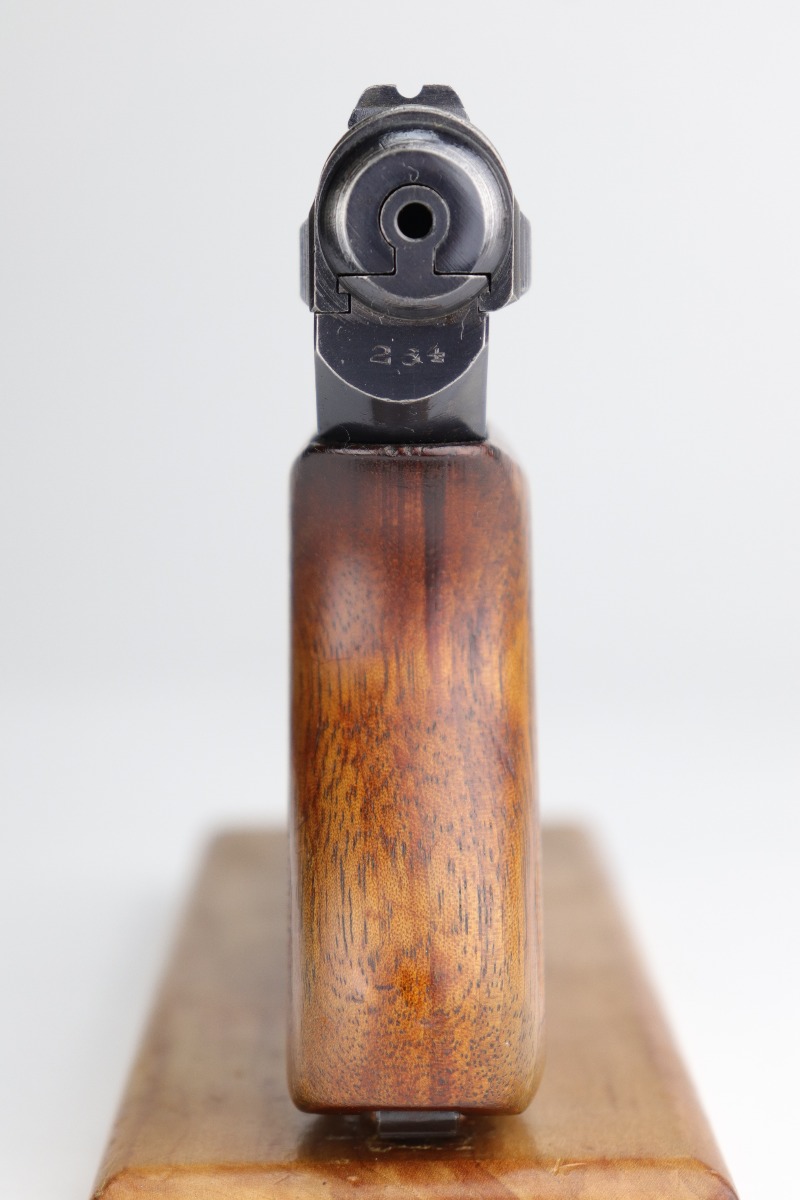 10/29/20 – This is a very nice example of a “test eagle” Mauser Model 1934 issued to the Nazi military in 1940. It is characterized by the “Eagle 655” Nazi military proof on the tang. This gun would have been produced just before the factory switched over to HSC production. These guns are fairly rare with an estimate of only ~8,000 procured by the army. The interesting thing about this pistol is that it was initially issued to the Nazi military and subsequently diverted to the police. This is evidenced by the Police “Eagle/L” marking on the right side of the frame. It also comes with a matching-numbered magazine that would have been numbered to match the gun at the police arsenal. The gun has retained about 92-93% of its bluing. There are areas of wear around the muzzle, on the right side of the slide, and on the top of the slide. There are also small spots on the front strap and underside of the trigger guard. There is light scratching on the underside of the frame. There are areas of freckling most noticeable near the muzzle. Comes with a period-correct grip with just a few light bruises and a matching magazine. The bore is excellent – shiny with strong rifling.