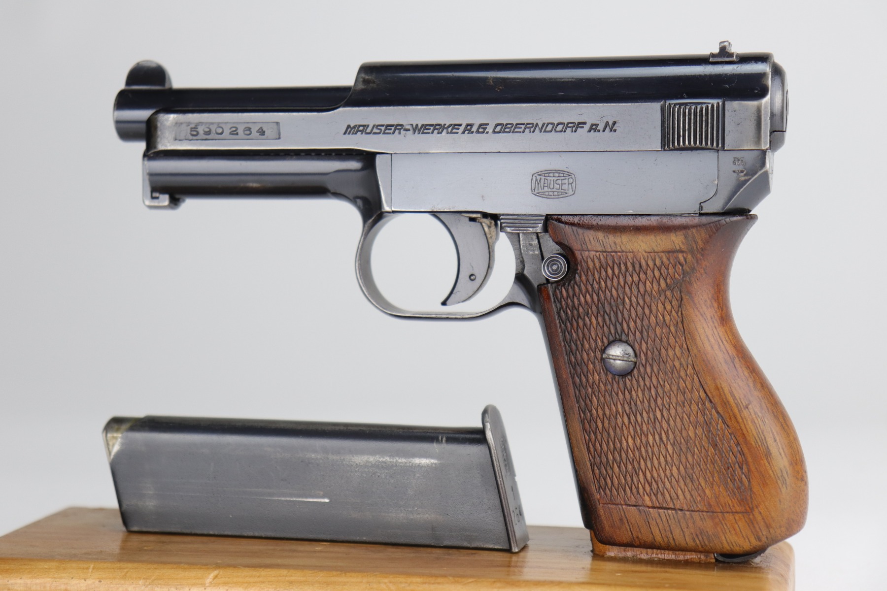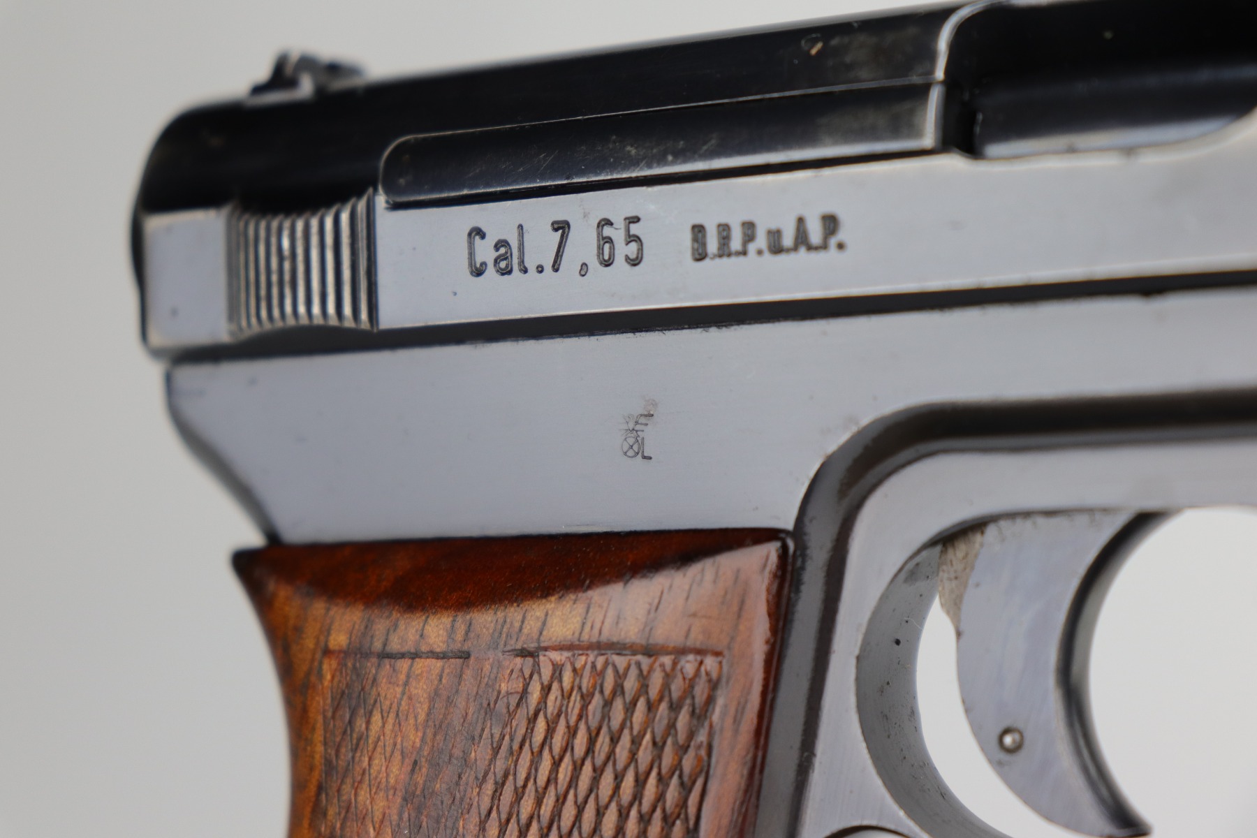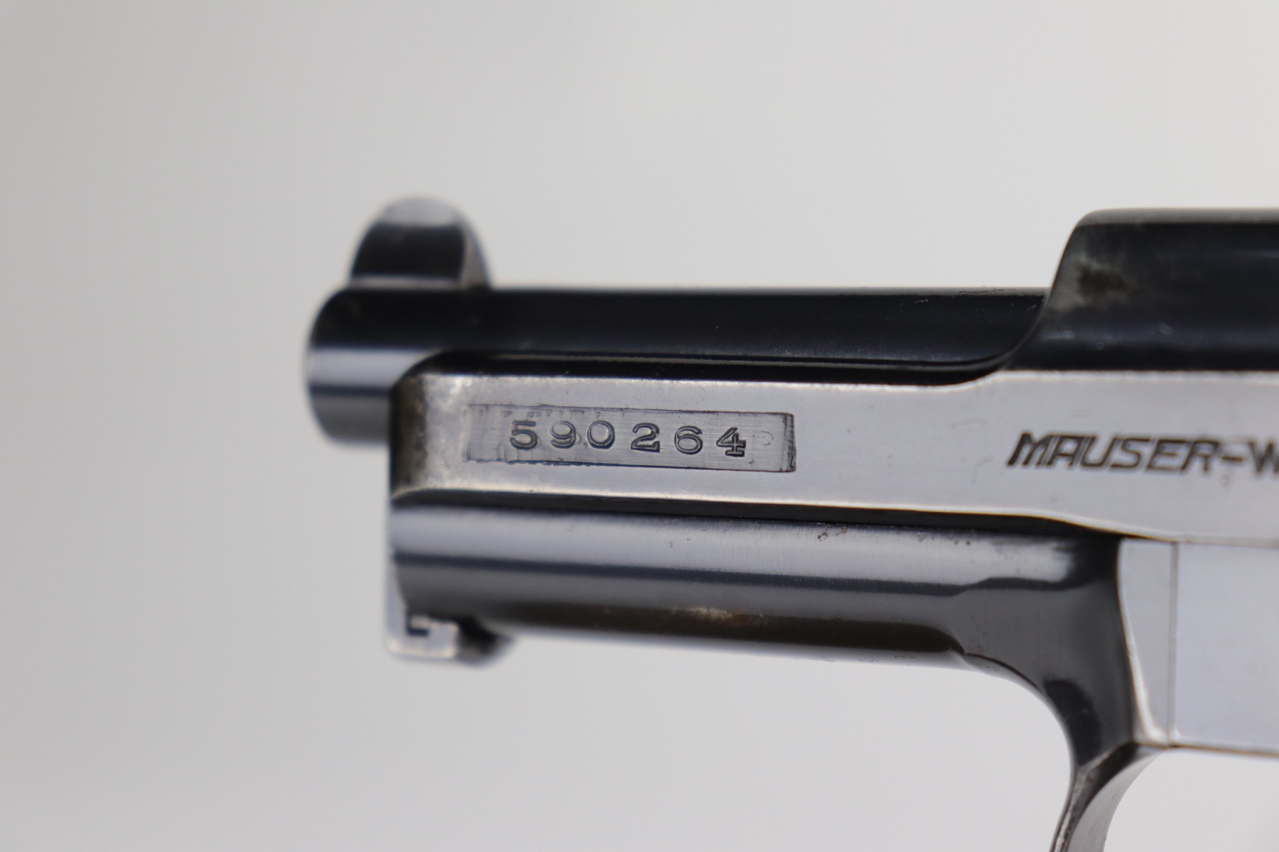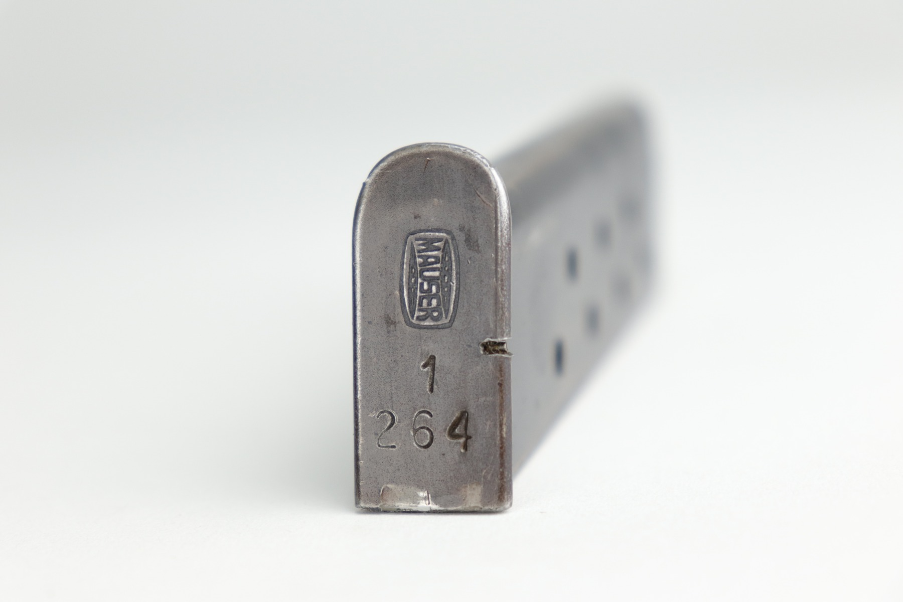 10/29/20 – This is a very nice example of a “test eagle” Mauser Model 1934 issued to the Nazi military in 1940. It is characterized by the “Eagle 655” Nazi military proof on the tang. This gun would have been produced just before the factory switched over to HSC production. These guns are fairly rare with an estimate of only ~8,000 procured by the army. The interesting thing about this pistol is that it was initially issued to the Nazi military and subsequently diverted to the police. This is evidenced by the Police “Eagle/L” marking on the right side of the frame. It also comes with a matching-numbered magazine that would have been numbered to match the gun at the police arsenal. The gun has retained about 92-93% of its bluing. There are areas of wear around the muzzle, on the right side of the slide, and on the top of the slide. There are also small spots on the front strap and underside of the trigger guard. There is light scratching on the underside of the frame. There are areas of freckling most noticeable near the muzzle. Comes with a period-correct grip with just a few light bruises and a matching magazine. The bore is excellent – shiny with strong rifling.