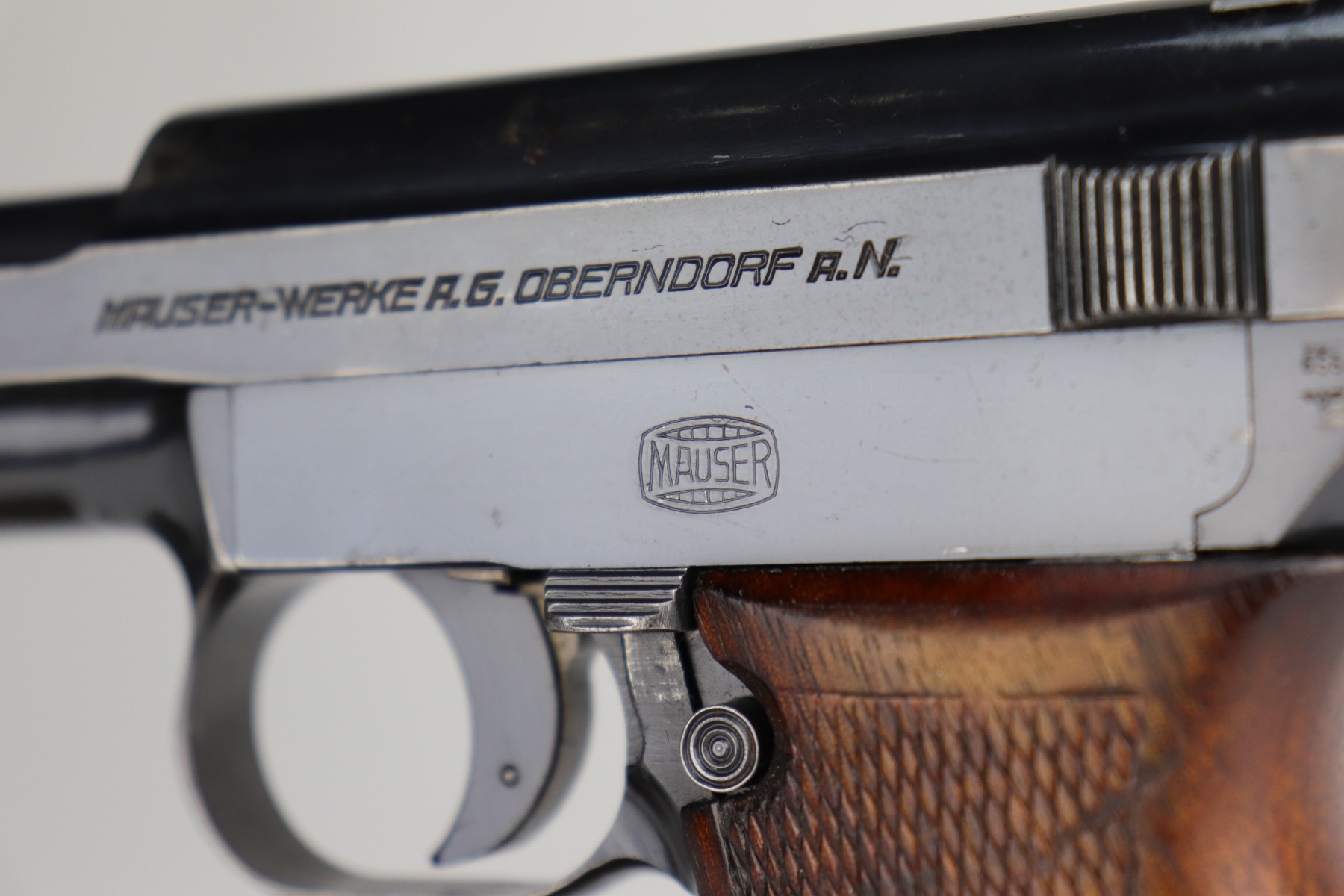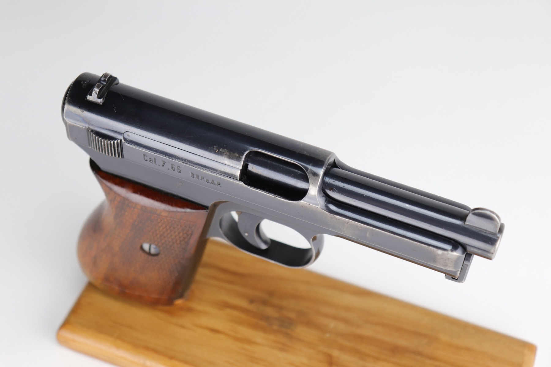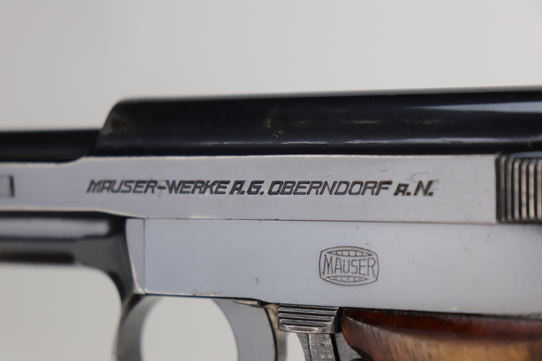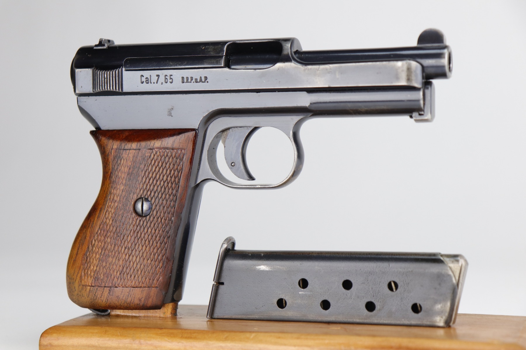 10/29/20 – This is a very nice example of a “test eagle” Mauser Model 1934 issued to the Nazi military in 1940. It is characterized by the “Eagle 655” Nazi military proof on the tang. This gun would have been produced just before the factory switched over to HSC production. These guns are fairly rare with an estimate of only ~8,000 procured by the army. The interesting thing about this pistol is that it was initially issued to the Nazi military and subsequently diverted to the police. This is evidenced by the Police “Eagle/L” marking on the right side of the frame. It also comes with a matching-numbered magazine that would have been numbered to match the gun at the police arsenal. The gun has retained about 92-93% of its bluing. There are areas of wear around the muzzle, on the right side of the slide, and on the top of the slide. There are also small spots on the front strap and underside of the trigger guard. There is light scratching on the underside of the frame. There are areas of freckling most noticeable near the muzzle. Comes with a period-correct grip with just a few light bruises and a matching magazine. The bore is excellent – shiny with strong rifling.