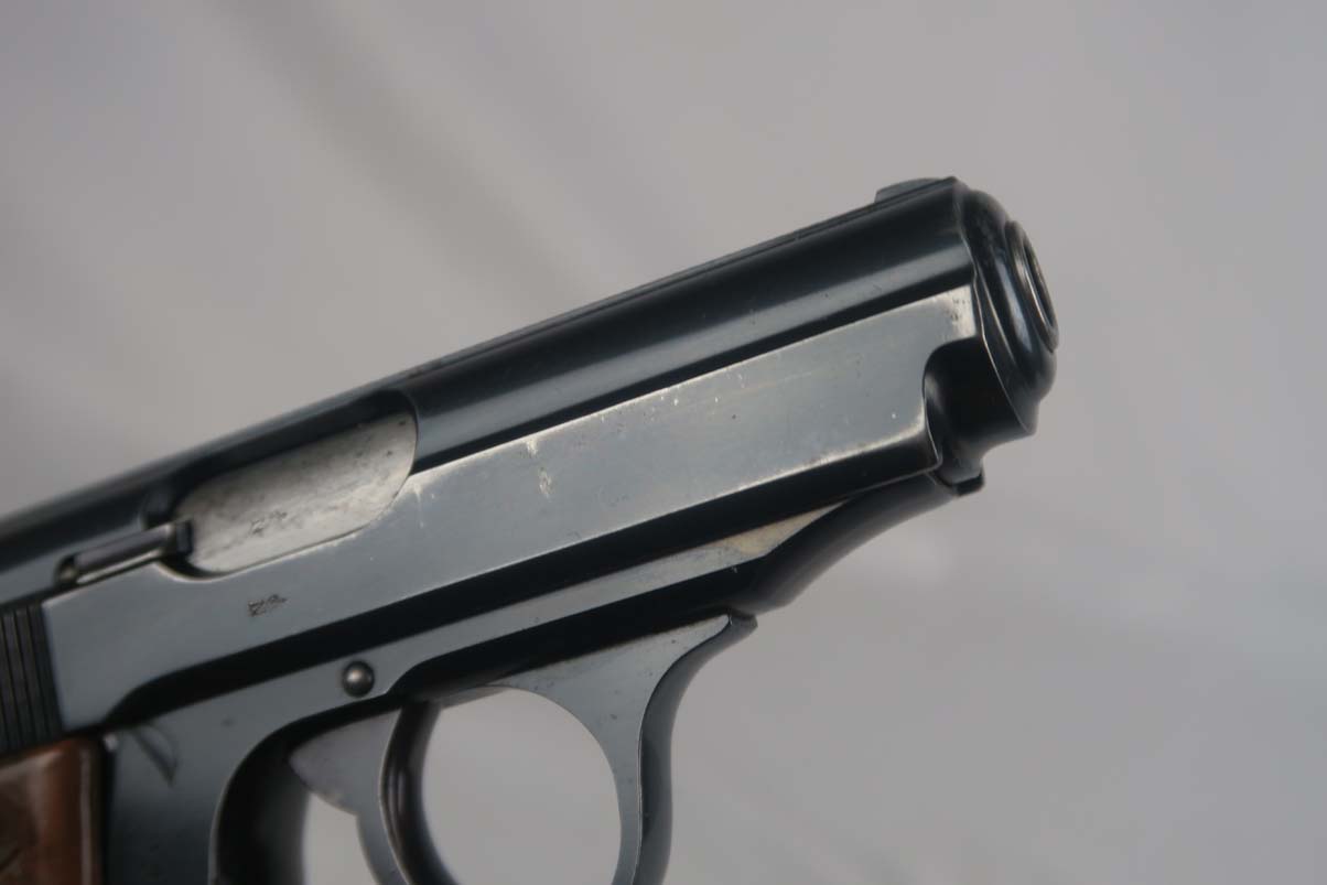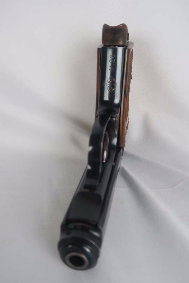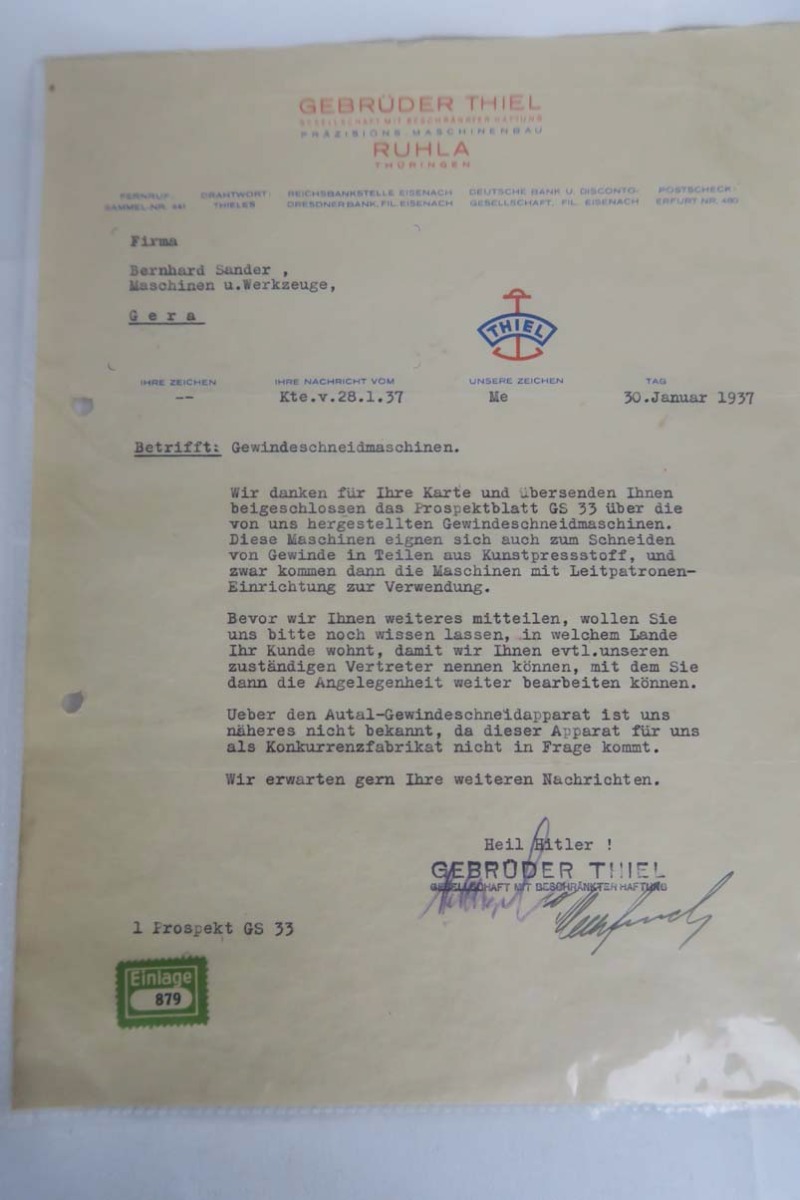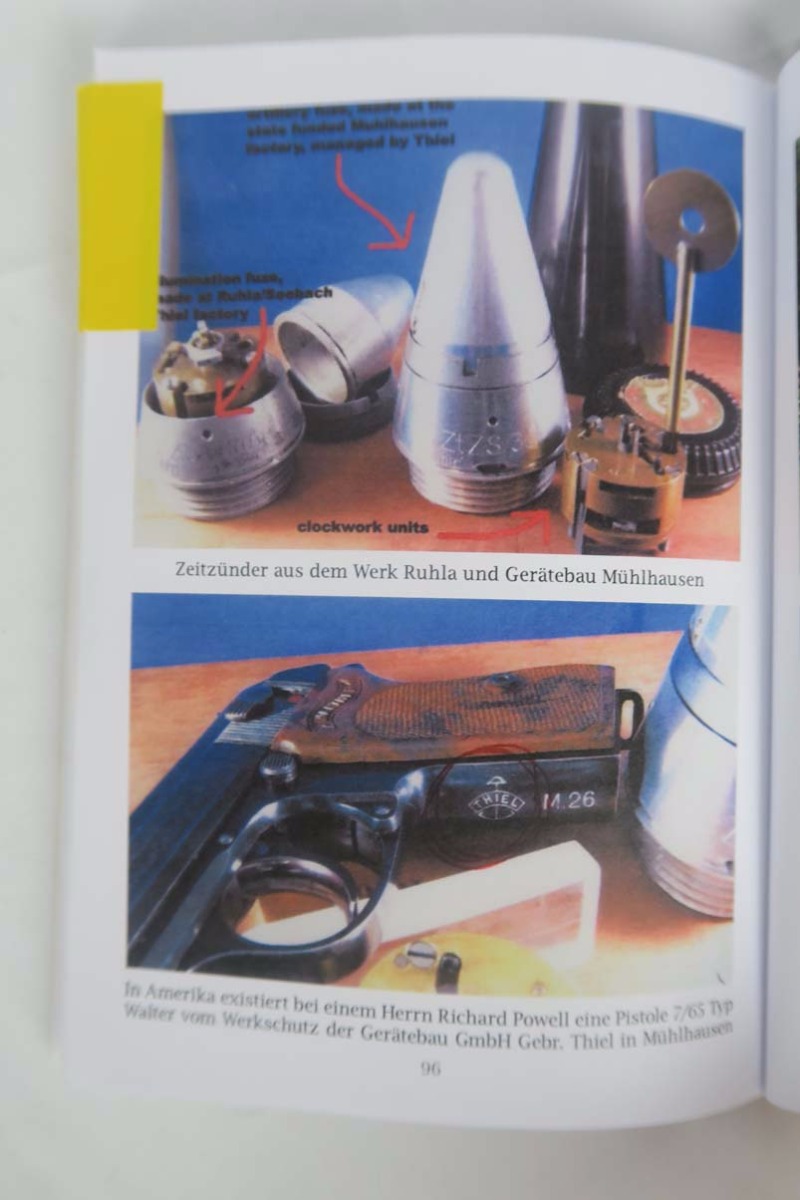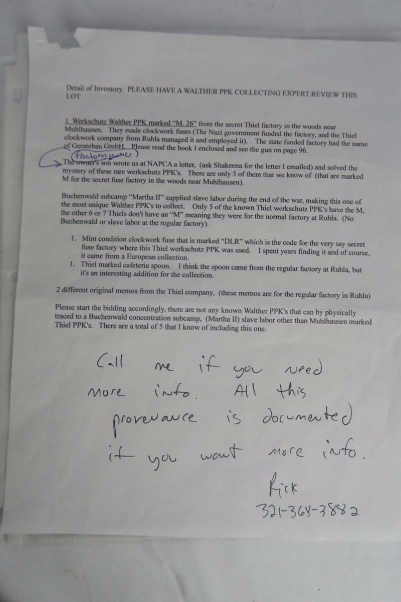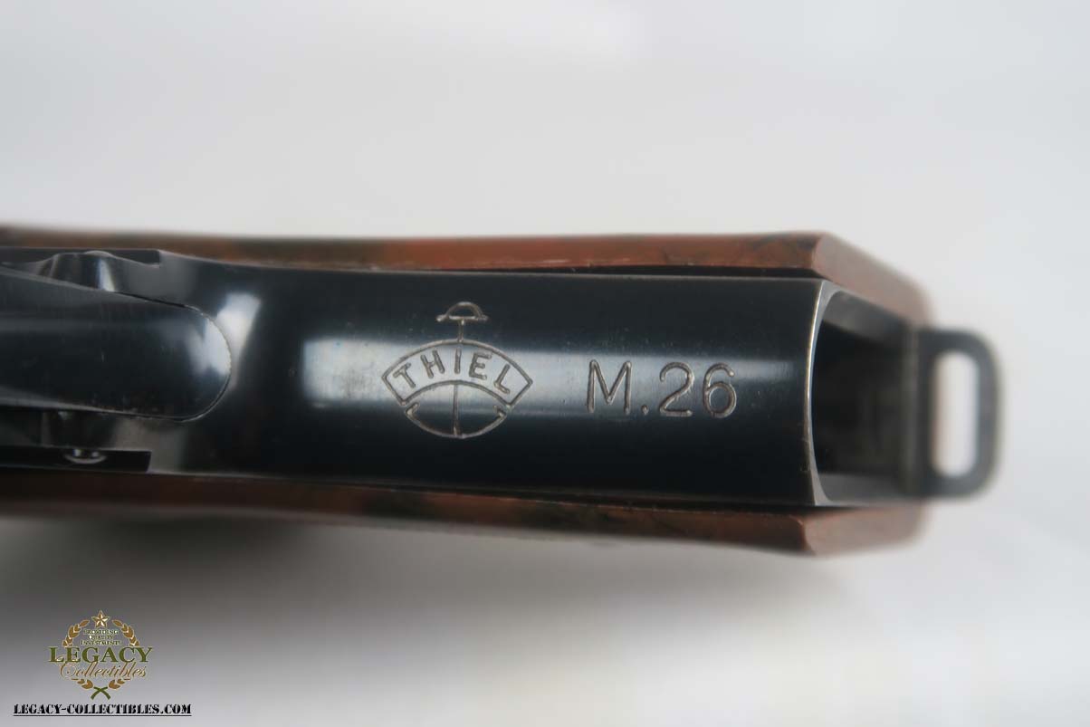 3/24/17 – This is a rare Thiel marked Walther PPK from World War II. We have offered one of these before but never with the “M” mark or with an actual Thiel fuse and documents! This Thiel PPk is marked “M.26” and is from the secret Thiel factory in the woods near Muhlhausen. They made clockwork fuses (The Nazi government funded the factory, and the Thiel clockwork company from Ruhla managed it). The state funded factory had the name of Geratebau GmbH. We have included a book with more information. This grouping has two original documents that are in German and dated 1937 and 1939. See attached photos for more information. The pistols finish is about 95-96% and it is all matching.  Near mint bore.  Very cool grouping!