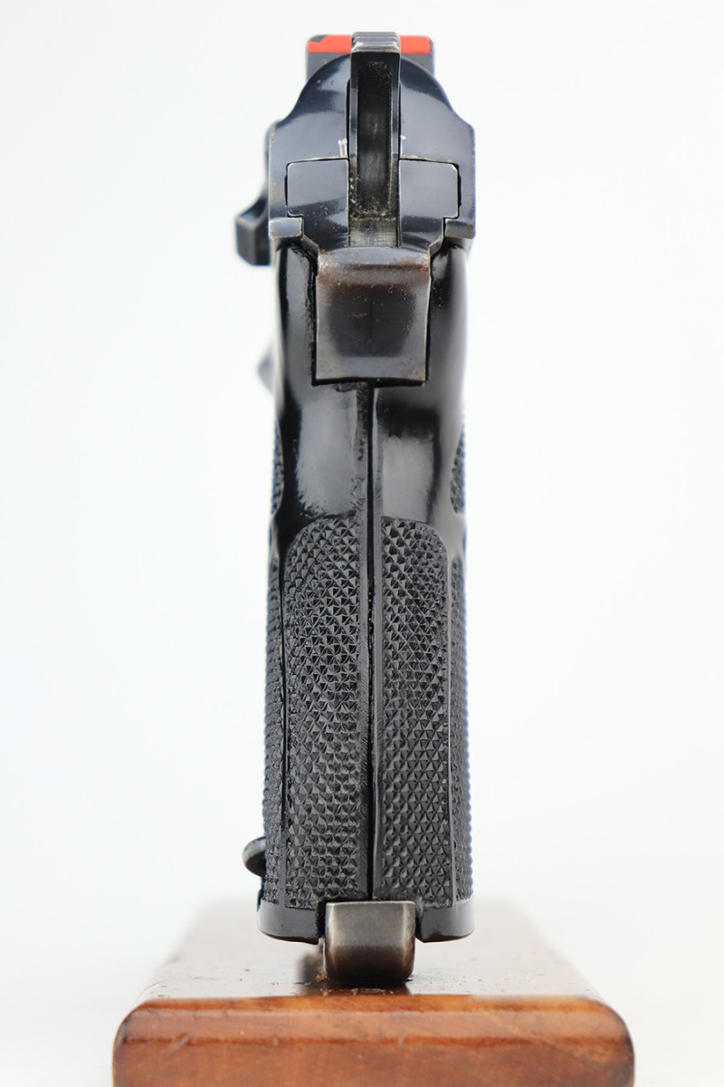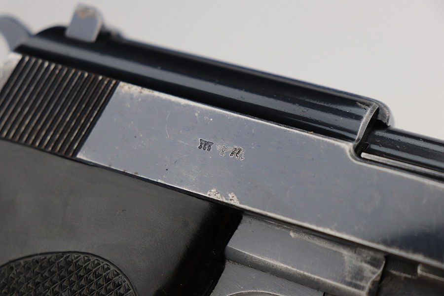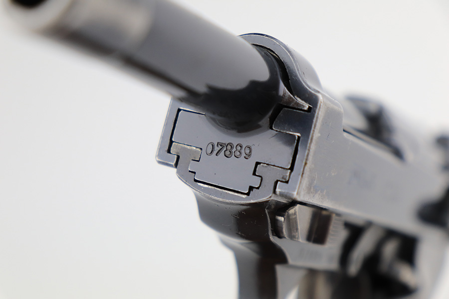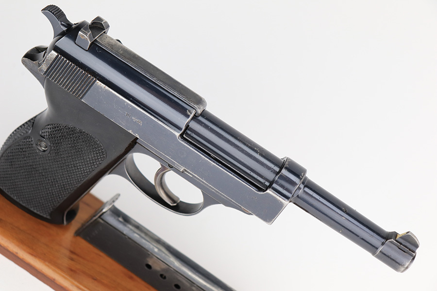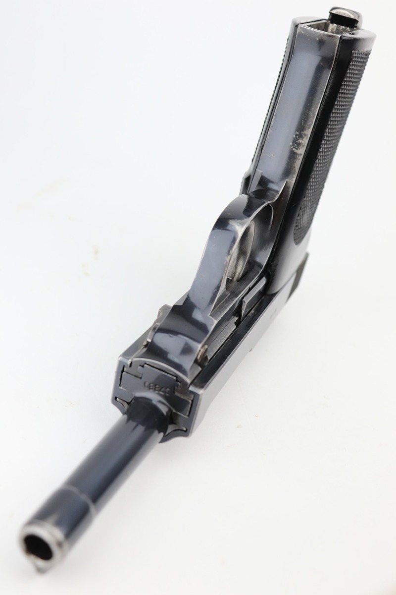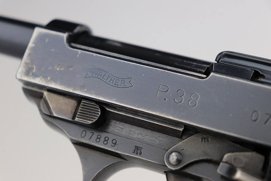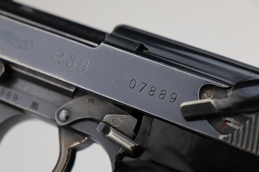7/5/23 – This is a very nice example of a rare third-variation “Zero Series” Walther P.38 issued to the Nazi military in 1940. It is all matching and has the proper “Eagle 359” military acceptance proofs throughout, even on the small parts. The grips are waffen-proofed but not numbered. Comes with one original matching-numbered magazine. The gun itself has retained somewhere between 85-90% of its original high polish finish. Generally, there is muzzle wear and light, somewhat spotty wear on the front strap and on the slide, concentrated mostly around the high edges. Some finish loss on the top plate as well. Excellent, shiny bore with strong rifling. De-cocker is functional.