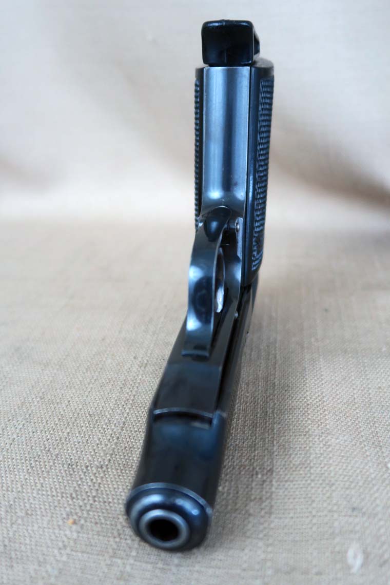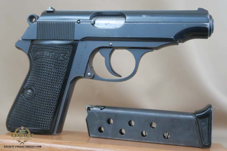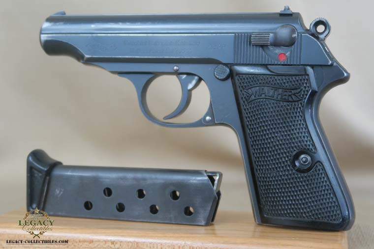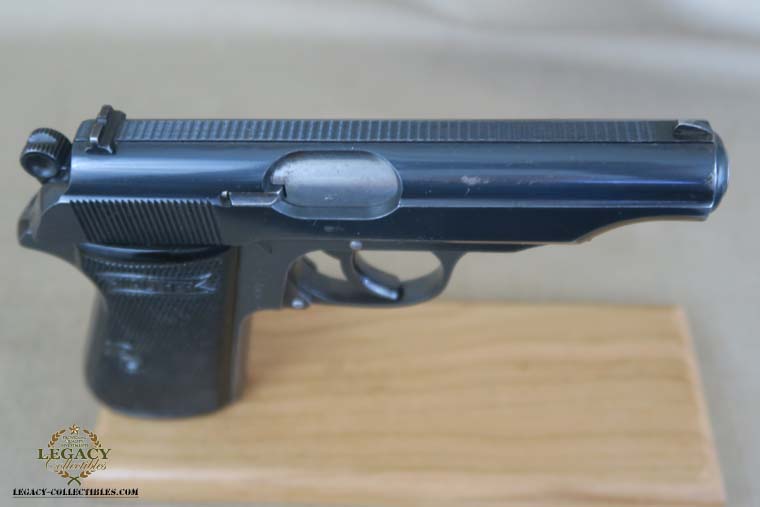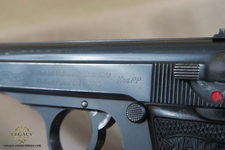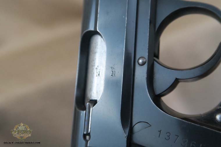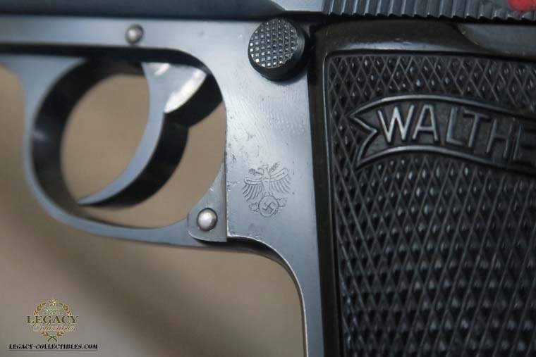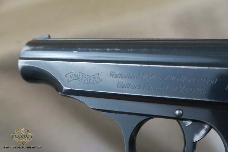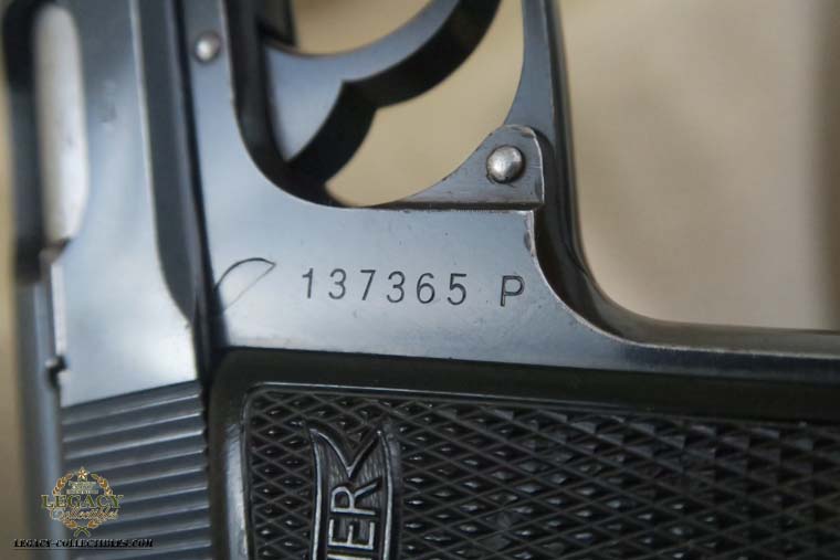 4/21/16 – This is a very rare Tirolean PP from 1938. These were shooter prize pistols from the Tirolean region of Austria. It has the Tirolean (Austrian) Eagle with a swastika stamped on the left of the frame. This variation is mentioned in Whittingtons Book Volume II on page 283, and this one is in the correct serial range. The original finish is about 94-95% with wear on the muzzle and slide. All parts are matching and it has a mirror bore. Correct finger extension magazine. It also comes with a Tirolean pin. Guaranteed correct!
