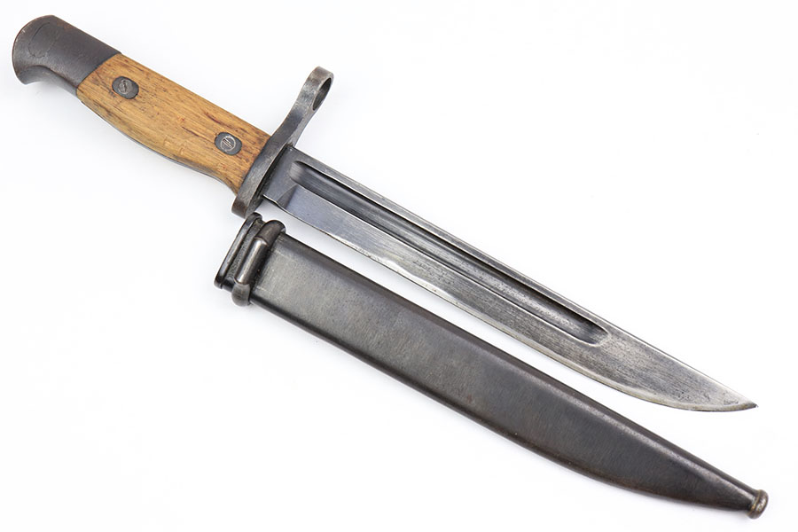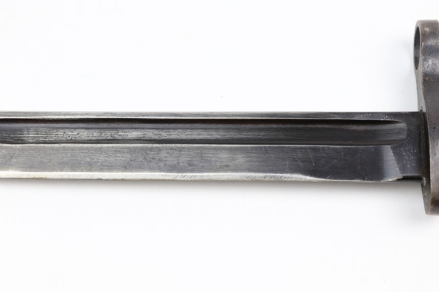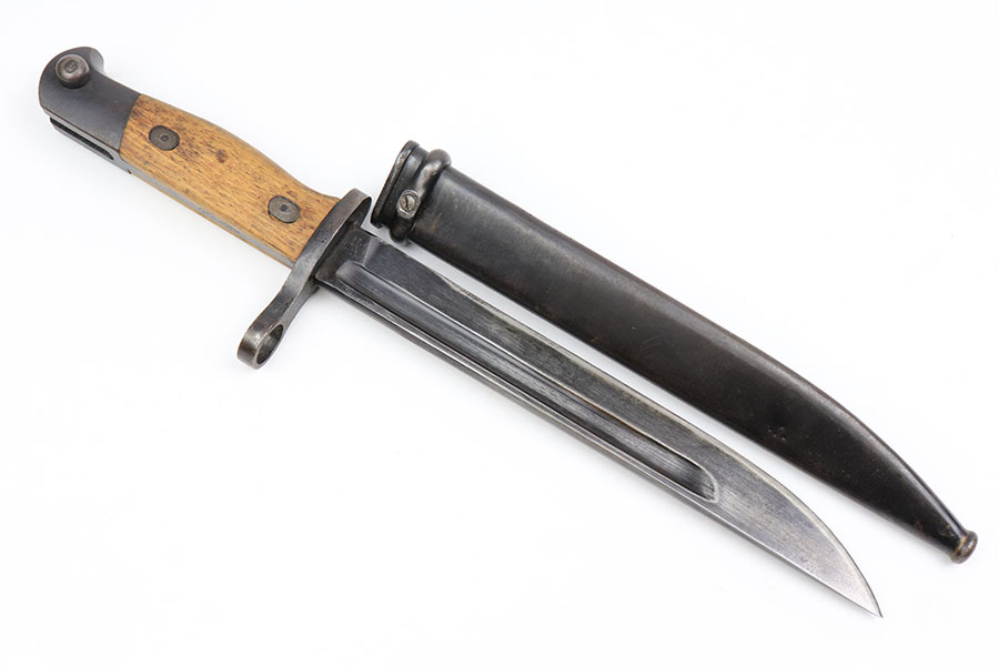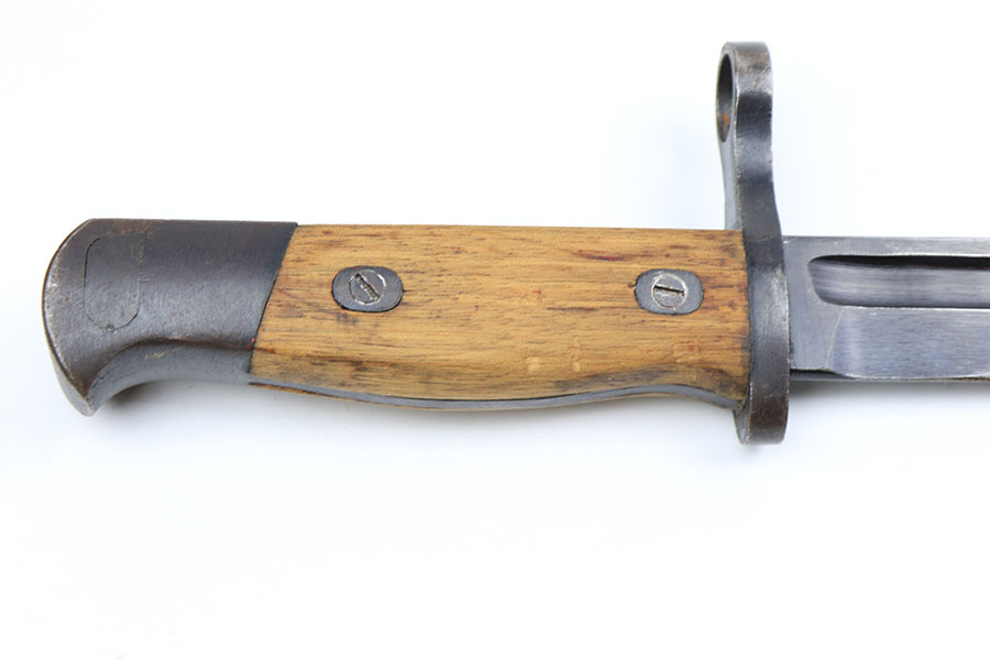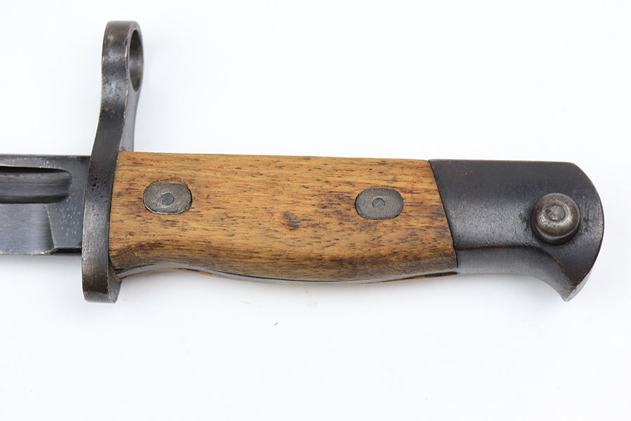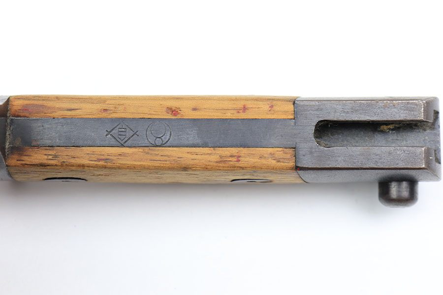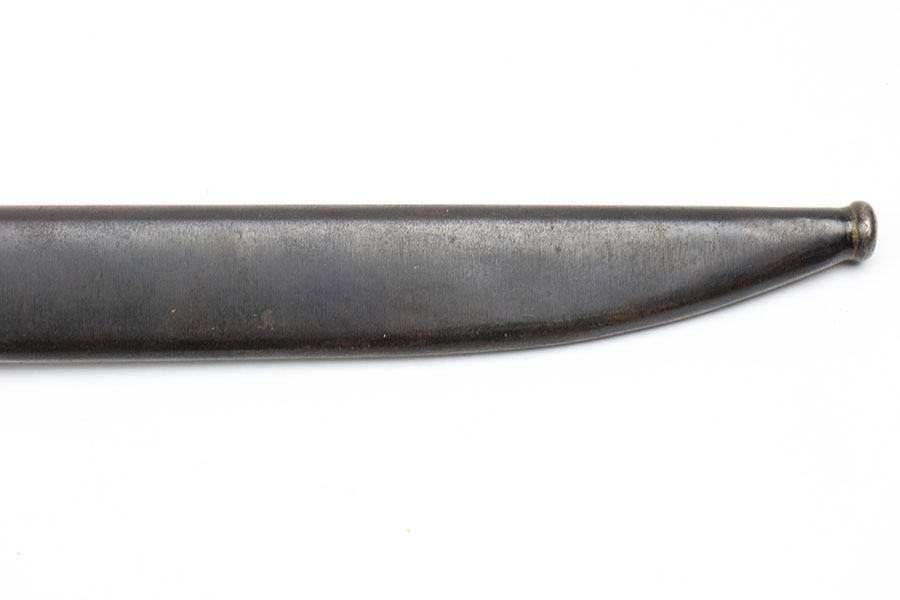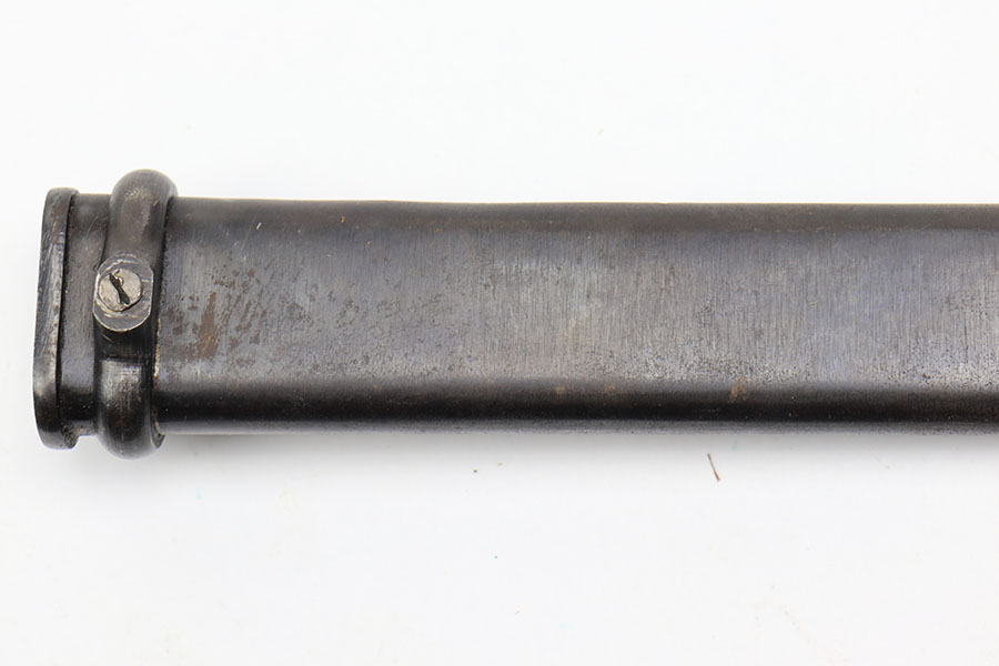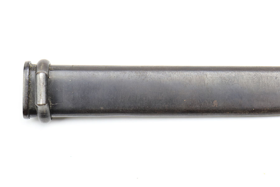 1/28/21 – This is an excellent condition, extremely scarce WW2 Japanese Army paratrooper bayonet. Made by Toyoda Automatic Loom Works under Nagoya Arsenal supervision. This is stamped on the spine of the handle. The bayonet was issued for use with the Type 100 Submachine Gun, and the Type 100 Paratrooper Rifle. The bayonet blade shows light sharpening near the edge, but most of the original finish is still in tact. The scabbard has one small dent but has excellent finish throughout.