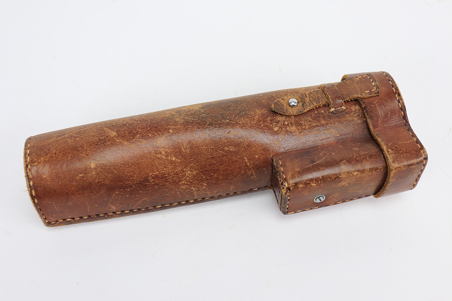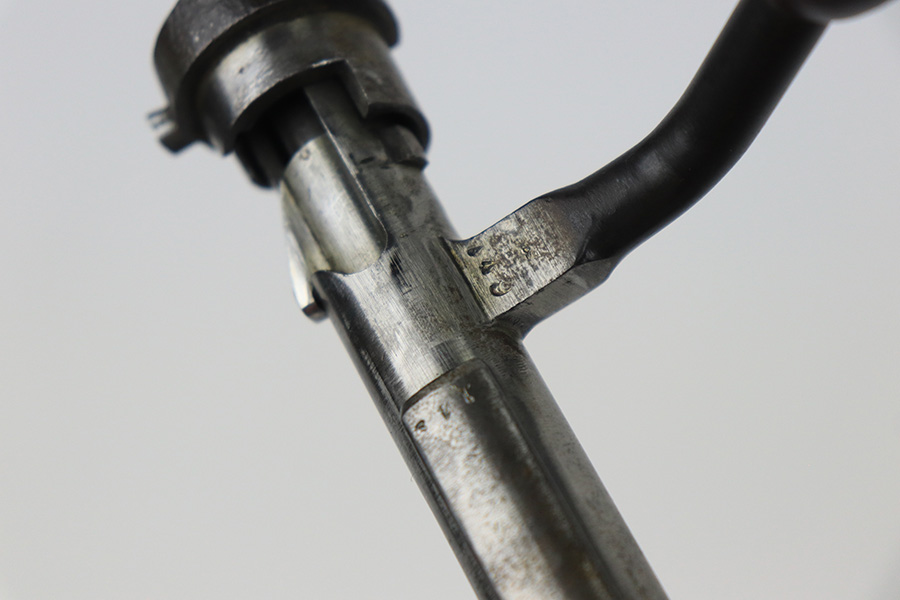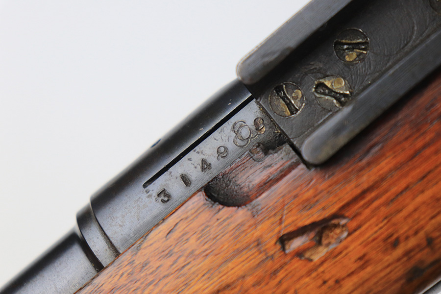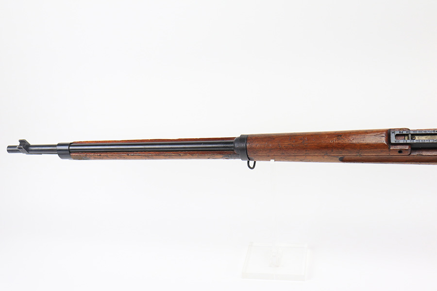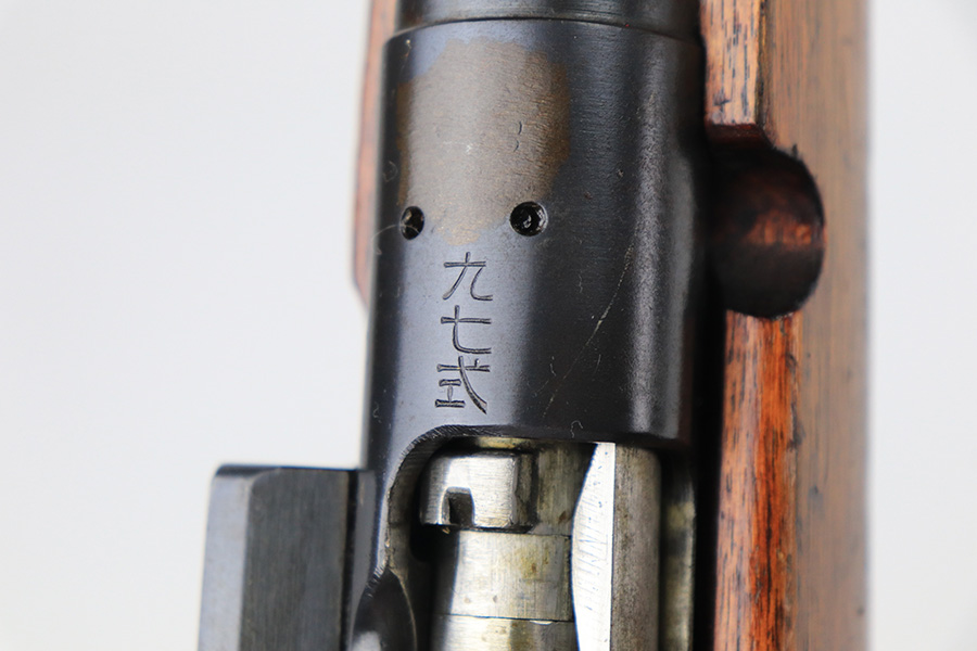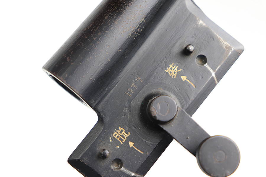 12/22/21 – This is an early example of a rare Arisaka Type 97 sniper rifle that was made at the Kokura Arsenal. Kokura Arsenal made only ~8,000 Type 97 sniper rifles, all from 1937-39, compared to the nearly 15,000 Nagoya Arsenal made from 1938-45. These were based on the Type 38 rifle, and when fired, the mild 6.5x50mm Arisaka cartridge gave off little flash or smoke and made counter-sniper activity difficult. This particular rifle is all matching numbers throughout, including the bolt assembly. The bluing on the rifle is in great shape overall aside from the ground mum area, and the standard wear you’d expect to find on the buttplate. The stock has seen better days, unfortunately, as there’s a notable chip on the underside and a surface crack on the left side. The rifle does come with the rare and correct 2.5×10 sniper scope, as well as the early leather scope case. The scope has a mismatched serial number is a rare and correct Kokura example. Clear optics, though one of the internal pieces of glass does have a minor defect that doesn’t affect the sight picture. The rare leather case is in excellent condition and the Kanji markings under the lid indicate the case was made in 1938, the same year as our rifle. Rifle bore is generally clean and shiny throughout with good rifling, but has a little bit of frost.