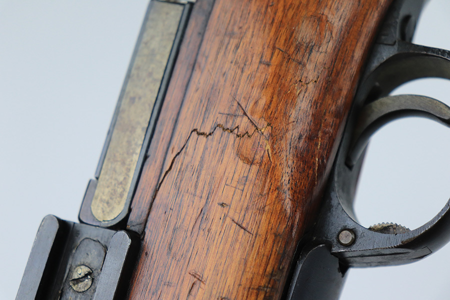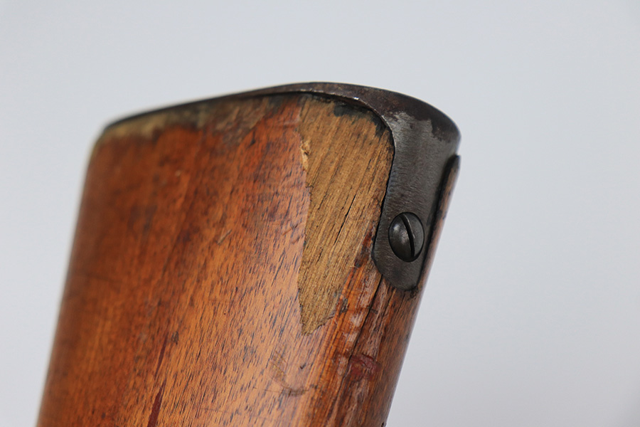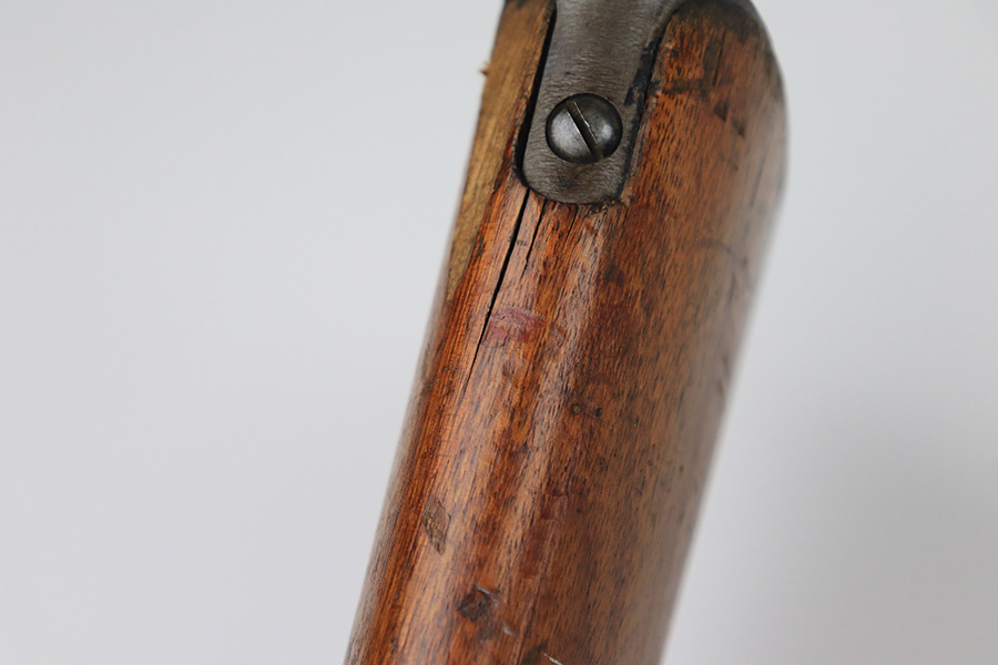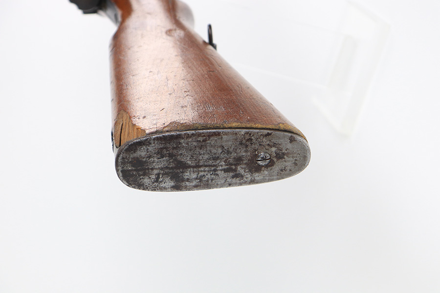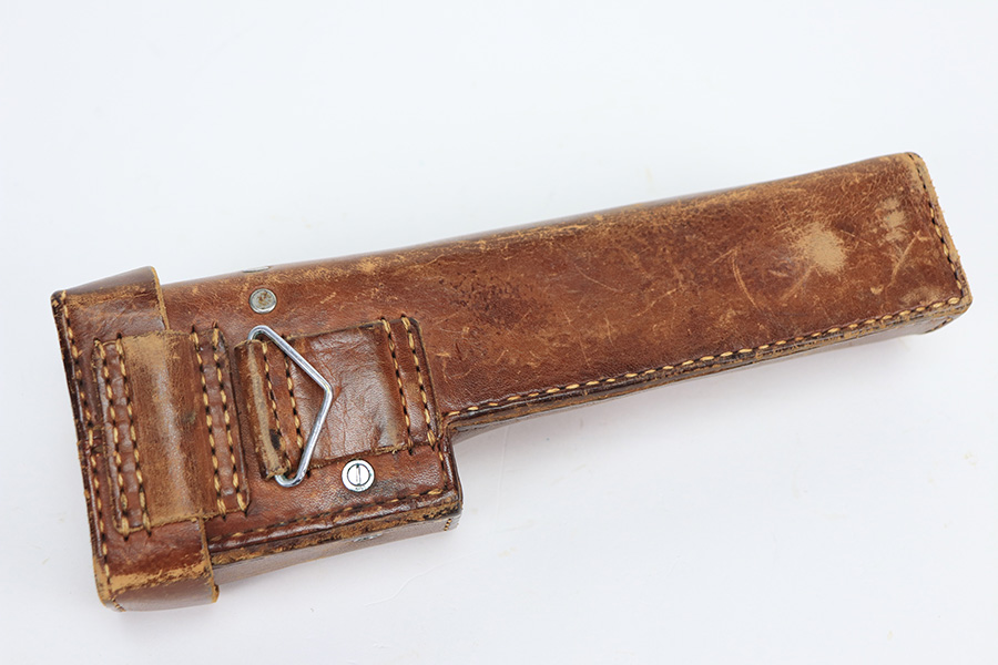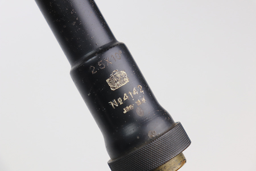 12/22/21 – This is an early example of a rare Arisaka Type 97 sniper rifle that was made at the Kokura Arsenal. Kokura Arsenal made only ~8,000 Type 97 sniper rifles, all from 1937-39, compared to the nearly 15,000 Nagoya Arsenal made from 1938-45. These were based on the Type 38 rifle, and when fired, the mild 6.5x50mm Arisaka cartridge gave off little flash or smoke and made counter-sniper activity difficult. This particular rifle is all matching numbers throughout, including the bolt assembly. The bluing on the rifle is in great shape overall aside from the ground mum area, and the standard wear you’d expect to find on the buttplate. The stock has seen better days, unfortunately, as there’s a notable chip on the underside and a surface crack on the left side. The rifle does come with the rare and correct 2.5×10 sniper scope, as well as the early leather scope case. The scope has a mismatched serial number is a rare and correct Kokura example. Clear optics, though one of the internal pieces of glass does have a minor defect that doesn’t affect the sight picture. The rare leather case is in excellent condition and the Kanji markings under the lid indicate the case was made in 1938, the same year as our rifle. Rifle bore is generally clean and shiny throughout with good rifling, but has a little bit of frost.