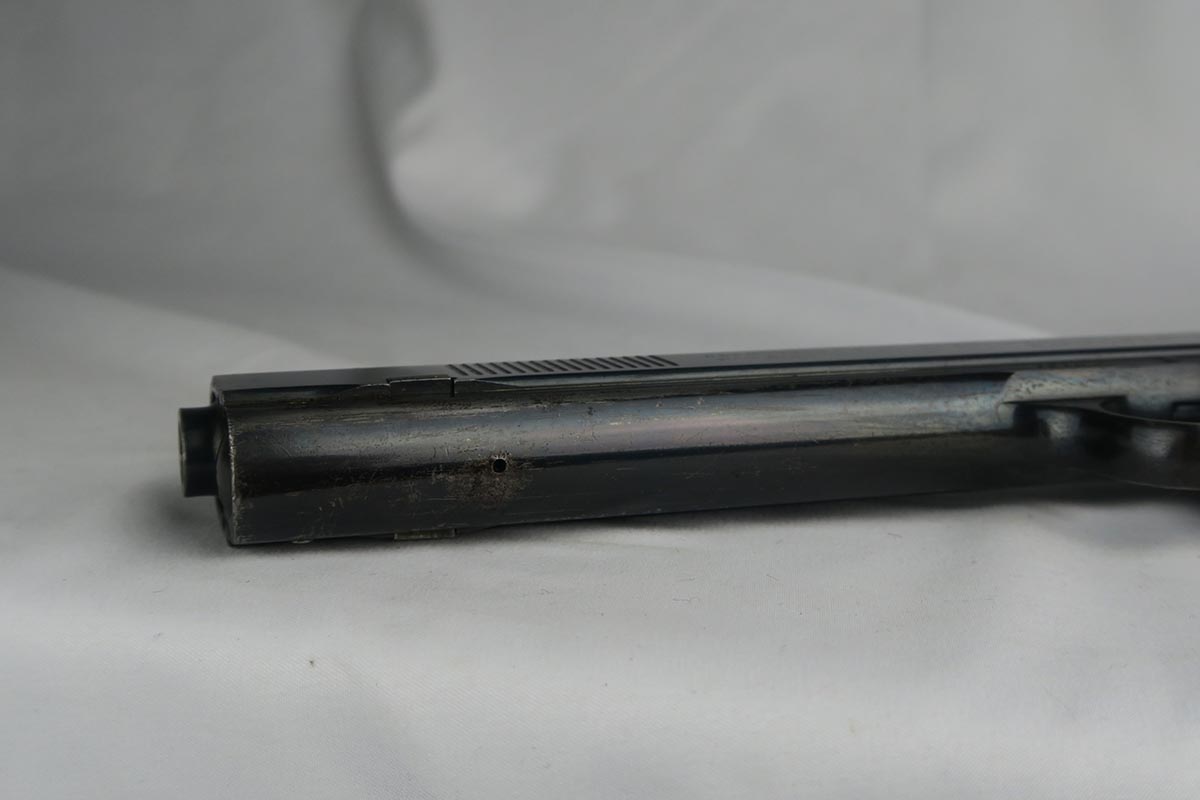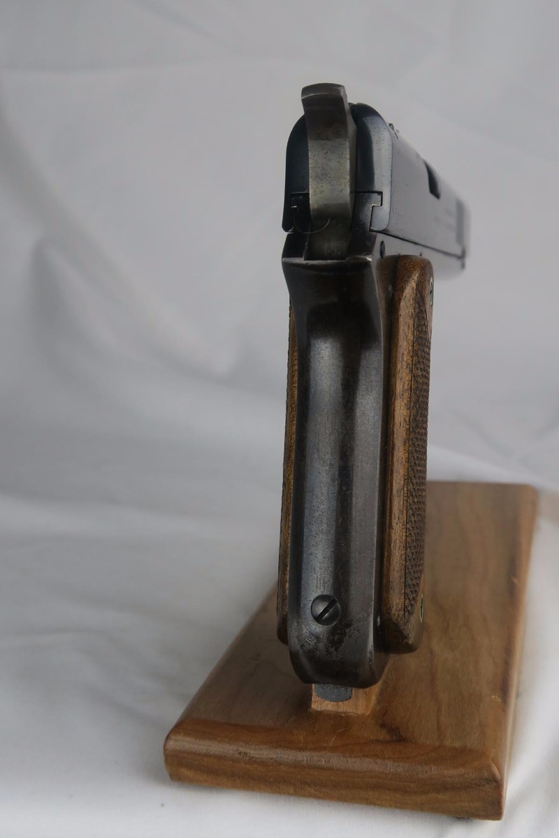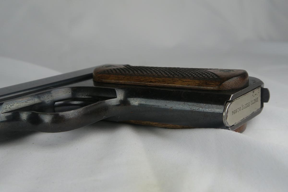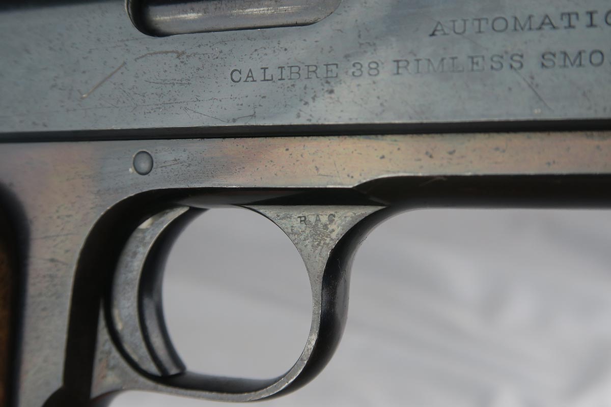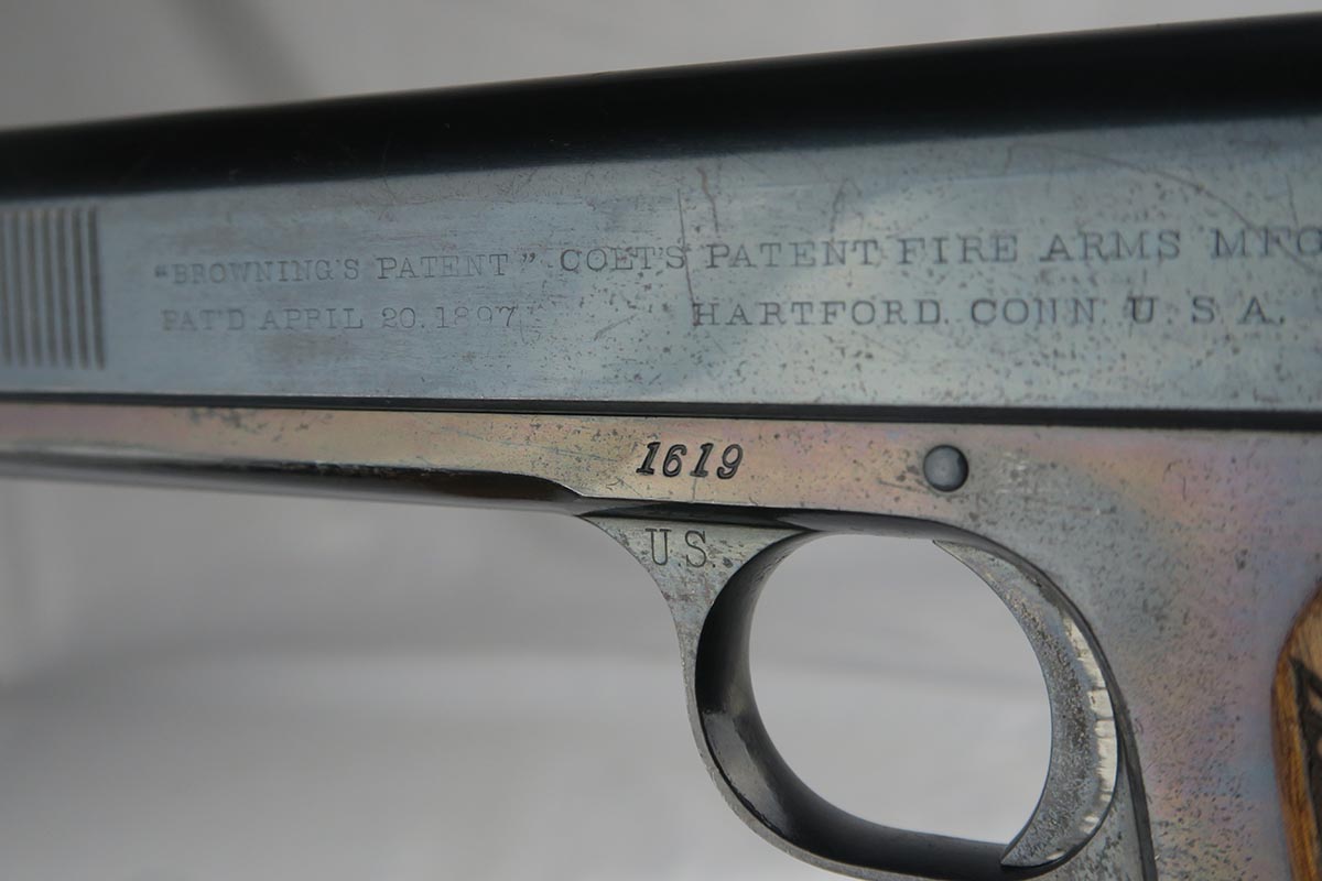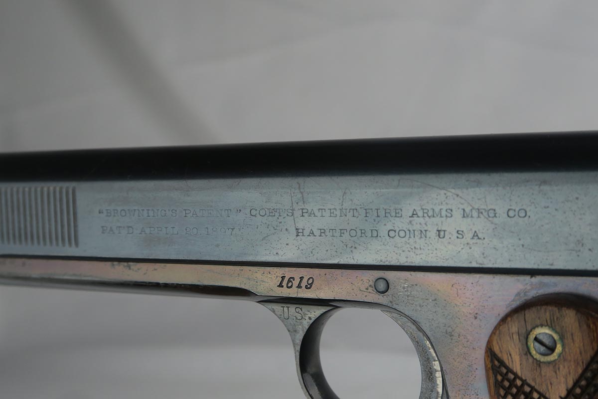 9/29/17 – This is the very rare Colt model 1900 pistol in good condition.  This pistol was issued for use by the U.S. Army and features the proper inspectors proof (R.A.C) on the trigger guard.  There were only ~4,300 of these pistols manufactured, all from 1900-1903, with a much smaller portion of that number receiving military issue.  This is a second army contract pistol, when 200 were shipped in lots of 50.  This one was in the third lot, shipped on January 24th, 1901.  To make this pistol even more unique, it still features the original, unaltered pop-up rear sight.  This feature doubled as a firing pin block and a rear sight.  At a point in production, Colt decided to abandon the sight safety and offered to alter any existing examples by removing the sight safety and replacing the device with a plug that was pinned in place.  This pistol has about 85% blue remaining but we have been contacted by a few collectors to let us know that they believe the finish is not original.  The pins should all show fire blue, and on this pistol they do not, telling us it’s an old refinish.  The most notable finish loss is on the straps and underside of the frame.  The slide legend is slightly worn from use and age, making the Colt logo somewhat faint.  The grips show no major cracks or chips, and the bore has no major issues aside from frosting throughout.  The serial number (1619) is in the correct range, and if you happen to also want the consecutively numbered #1618, we can put you in touch with the collector friend who owns that gun.