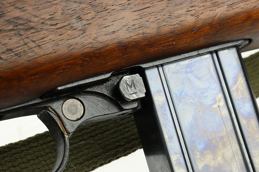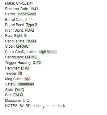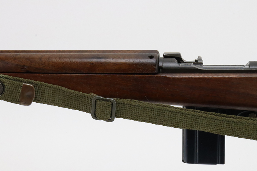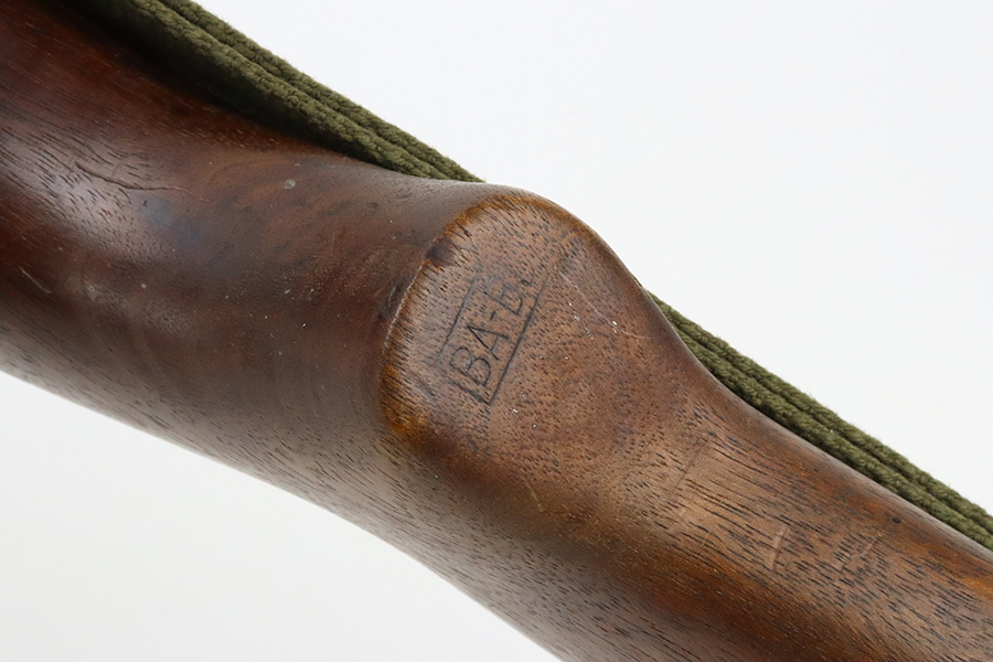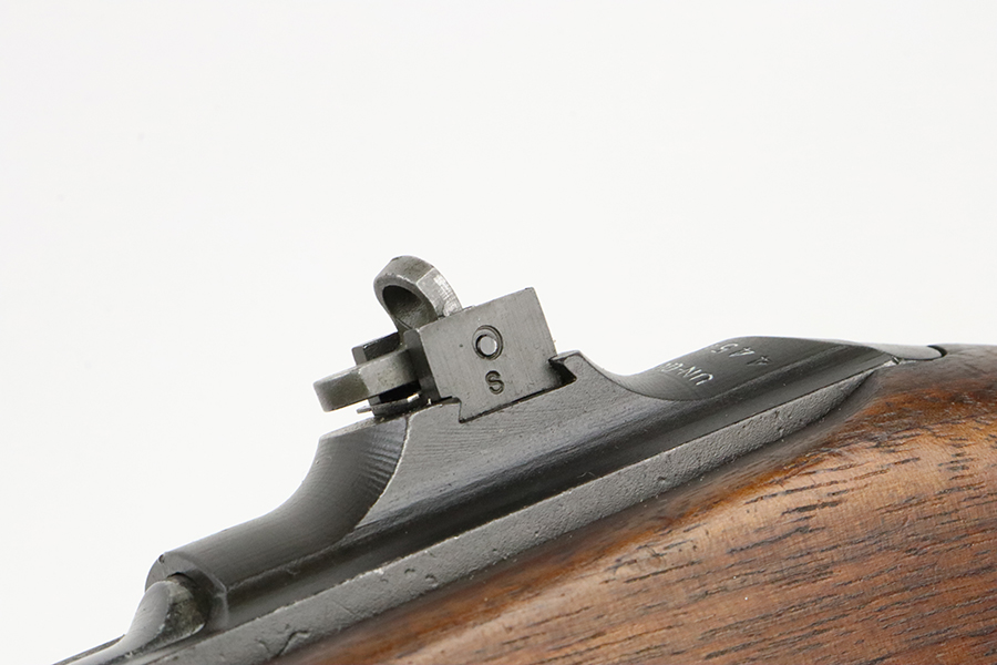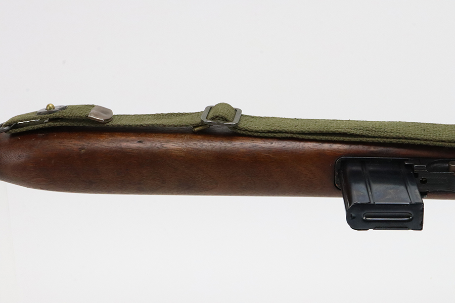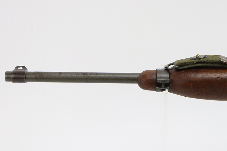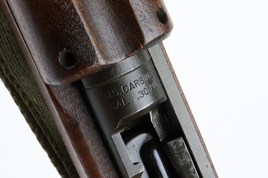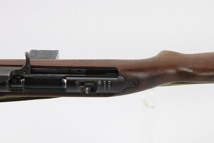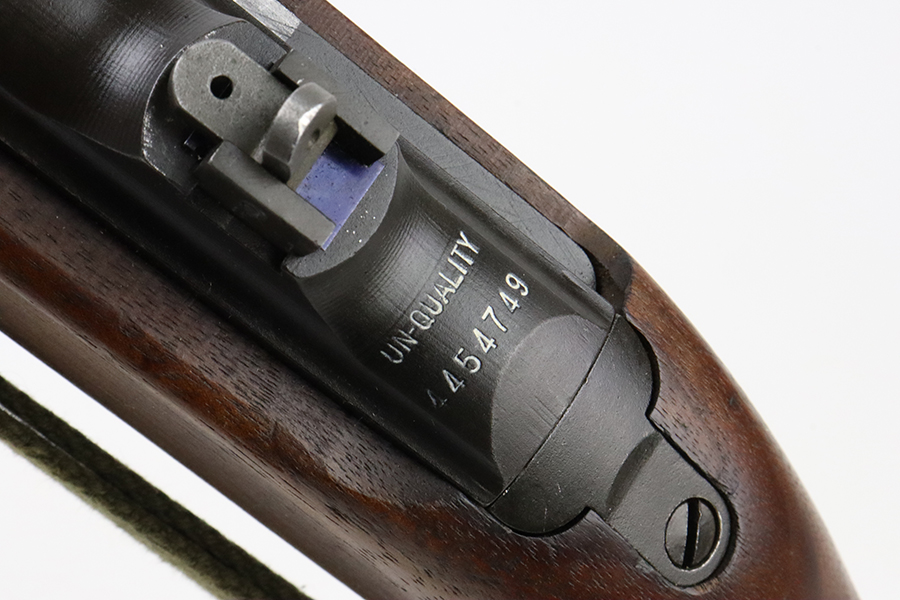 3/11/24 – This is one of the rarest WW2 era carbine variations – the Un-Quality M1. A portion of Quality Hardware’s contract was sub-contracted to Union Switch & Signal, where receivers were produced and given the name ‘Un-quality’. These are only found from serials 4,432,XXX to 4,532,XXX. This one is in the correct serial range. It is mostly correct, but some of the small parts have been replaced – a full parts list with markings is included in the photos. There is a BA-BD marking on the wrist of the stock, which would would indicate it was likely reworked at the Benicia Arsenal. The flip-up rear sight is slightly bent. There is not much actual finish loss on the metal parts, but there is noticeable spotty oxidation along the barrel. Very nice wood stock. Comes with one magazine, canvas sling, and oiler. Mint bore.