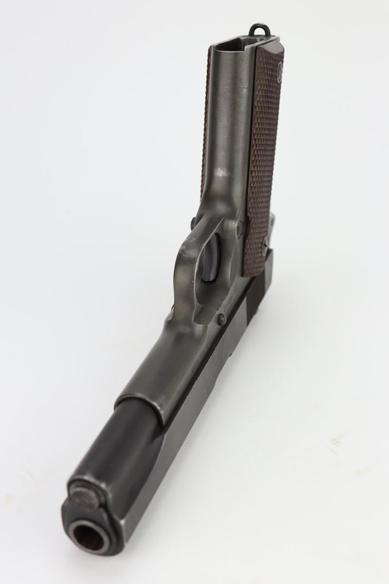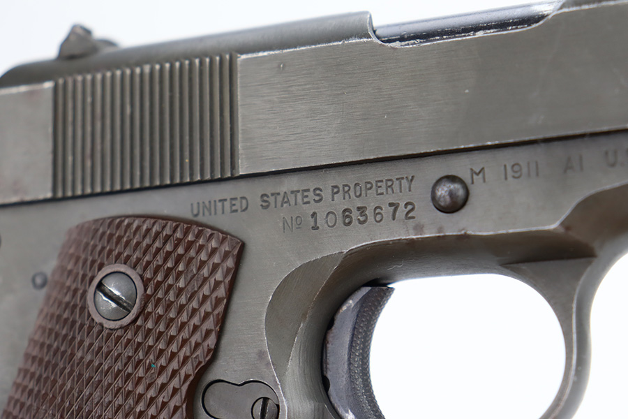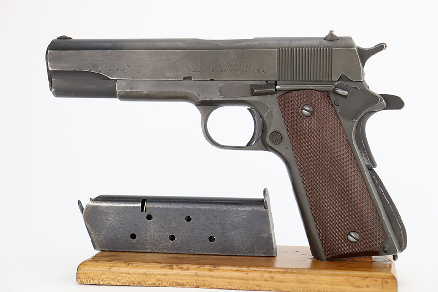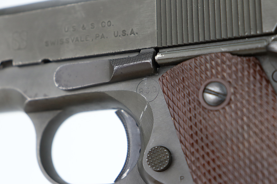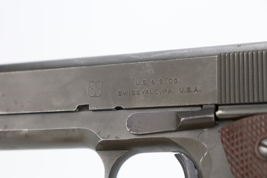 11/30/23 – This is a nice, original example of a rare Union Switch & Signal M1911A1 issued to the US military in 1943. The US&S 1911a1 pistols are one of the most sought after collectibles from WW2. This one is all correct and has retained 92-93% of its original finish. There’s high edge wear on the front edges of the frame and around the muzzle, with a little more wear on the front strap and trigger guard. Also a few small dings on the left side of the slide. Proper High Standard barrel.  The bore has strong rifling but minor frost throughout.  Scovill mag.  Excellent grips with sharp checkering.  The Union Switch & Signal company of Swissvale Pennsylvania, primarily made railroad signaling equipment but received a contract on May 5, 1942 for the manufacture of M1911A1 pistols. The first pistols were accepted by Ordnance inspectors in January 1943, but the company received word that their contract would be canceled. Within a month U.S.&S. had signed a contract to supply carbine parts. On March 8, 1943 the company was officially notified that their contract had been cut back from 200,000 pistols to 30,000 pistols. However on June 26th, when the contract was nearly complete, and many of the workers had been transferred to Carbine operations, the company received a letter of intent to purchase an additional 25,000 pistols. The last of the pistols was shipped on November 27, 1943. 55,000 Union Switch and Signal pistols were delivered serial numbered from 1041405 to 1096404. U.S.&S. pistols are the second rarest of the M1911A1s (55,000 produced), only the Singer is rarer (500 produced). None of the Union Switch & Signal 1911A1s have the crossed cannons ordnance stamp.