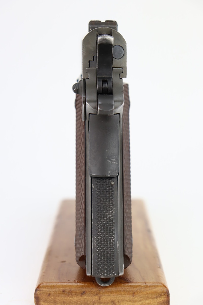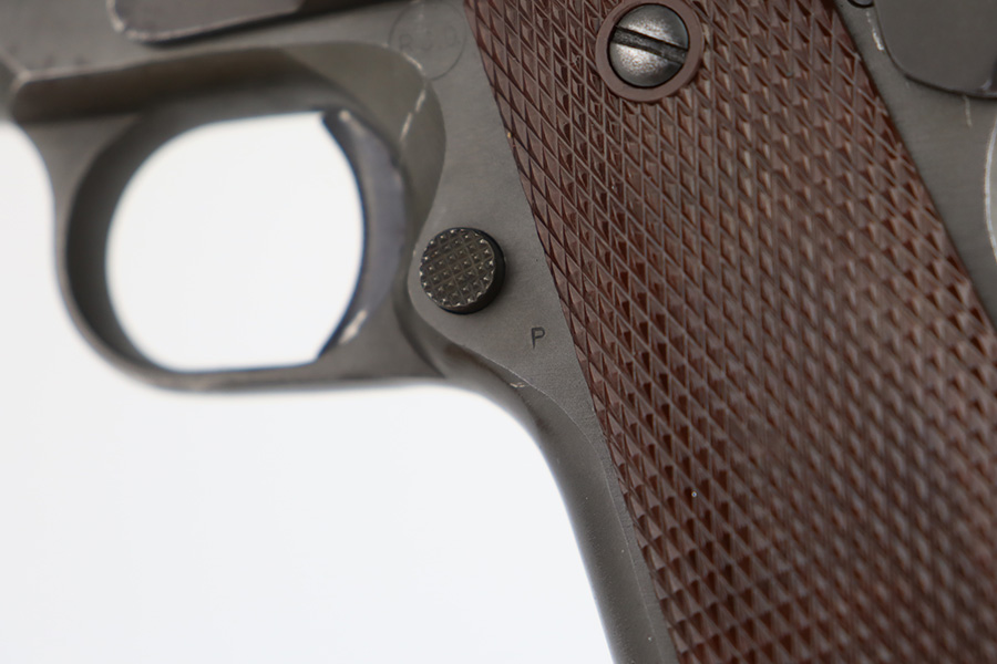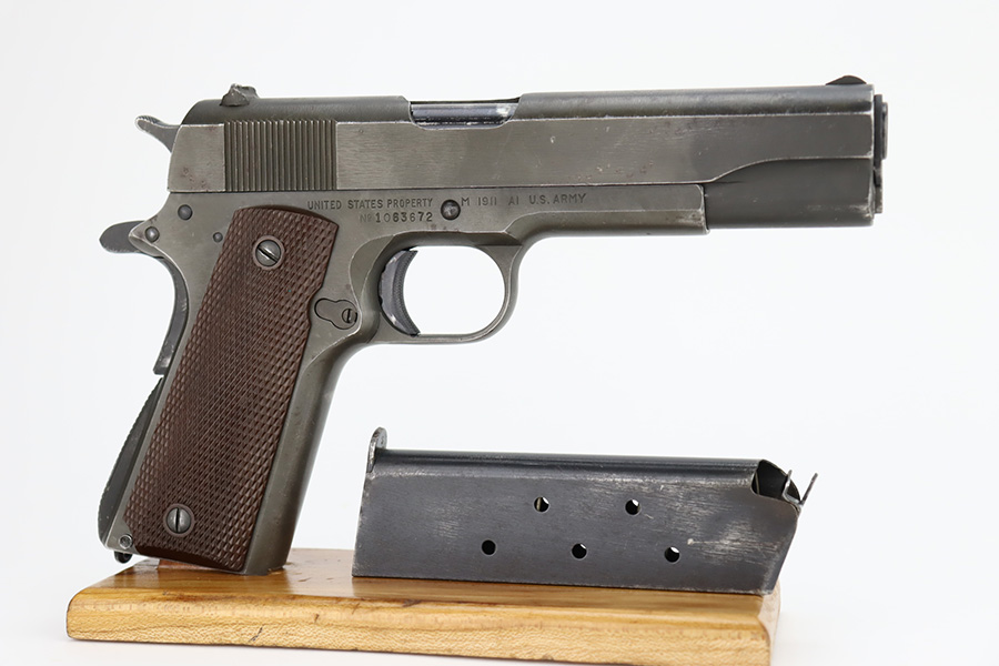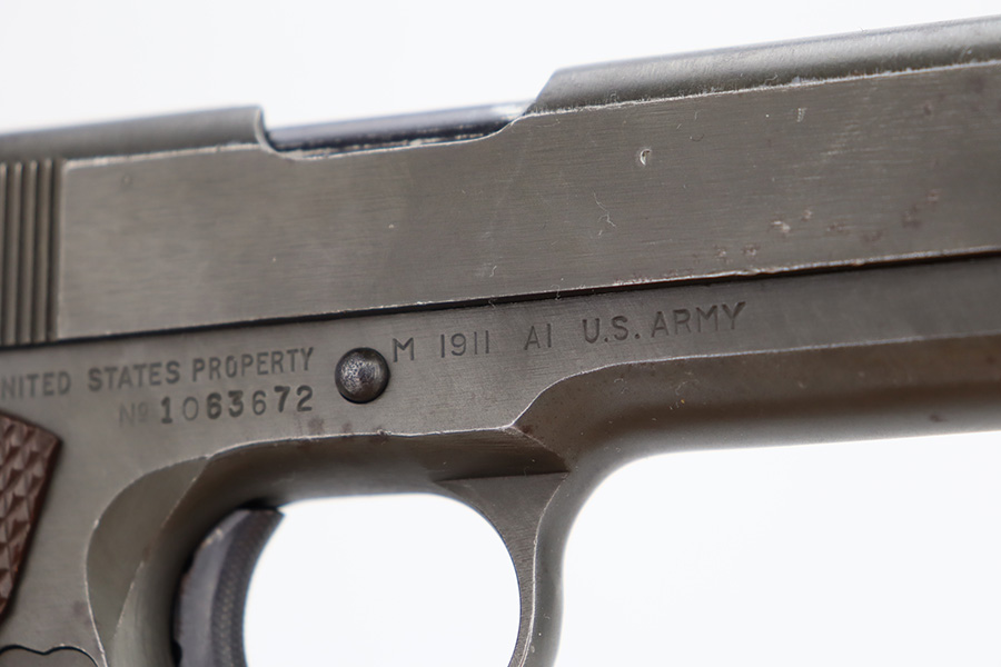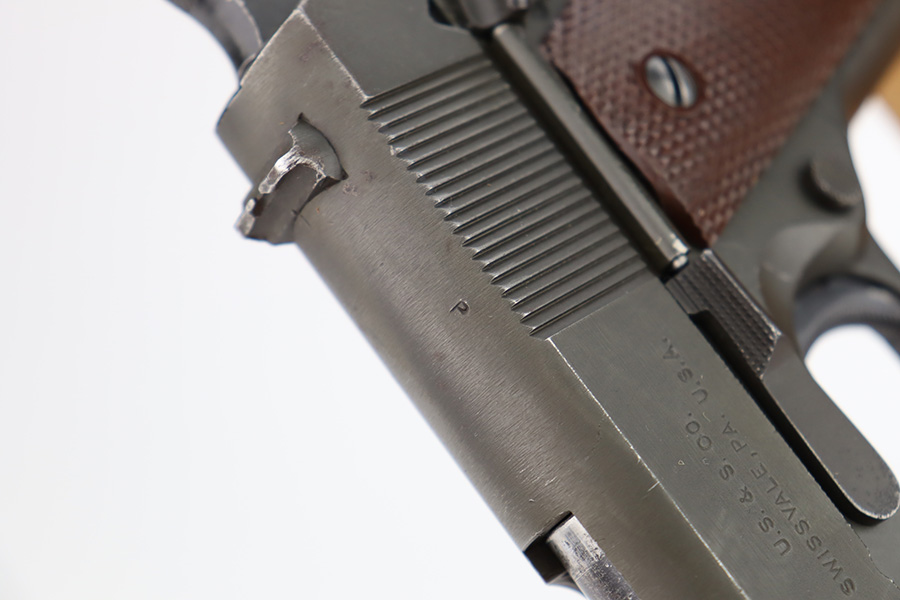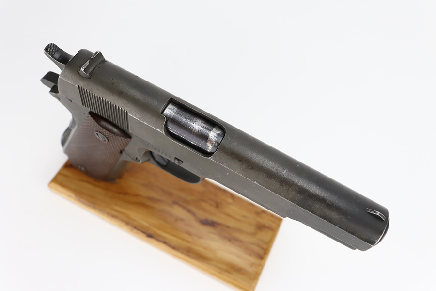 11/30/23 – This is a nice, original example of a rare Union Switch & Signal M1911A1 issued to the US military in 1943. The US&S 1911a1 pistols are one of the most sought after collectibles from WW2. This one is all correct and has retained 92-93% of its original finish. There’s high edge wear on the front edges of the frame and around the muzzle, with a little more wear on the front strap and trigger guard. Also a few small dings on the left side of the slide. Proper High Standard barrel.  The bore has strong rifling but minor frost throughout.  Scovill mag.  Excellent grips with sharp checkering.  The Union Switch & Signal company of Swissvale Pennsylvania, primarily made railroad signaling equipment but received a contract on May 5, 1942 for the manufacture of M1911A1 pistols. The first pistols were accepted by Ordnance inspectors in January 1943, but the company received word that their contract would be canceled. Within a month U.S.&S. had signed a contract to supply carbine parts. On March 8, 1943 the company was officially notified that their contract had been cut back from 200,000 pistols to 30,000 pistols. However on June 26th, when the contract was nearly complete, and many of the workers had been transferred to Carbine operations, the company received a letter of intent to purchase an additional 25,000 pistols. The last of the pistols was shipped on November 27, 1943. 55,000 Union Switch and Signal pistols were delivered serial numbered from 1041405 to 1096404. U.S.&S. pistols are the second rarest of the M1911A1s (55,000 produced), only the Singer is rarer (500 produced). None of the Union Switch & Signal 1911A1s have the crossed cannons ordnance stamp.