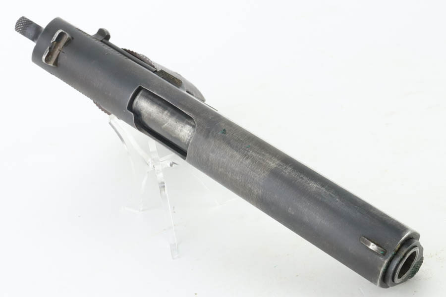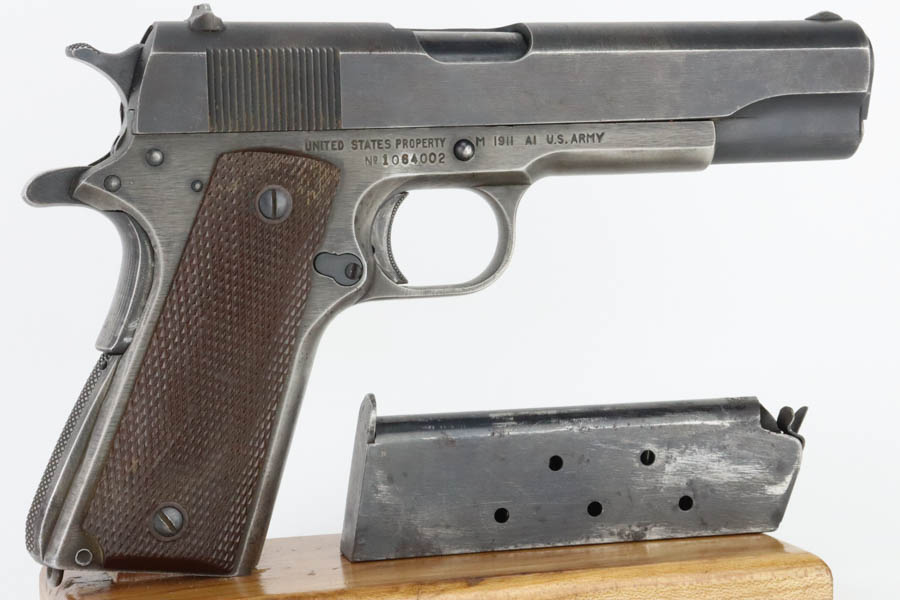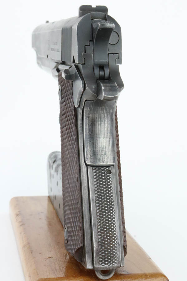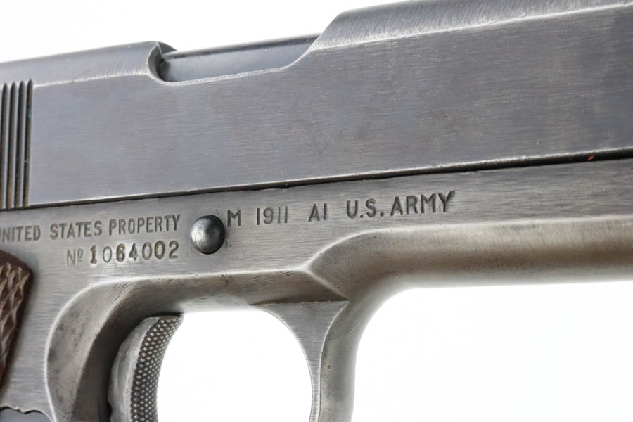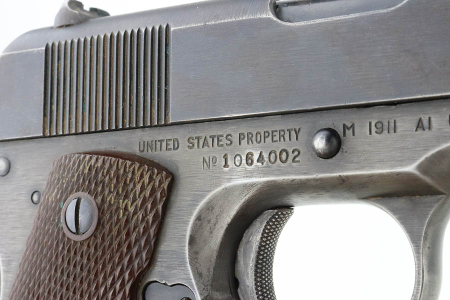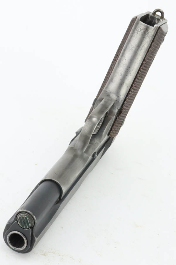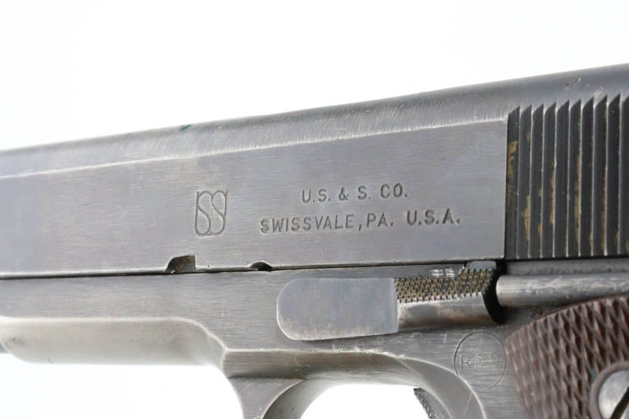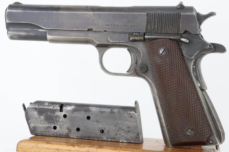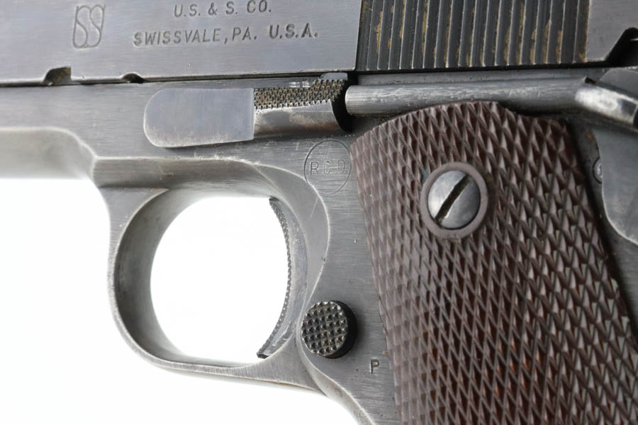 6/21/24 – This is a nice, all original example of a rare Union Switch & Signal M1911A1 issued to the US military in 1943. The US&S 1911a1 pistols are one of the most sought after collectibles from WW2. This one is all correct and has retained roughly 65-70% of its original finish with obvious finish loss throughout, spotty patina here and there, and minor pitting on the front strap. The bore has great rifling with just very light pin-pricking throughout. The Union Switch & Signal company of Swissvale Pennsylvania, primarily made railroad signaling equipment but received a contract on May 5, 1942 for the manufacture of M1911A1 pistols. The first pistols were accepted by Ordnance inspectors in January 1943, but the company received word that their contract would be canceled. Within a month U.S.&S. had signed a contract to supply carbine parts. On March 8, 1943 the company was officially notified that their contract had been cut back from 200,000 pistols to 30,000 pistols. However on June 26th, when the contract was nearly complete, and many of the workers had been transferred to Carbine operations, the company received a letter of intent to purchase an additional 25,000 pistols. The last of the pistols was shipped on November 27, 1943. 55,000 Union Switch and Signal pistols were delivered serial numbered from 1041405 to 1096404. U.S.&S. pistols are the second rarest of the M1911A1s (55,000 produced), only the Singer is rarer (500 produced). None of the Union Switch & Signal 1911A1s have the crossed cannons ordnance stamp. We are told these were issued to the Army Air Corps during the war.