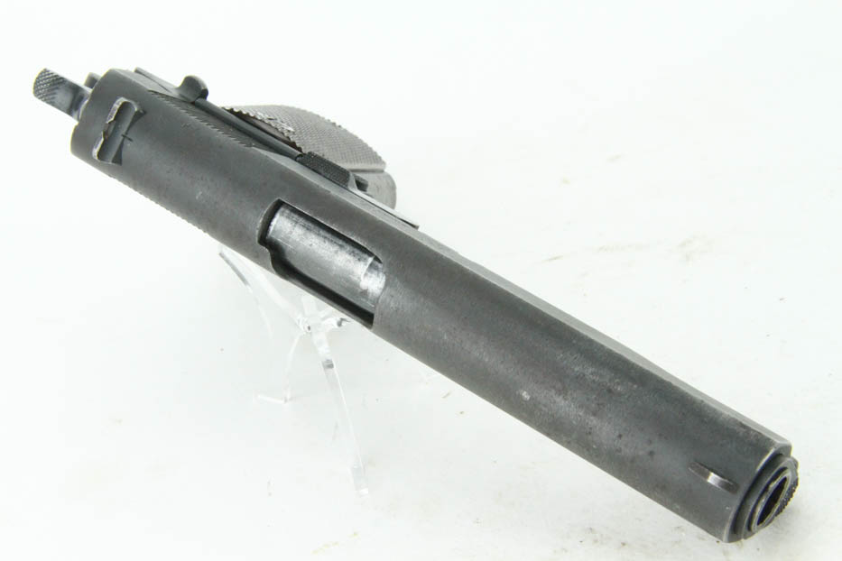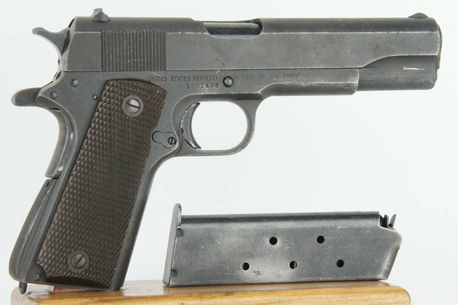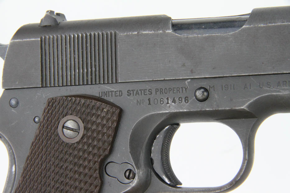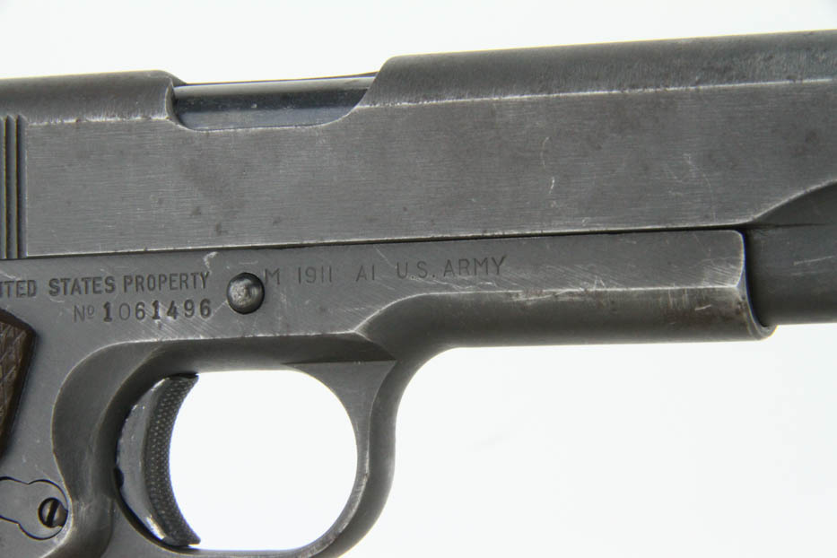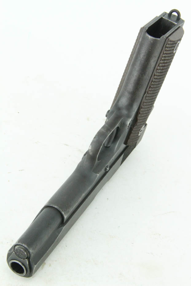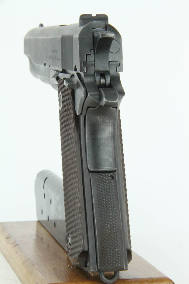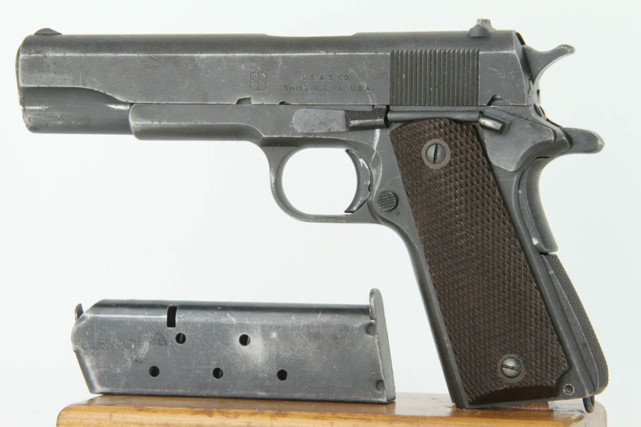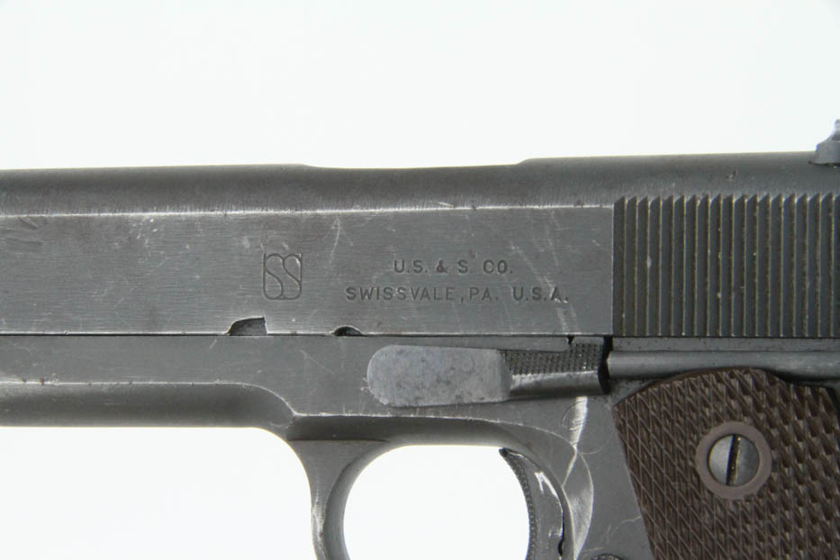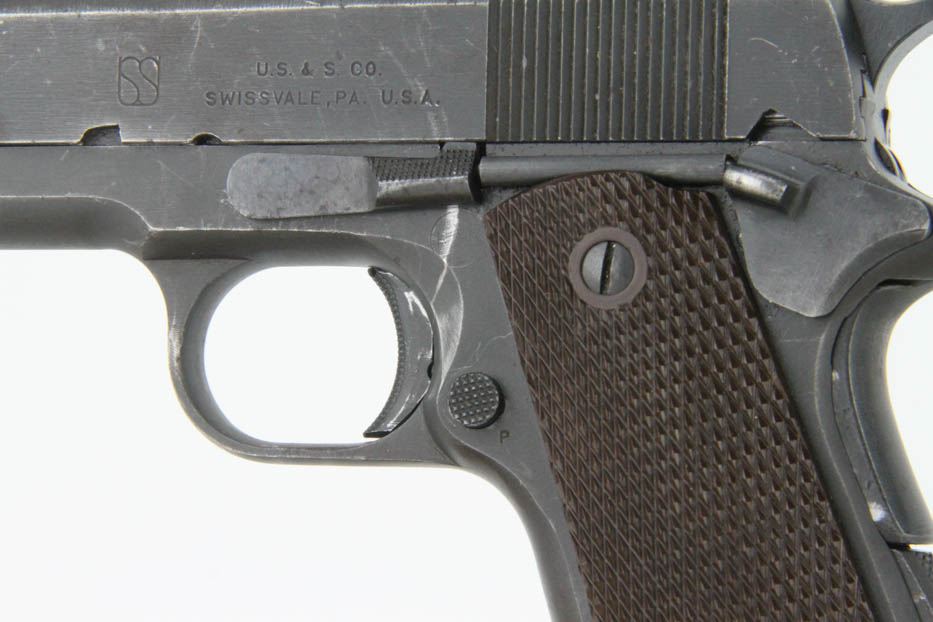 The Union Switch & Signal company of Swissvale Pennsylvania, primarily made railroad signaling equipment but received a contract on May 5, 1942 for the manufacture of M1911A1 pistols. The first pistols were accepted by Ordnance inspectors in January 1943, but the company received word that their contract would be canceled. Within a month U.S.&S. had signed a contract to supply carbine parts. On March 8, 1943 the company was officially notified that their contract had been cut back from 200,000 pistols to 30,000 pistols. However on June 26th, when the contract was nearly complete, and many of the workers had been transferred to Carbine operations, the company received a letter of intent to purchase an additional 25,000 pistols. The last of the pistols was shipped on November 27, 1943. 55,000 Union Switch and Signal pistols were delivered serial numbered from 1041405 to 1096404. U.S.&S. pistols are the second rarest of the M1911A1s (55,000 produced), only the Singer is rarer (500 produced). None of the Union Switch & Signal 1911A1s have the crossed cannons ordnance stamp. We are told these were issued to the Army Air Corps during the war.