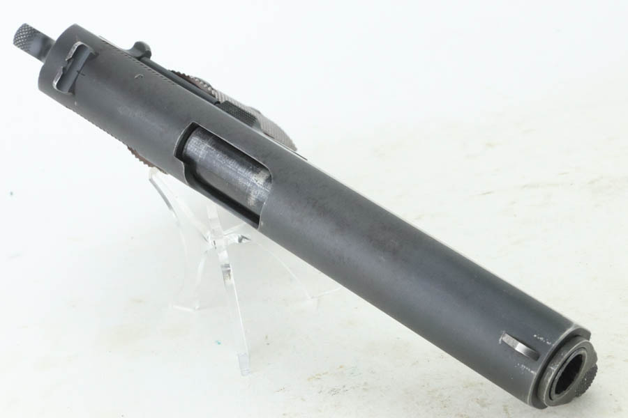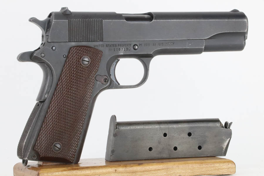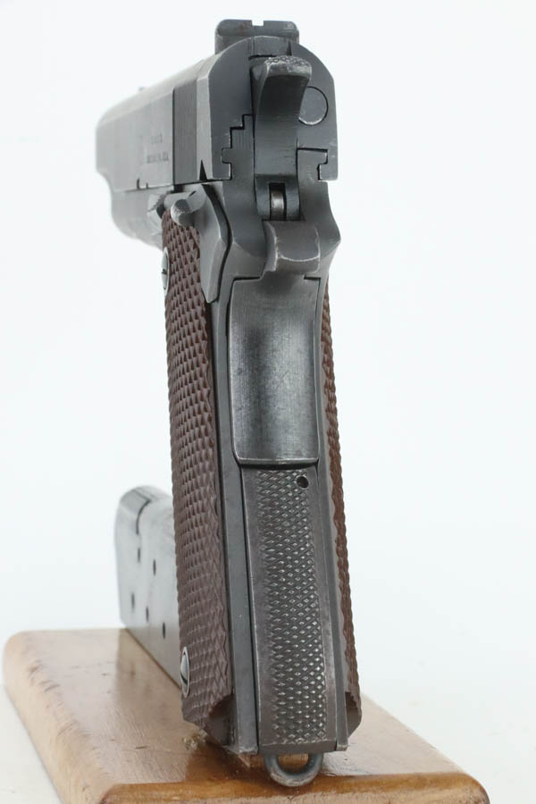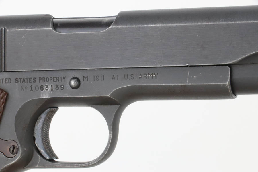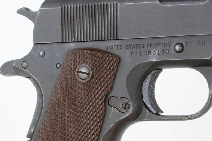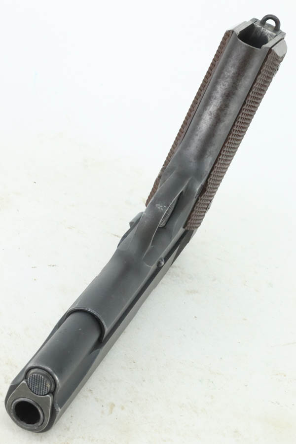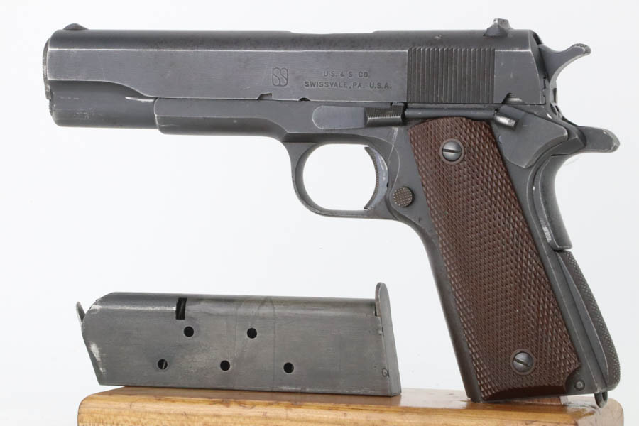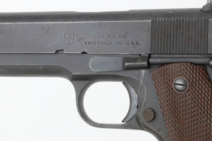 7/23/24 – This is a nice, all original example of a rare Union Switch & Signal M1911A1 issued to the US military in 1943. The US&S 1911a1 pistols are one of the most sought after collectibles from WW2. This one is all correct and has retained about 96% of its original finish with very minor high edge wear. While there isn’t a lot of actual finish loss, there is some spotty patina on the slide and on the front strap. It comes with excellent grips and a proper magazine. The bore has good rifling, but there is some pitting in the grooves. The Union Switch & Signal company of Swissvale Pennsylvania, primarily made railroad signaling equipment but received a contract on May 5, 1942 for the manufacture of M1911A1 pistols. The first pistols were accepted by Ordnance inspectors in January 1943, but the company received word that their contract would be canceled. Within a month U.S.&S. had signed a contract to supply carbine parts. On March 8, 1943 the company was officially notified that their contract had been cut back from 200,000 pistols to 30,000 pistols. However on June 26th, when the contract was nearly complete, and many of the workers had been transferred to Carbine operations, the company received a letter of intent to purchase an additional 25,000 pistols. The last of the pistols was shipped on November 27, 1943. 55,000 Union Switch and Signal pistols were delivered serial numbered from 1041405 to 1096404. U.S.&S. pistols are the second rarest of the M1911A1s (55,000 produced), only the Singer is rarer (500 produced). None of the Union Switch & Signal 1911A1s have the crossed cannons ordnance stamp. We are told these were issued to the Army Air Corps during the war.