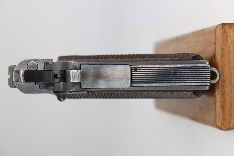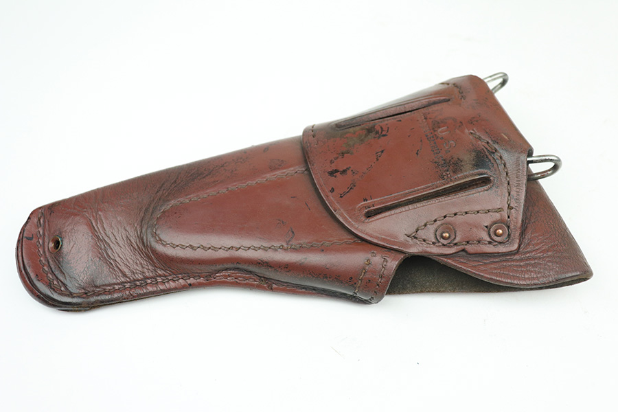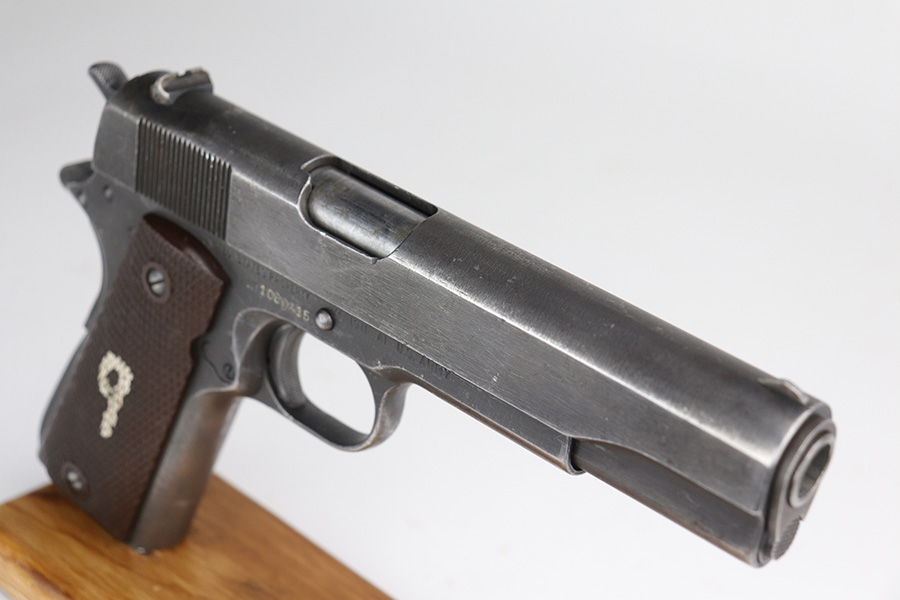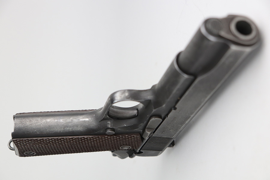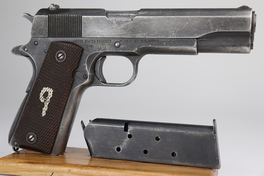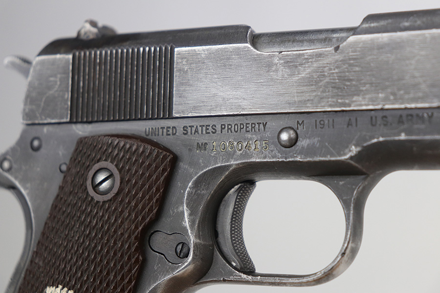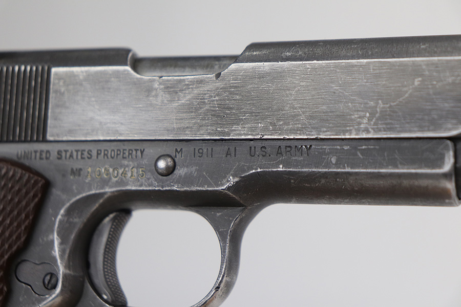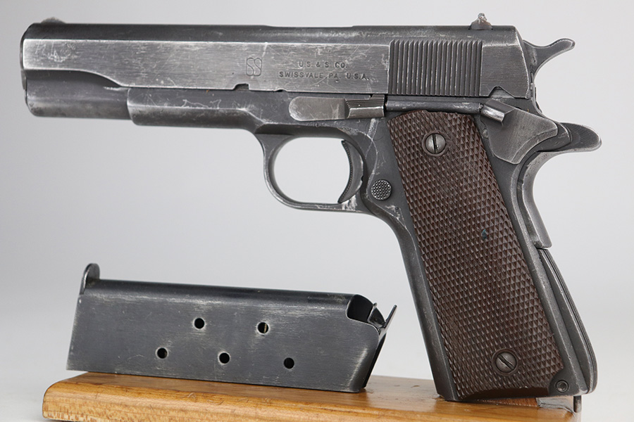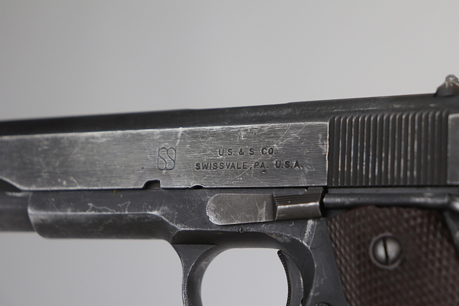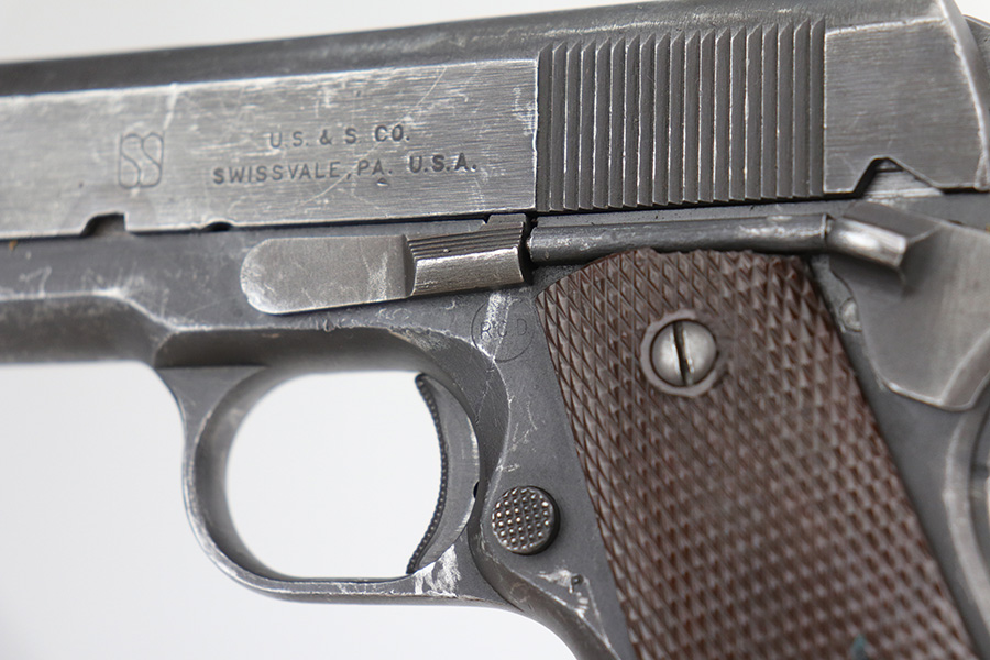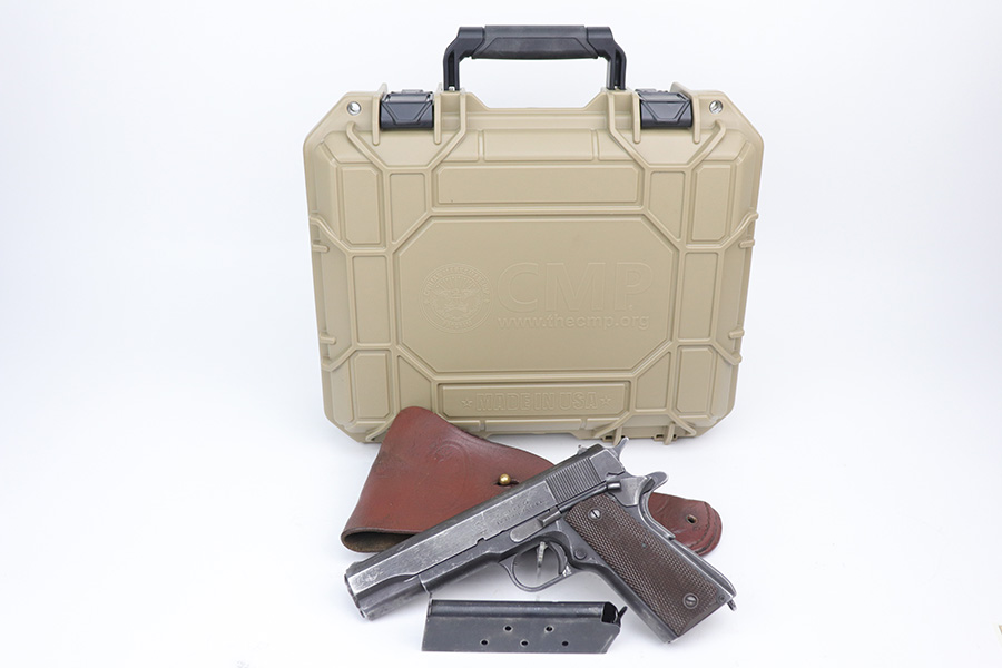 10/26/21 – This is a desirable Union Switch & Signal M1911A1 from 1943 that was released to the public through the CMP program. US&S is the rarest World War II maker of 1911A1s aside from Singer, all made in 1943. This one has original dulite finish throughout with general thinning all over, especially on the slide and grip safety. Proper RCD inspector mark on frame, as well as P proofs on slide and frame. Correct HS barrel with strong rifling but a little frost in the grooves. Grips are original and show minor handling wear but no cracks. The pistol does have the later mainspring housing, as well as incorrect barrel bushing (no concentric circles). Risdon magazine and comes with a Warren Leather Goods holster. Also included is the original CMP certificate of authenticity, manual, lock and CMP hard case.
