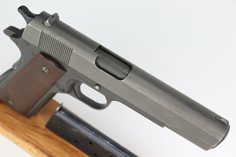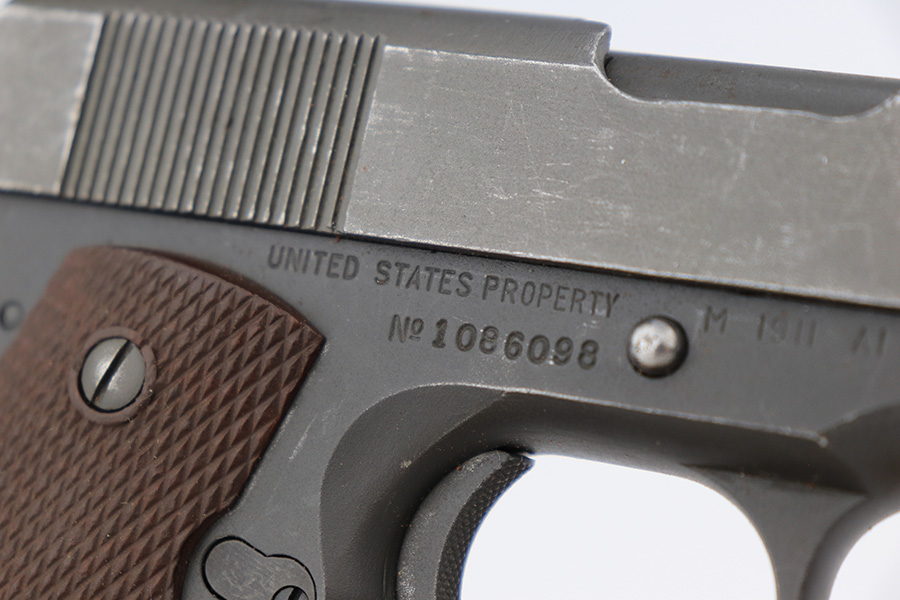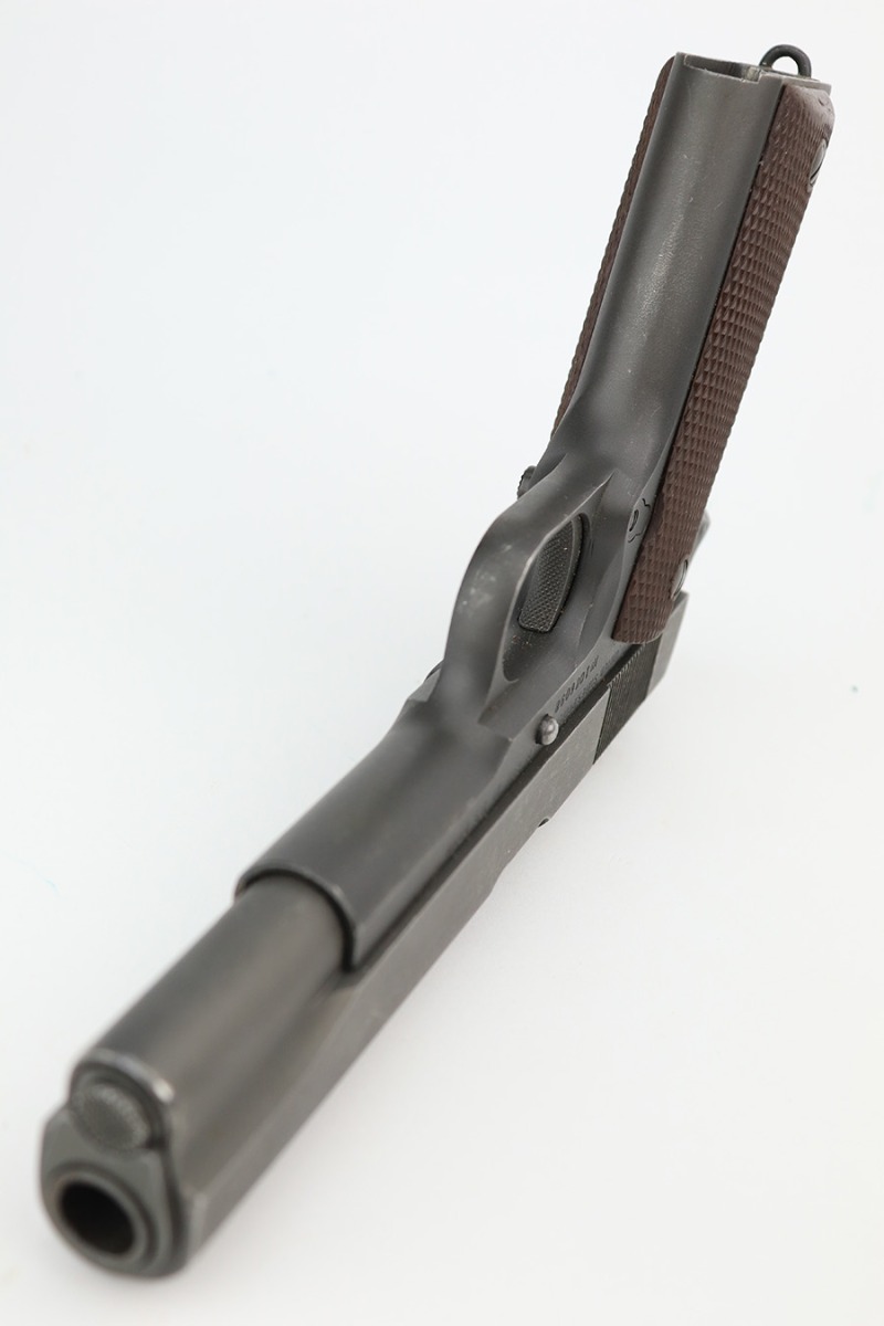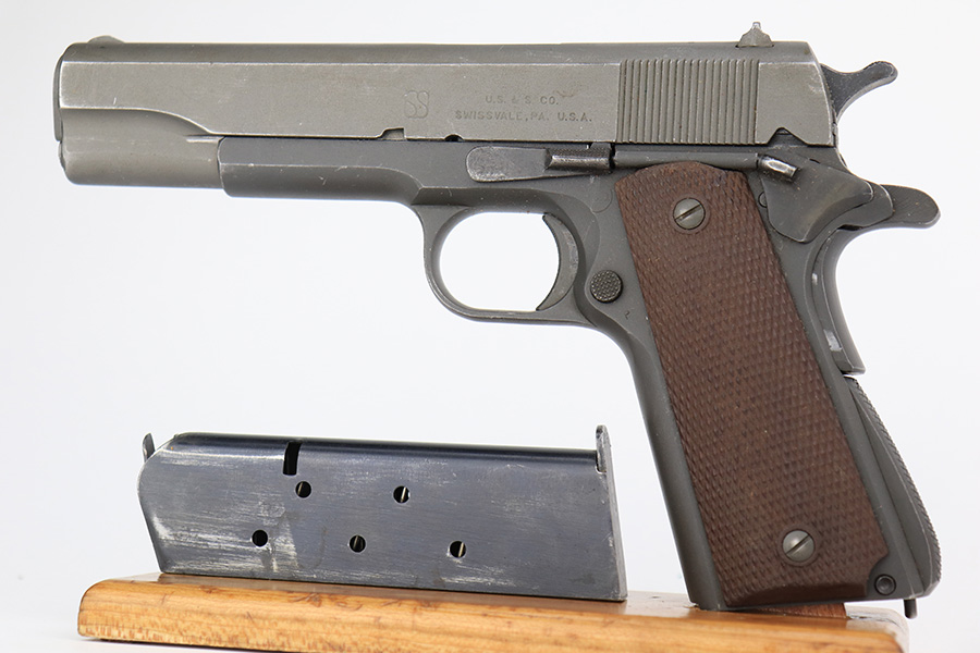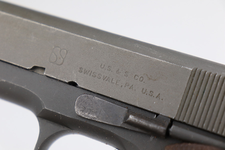 4/10/23 – This is a very nice example of a rare Union Switch & Signal M1911A1 issued to the US military in 1943. The US&S 1911a1 pistols are one of the most sought after collectibles from WW2. Proper High Standard barrel. The Union Switch & Signal company of Swissvale Pennsylvania, primarily made railroad signaling equipment but received a contract on May 5, 1942 for the manufacture of M1911A1 pistols. The first pistols were accepted by Ordnance inspectors in January 1943, but the company received word that their contract would be canceled. Within a month U.S.&S. had signed a contract to supply carbine parts. On March 8, 1943 the company was officially notified that their contract had been cut back from 200,000 pistols to 30,000 pistols. However on June 26th, when the contract was nearly complete, and many of the workers had been transferred to Carbine operations, the company received a letter of intent to purchase an additional 25,000 pistols. The last of the pistols was shipped on November 27, 1943. 55,000 Union Switch and Signal pistols were delivered serial numbered from 1041405 to 1096404. U.S.&S. pistols are the second rarest of the M1911A1s (55,000 produced), only the Singer is rarer (500 produced). None of the Union Switch & Signal 1911A1s have the crossed cannons ordnance stamp. We are told these were issued to the Army Air Corps during the war. This one has the original US&S slide and frame, with proper barrel bushing and correct HS-marked barrel. The full pistol has been parkerized, though there are no re-work proofs. Postwar/repro grips. Original WW2 Scoville magazine. The barrel has decent rifling but notable frost and freckling throughout.
