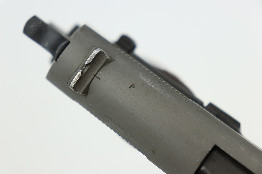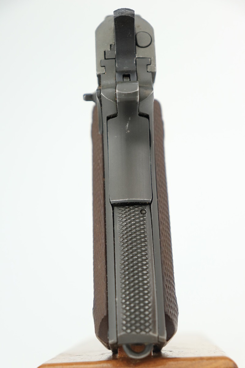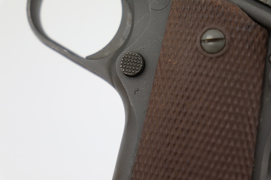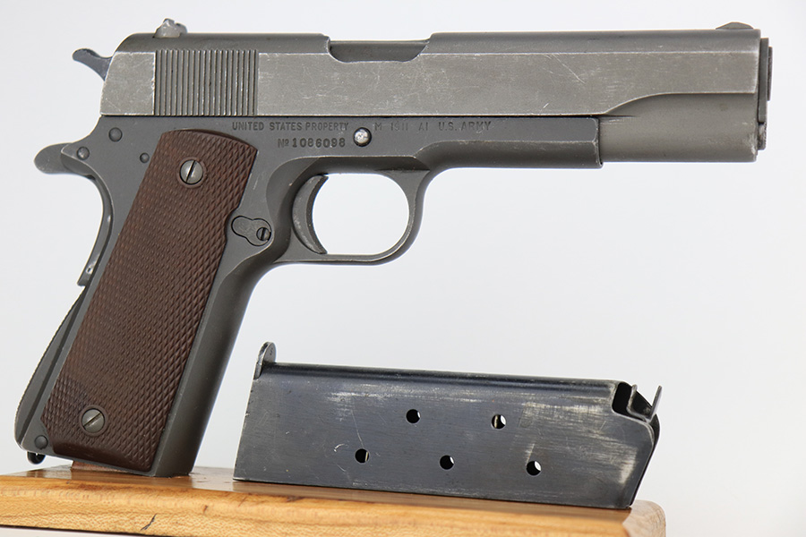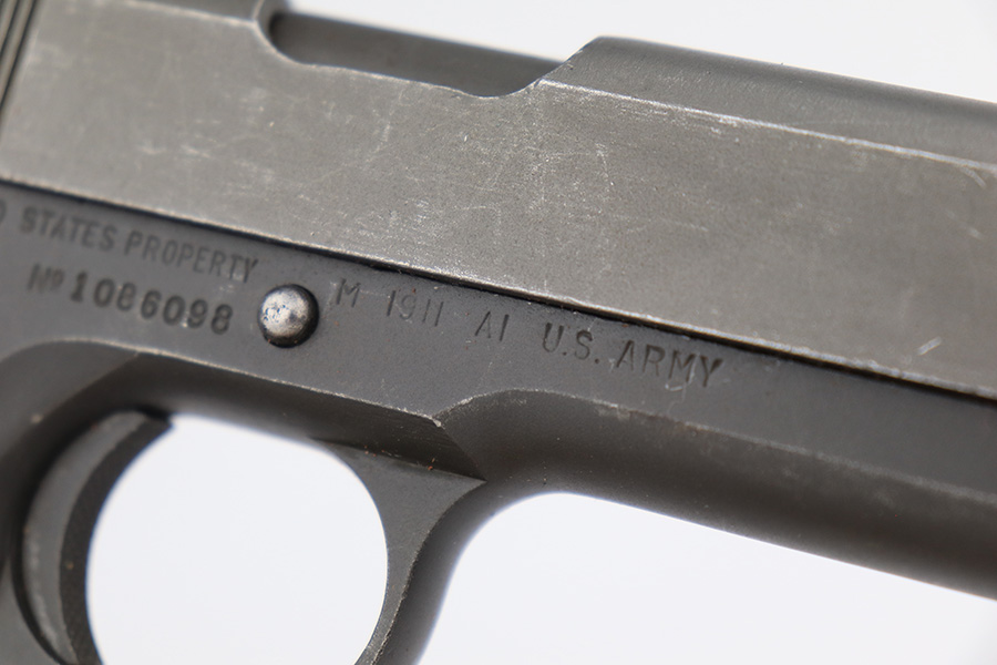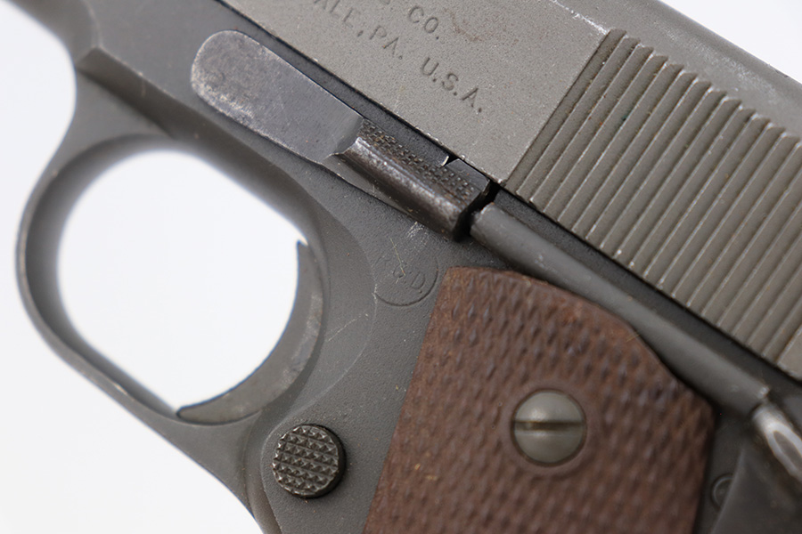 4/10/23 – This is a very nice example of a rare Union Switch & Signal M1911A1 issued to the US military in 1943. The US&S 1911a1 pistols are one of the most sought after collectibles from WW2. Proper High Standard barrel. The Union Switch & Signal company of Swissvale Pennsylvania, primarily made railroad signaling equipment but received a contract on May 5, 1942 for the manufacture of M1911A1 pistols. The first pistols were accepted by Ordnance inspectors in January 1943, but the company received word that their contract would be canceled. Within a month U.S.&S. had signed a contract to supply carbine parts. On March 8, 1943 the company was officially notified that their contract had been cut back from 200,000 pistols to 30,000 pistols. However on June 26th, when the contract was nearly complete, and many of the workers had been transferred to Carbine operations, the company received a letter of intent to purchase an additional 25,000 pistols. The last of the pistols was shipped on November 27, 1943. 55,000 Union Switch and Signal pistols were delivered serial numbered from 1041405 to 1096404. U.S.&S. pistols are the second rarest of the M1911A1s (55,000 produced), only the Singer is rarer (500 produced). None of the Union Switch & Signal 1911A1s have the crossed cannons ordnance stamp. We are told these were issued to the Army Air Corps during the war. This one has the original US&S slide and frame, with proper barrel bushing and correct HS-marked barrel. The full pistol has been parkerized, though there are no re-work proofs. Postwar/repro grips. Original WW2 Scoville magazine. The barrel has decent rifling but notable frost and freckling throughout.