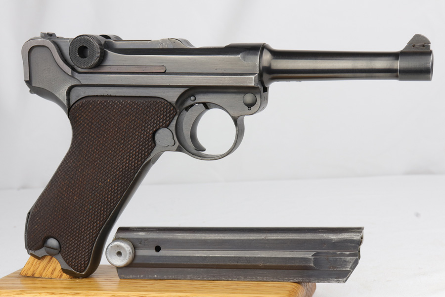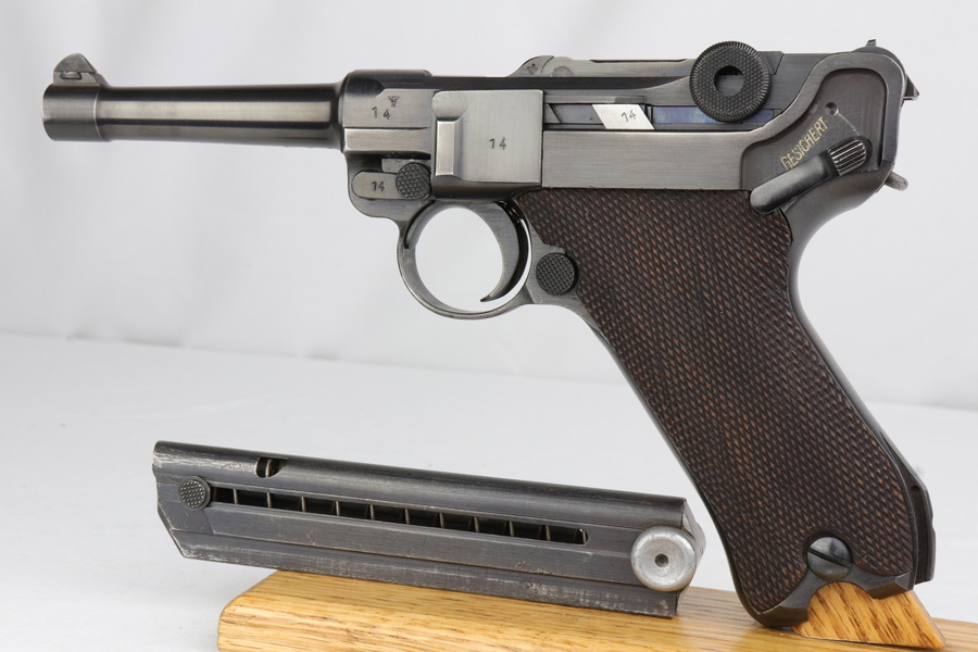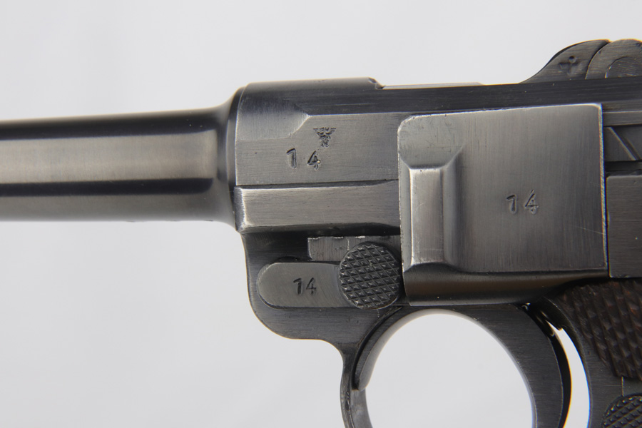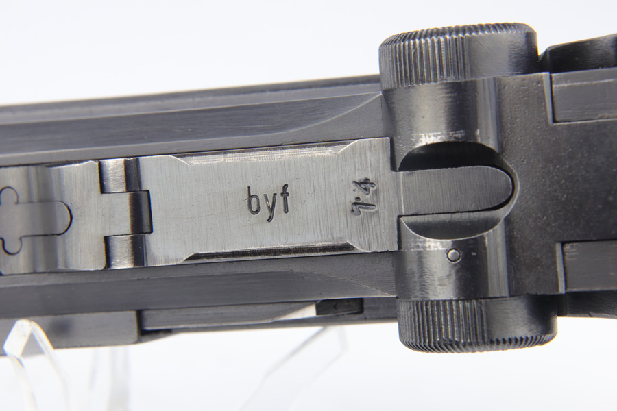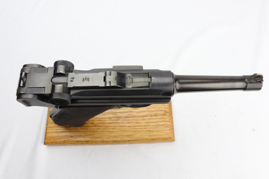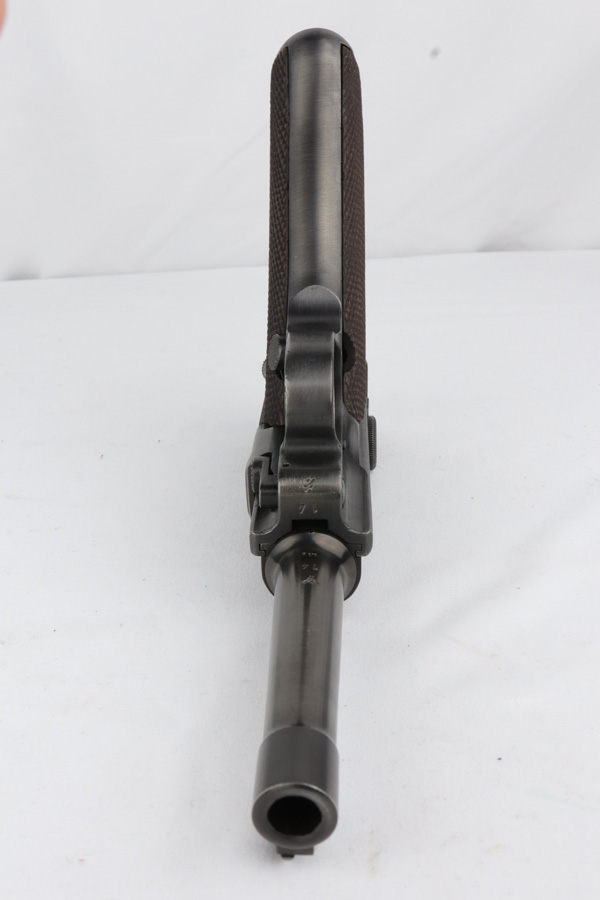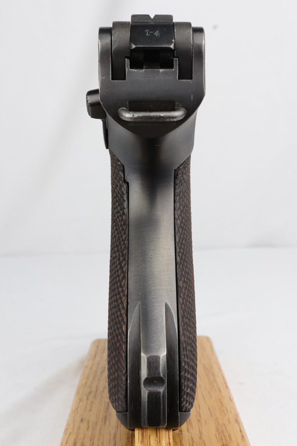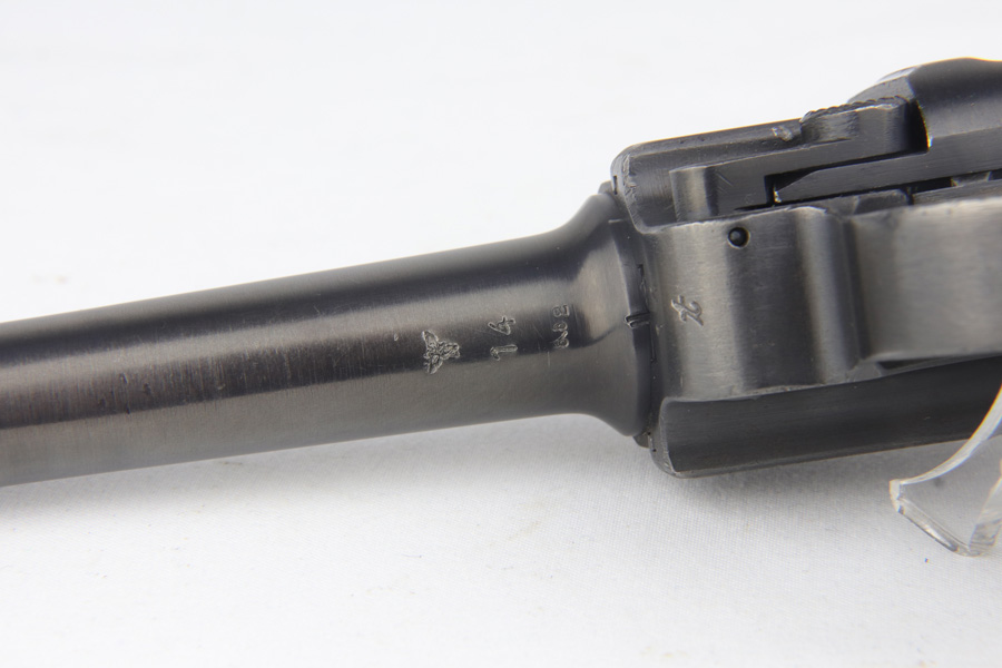 12/11/18 – This is a rare Nazi era Luger that was likely put together from parts at the Krieghoff factory. After 1942, Mauser stopped producing Lugers to start P.38 production. Left over parts were then sent to Krieghoff as they used them to put together Lugers such as the Ku. This gun has two distinctly different finishes: some high polish, some duller military finish. Yet, all numbered parts are matching (#14). The magazine is 122 proofed and matching numbered to the gun. The grips are numbered to the gun, too. There is no date on the receiver but the toggle is ‘byf’ marked. The bore looks like the pistol has hardly been used, as does the bluing on the pistol. The hold open, rear toggle pin and firing pin are NOT numbered. The gun has at least four Eagle/N firing proofs and interestingly the firing pin is an early non-fluted with a Swiss cross on it. Under the receiver (internally) there is an HK L2 proof. All of this information leads me to conclude that the gun was put together during the late-war time period (NOT a post war PX gun) at the Krieghoff factory. It has a combination of DWM, Mauser and HK parts, but then numbered by the Germans to be all matching. A very unique Luger for the advanced collector.