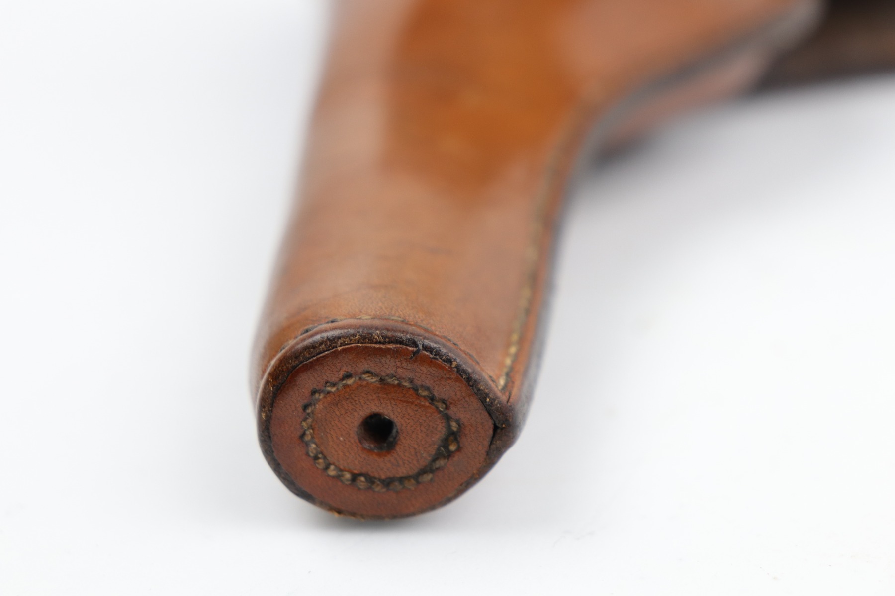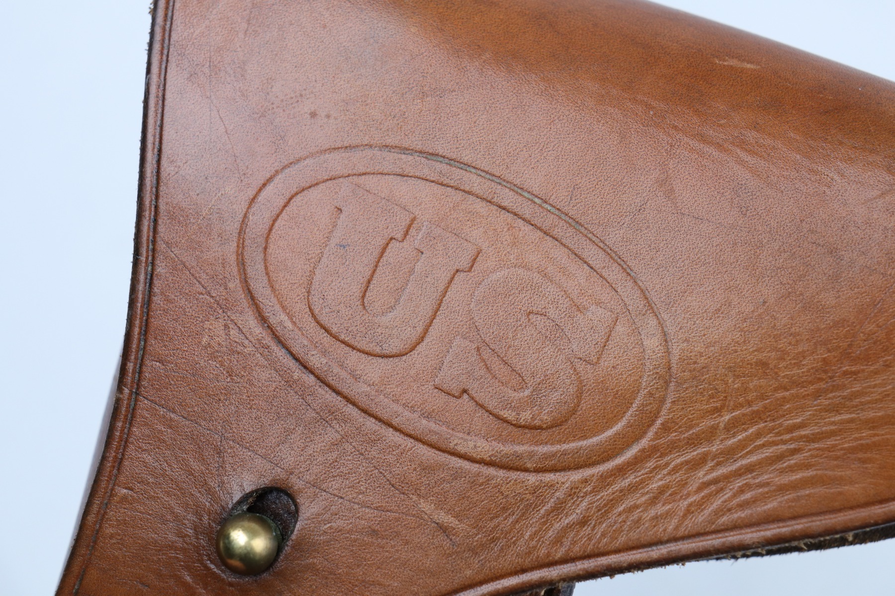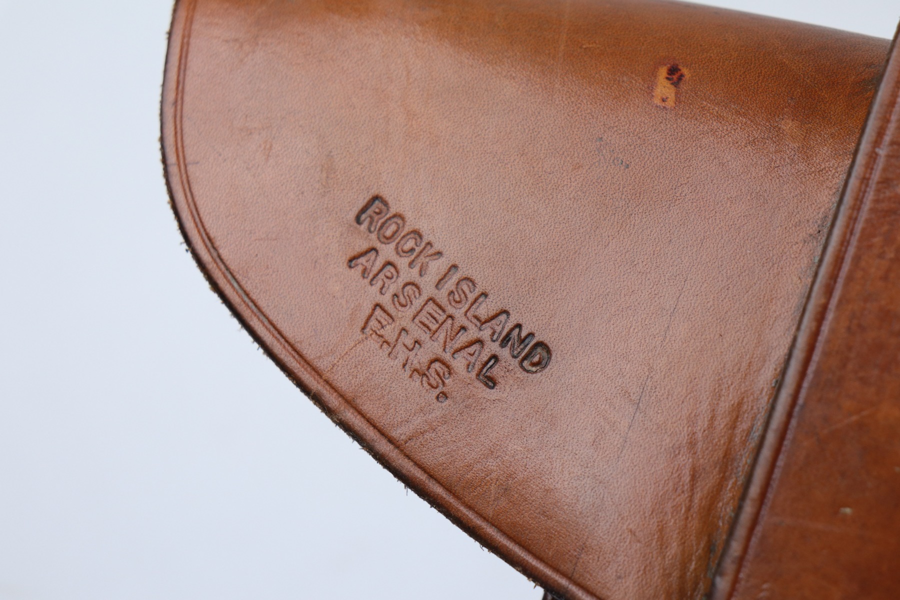 5/12/20 – This is a rare and authentic US Army Test Eagle Holster. It goes with a 1900 American Eagle Test Luger. These are hard to find and very desirable to collectors. This example is in excellent condition. The leather is soft and workable. It closes with a great fit. It has “Rock Island Arsenal” and “H.D.” marked. There are light surface scuffs throughout and one small area of discoloration on the back of the holster, just under the top flap. This holster was featured in a recent Youtube video. Link below!