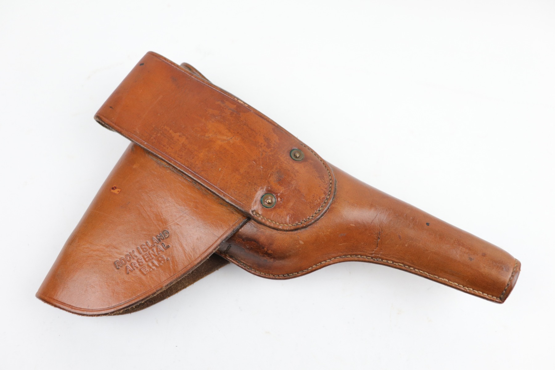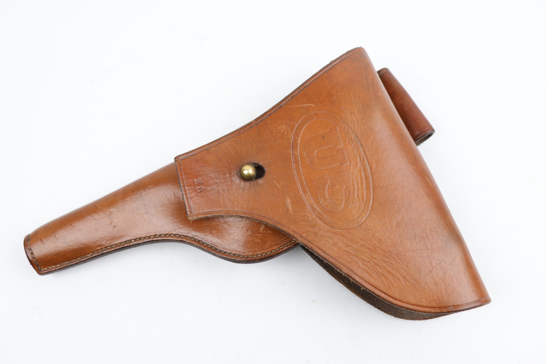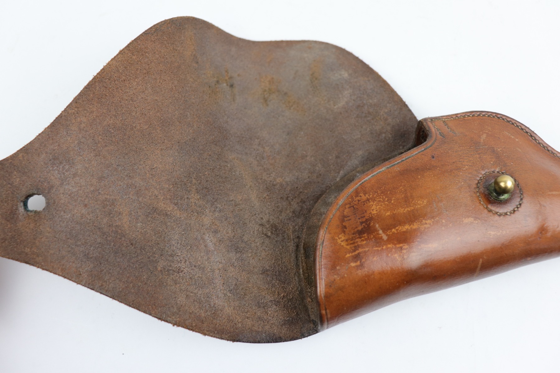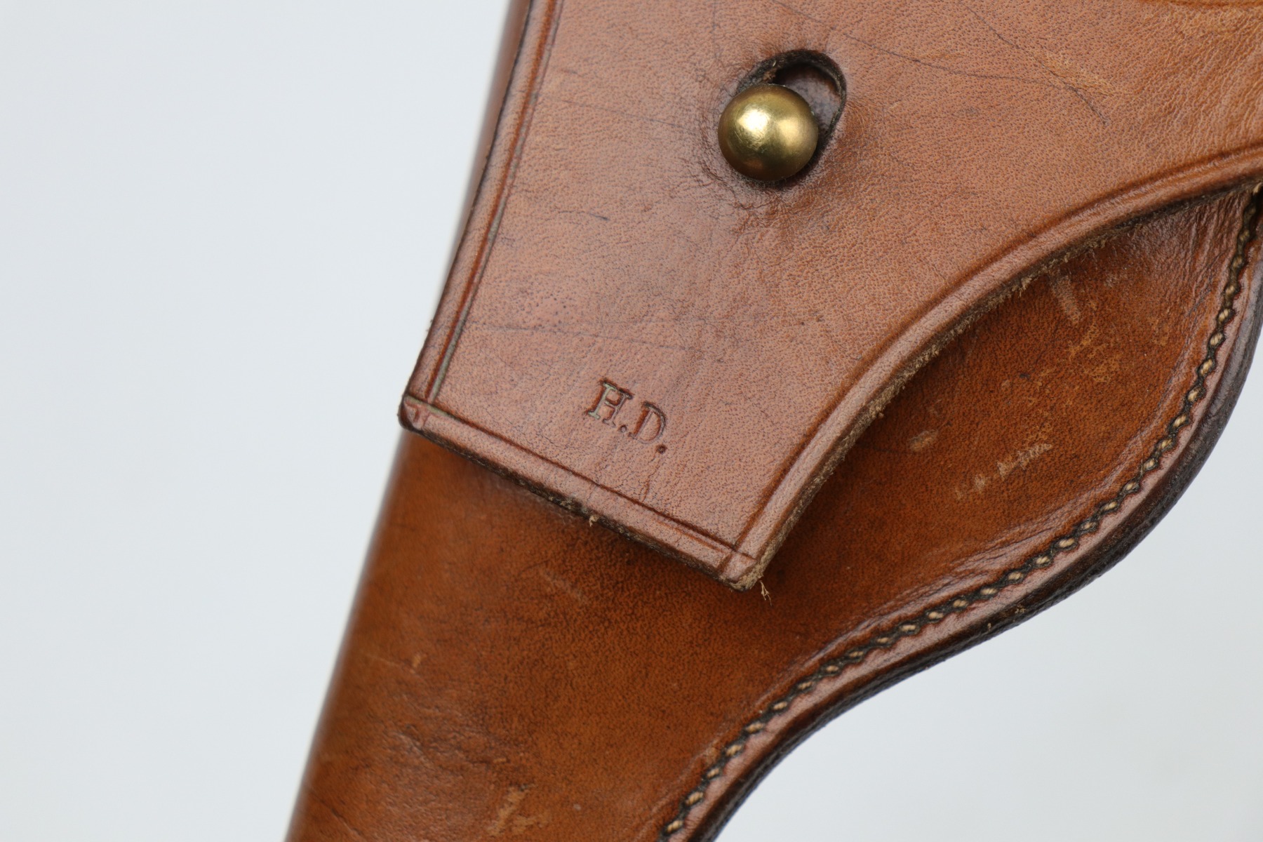 5/12/20 – This is a rare and authentic US Army Test Eagle Holster. It goes with a 1900 American Eagle Test Luger. These are hard to find and very desirable to collectors. This example is in excellent condition. The leather is soft and workable. It closes with a great fit. It has “Rock Island Arsenal” and “H.D.” marked. There are light surface scuffs throughout and one small area of discoloration on the back of the holster, just under the top flap. This holster was featured in a recent Youtube video. Link below!