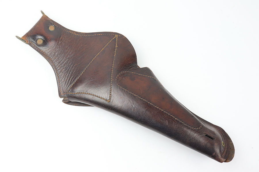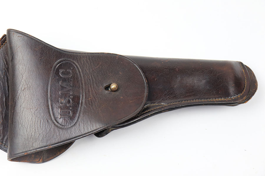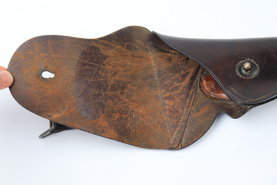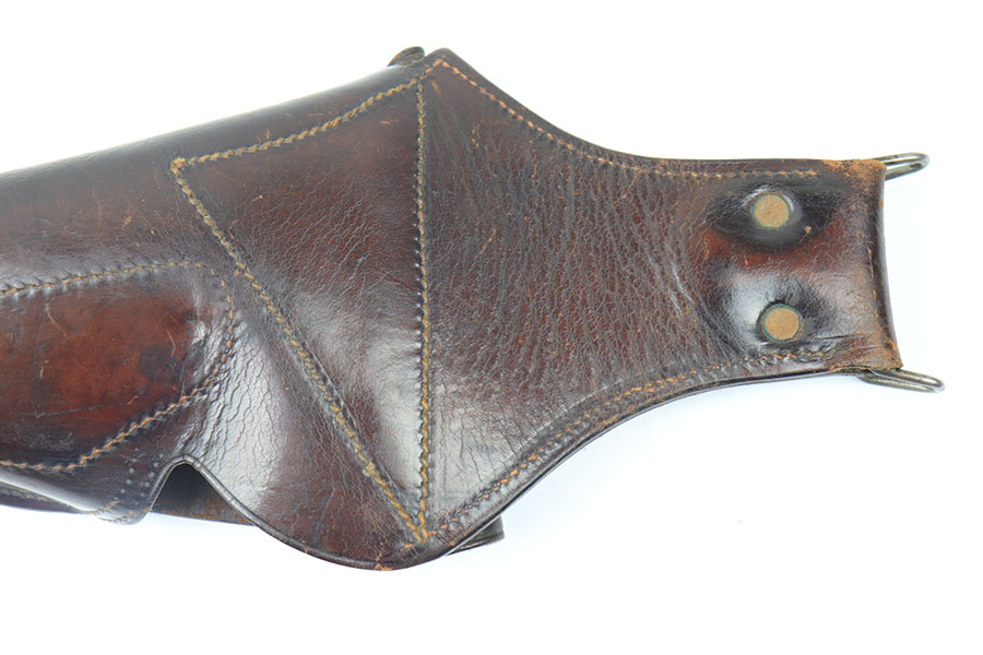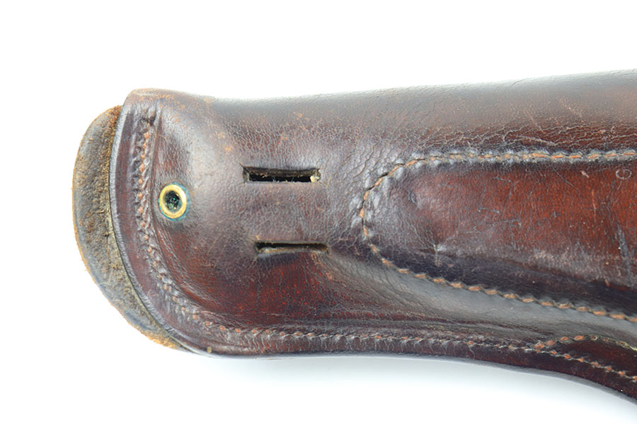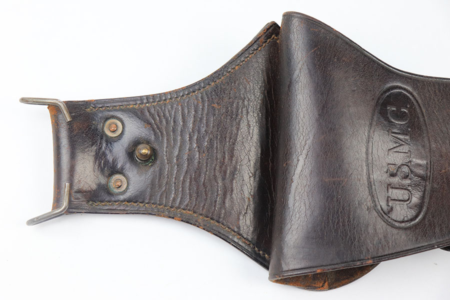 7/2/21 – This is a very scarce 1911A1 holster marked USMC. The holster has a strong, crisp stamp on the front leather and comes complete with the extended belt attachment. There is no maker marking or date stamps, only the USMC stamp on the front. The leather is in great condition with some normal signs of use but no excessive wear. Excellent stitching is completely in tact.
