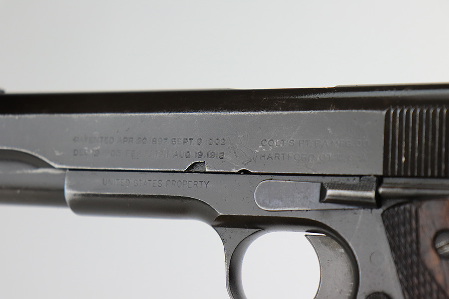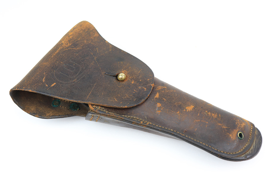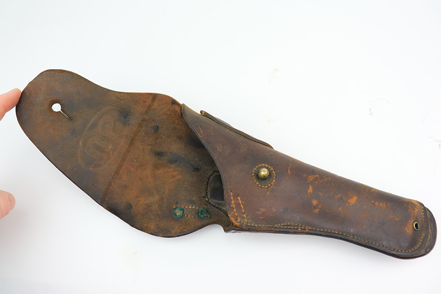 4/18/22 – This is a rare Colt M1911 that was issued to the U.S. Marine Corps toward the end of 1917. It’s in the proper serial range for a small batch of 400 pistols that were shipped to the USMC at this time. There were only 5,000-6,000 total 1911’s sent to the marines from 1912-18, notably fewer than the U.S. Navy. This particular pistol is tough to rate as it has deep patina/oxidation. It’s most likely an old refinish as there appears to be some pitting on the frame (under the grips) that is blued over. It has a correct barrel with disconnect ‘P H’ marking and excellent bore. The grips show their age but have no cracks, and the left panel has a notable ding in it. Two-tone magazine with an ‘A’ on the toe. Comes with an original 1917-dated holster with Perkins Campbell maker mark. It has visible age and handling wear with a small tear in the top flap.
