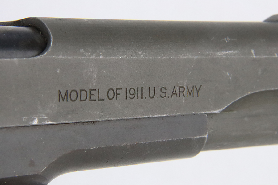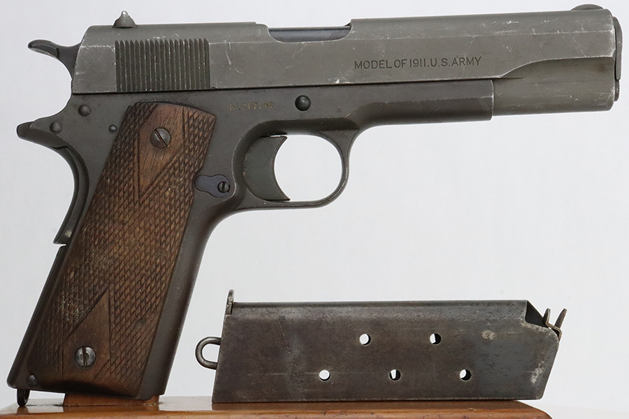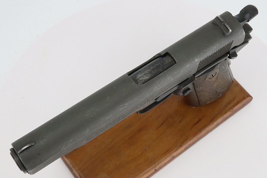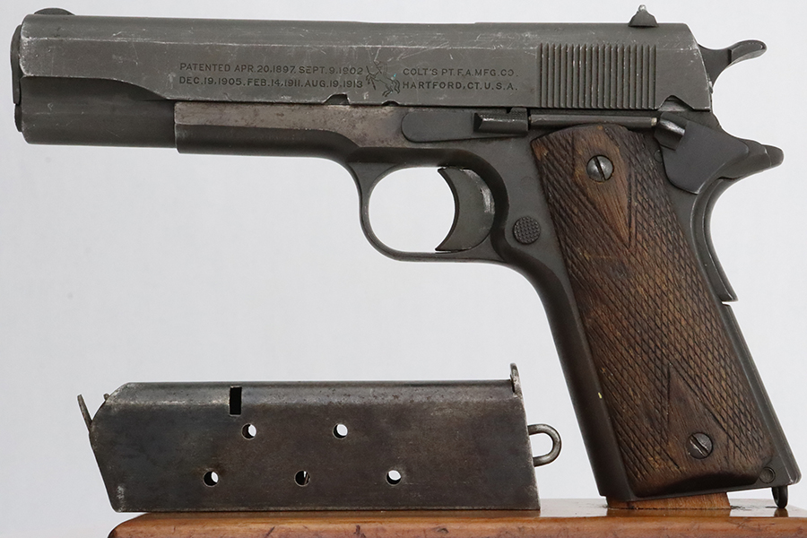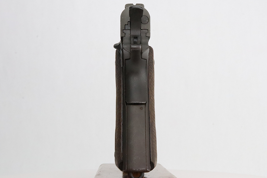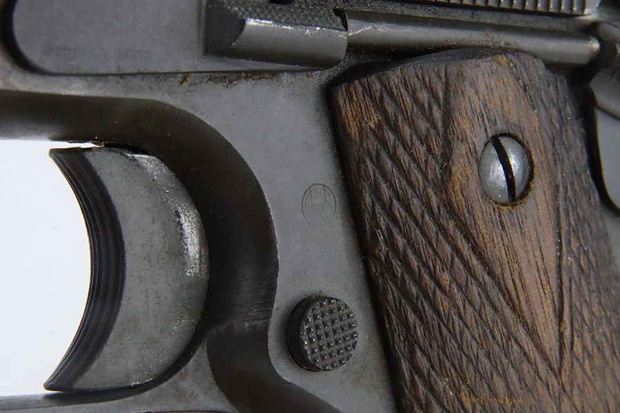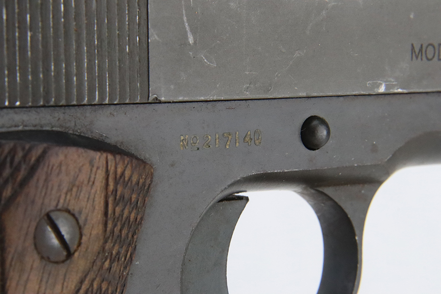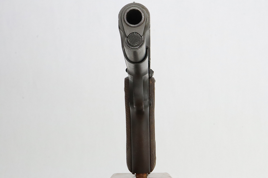 3/4/24 – This is a super rare Colt M1911 from WWI that was shipped to the U.S. Marine Corps in 1918. It has a Springfield barrel. The entire gun has been refinished (parkerized). There is not much actual finish loss, but there is brown patina on the front strap, some spotty oxidation on the left side of the frame, and light surface scratches and scuffs along the slide. Fitted with fairly worn wood grips and comes with one period-correct magazine. Very nice bore.