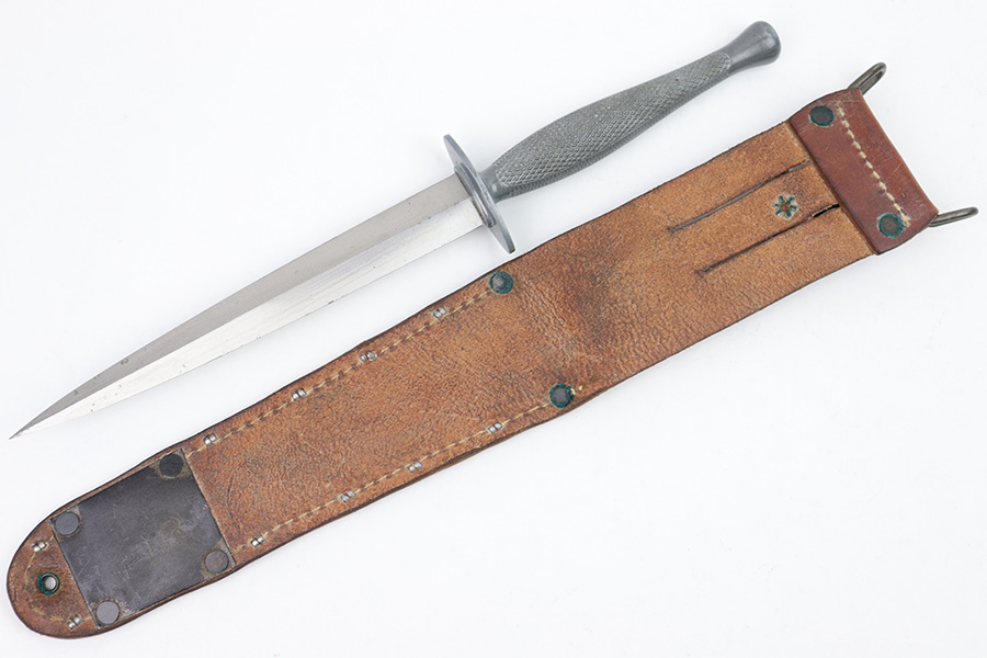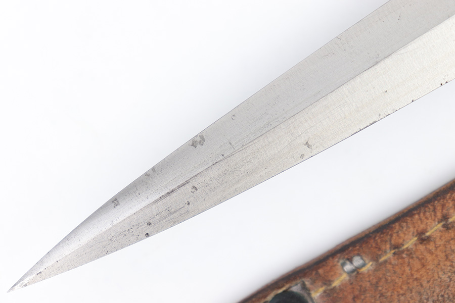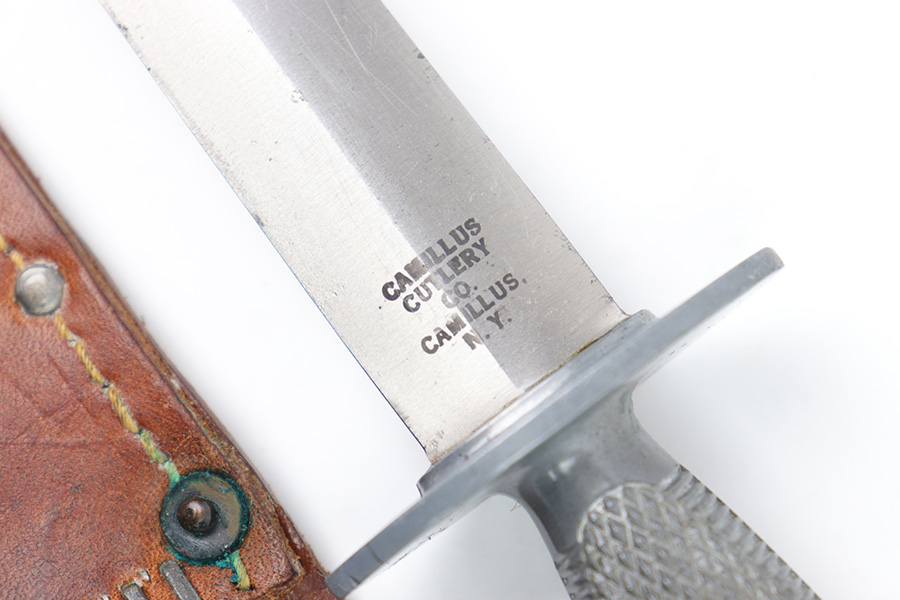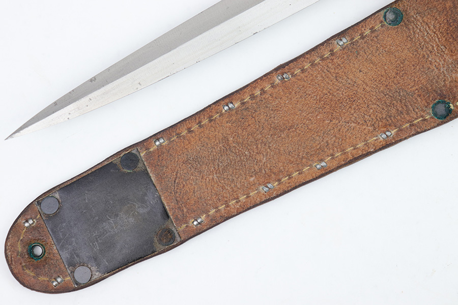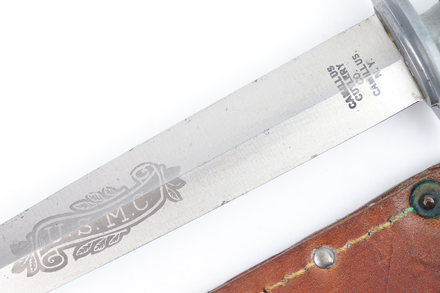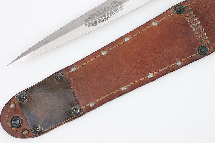 1/23/23 – This is an original, rare variation USMC Marine Raider Stiletto knife with a leather M6 scabbard. The knife is in excellent overall condition with a USMC etched engraving on one side, about halfway down the blade. The base of the blade is maker marked by Camillus as shown. There are a few light spots of surface discoloration and some mild surface scratches, but overall the blade is clean and excellent. The edges are unsharpened and don’t have any dents or dings. The zinc handle has a sharp diamond pattern and is in great condition. The leather scabbard is excellent and unmarked. These were made in 1942 for the US Marine Corps, and about 14,000 were produced. These often saw heavy use and therefore are seldom found in this condition.