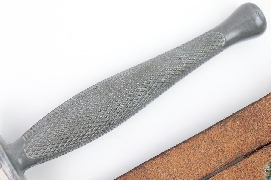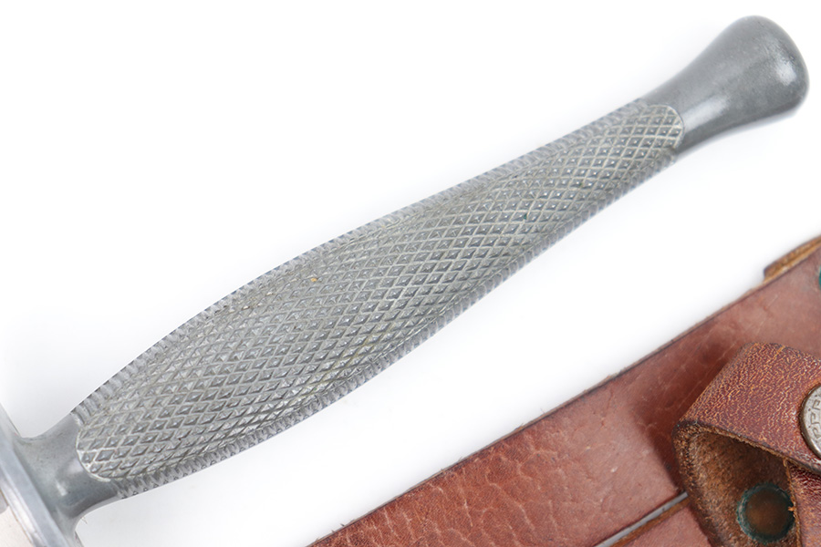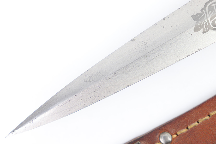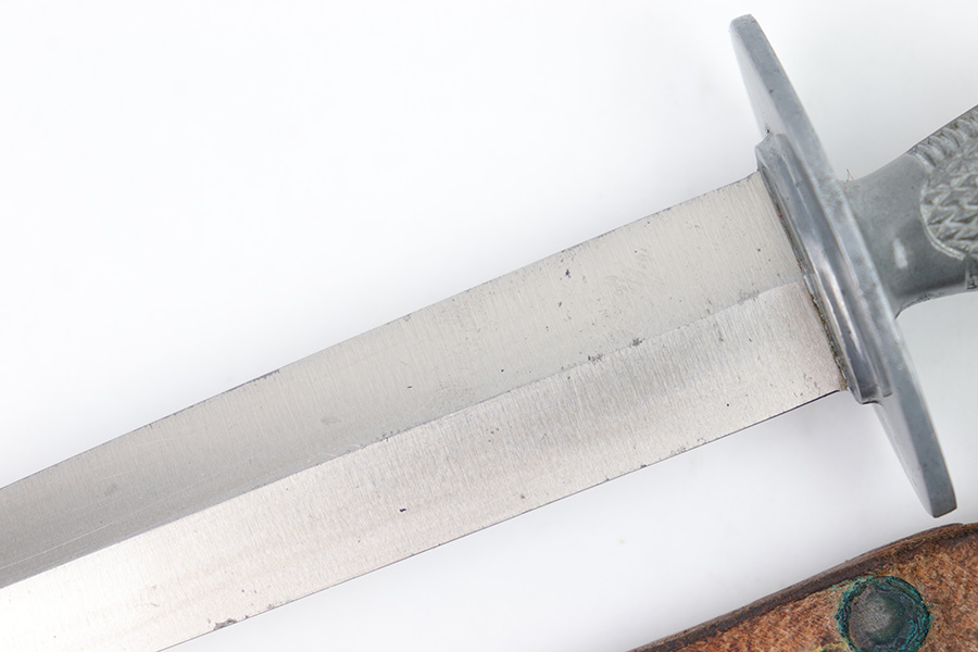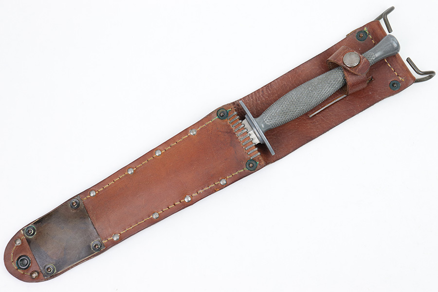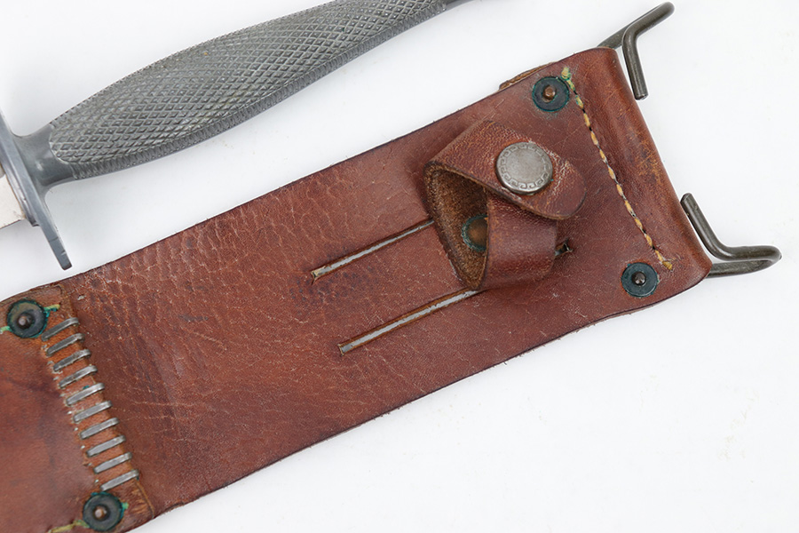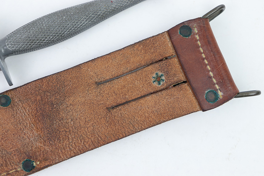 1/23/23 – This is an original, rare variation USMC Marine Raider Stiletto knife with a leather M6 scabbard. The knife is in excellent overall condition with a USMC etched engraving on one side, about halfway down the blade. The base of the blade is maker marked by Camillus as shown. There are a few light spots of surface discoloration and some mild surface scratches, but overall the blade is clean and excellent. The edges are unsharpened and don’t have any dents or dings. The zinc handle has a sharp diamond pattern and is in great condition. The leather scabbard is excellent and unmarked. These were made in 1942 for the US Marine Corps, and about 14,000 were produced. These often saw heavy use and therefore are seldom found in this condition.