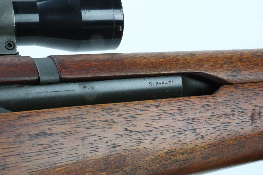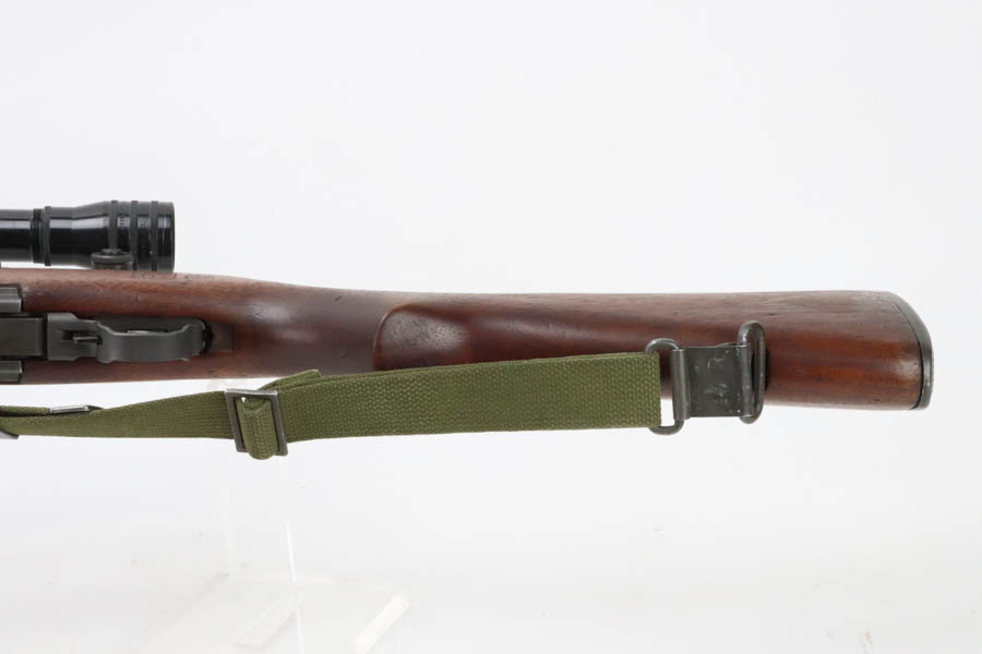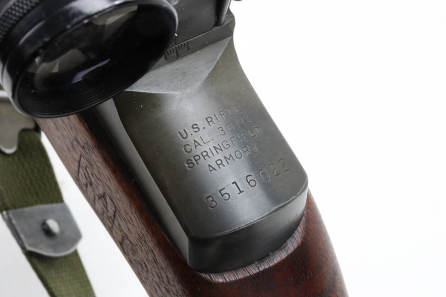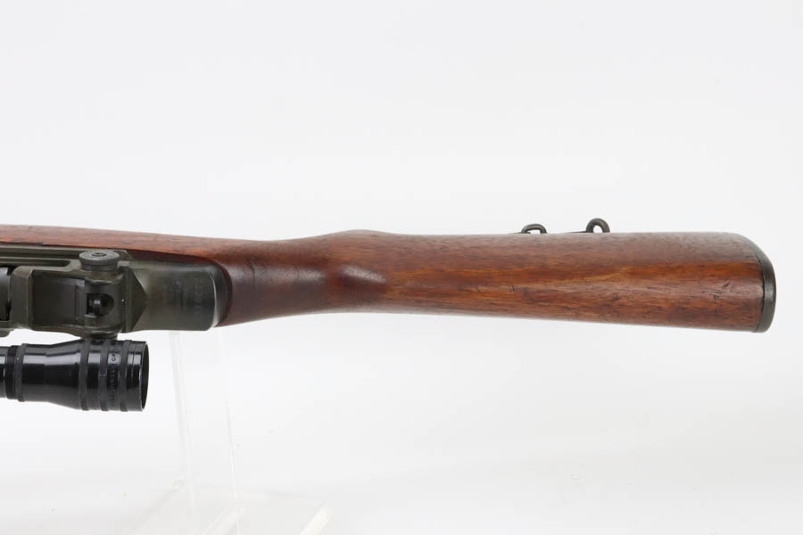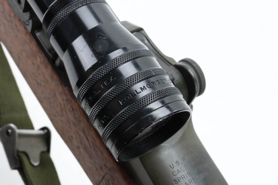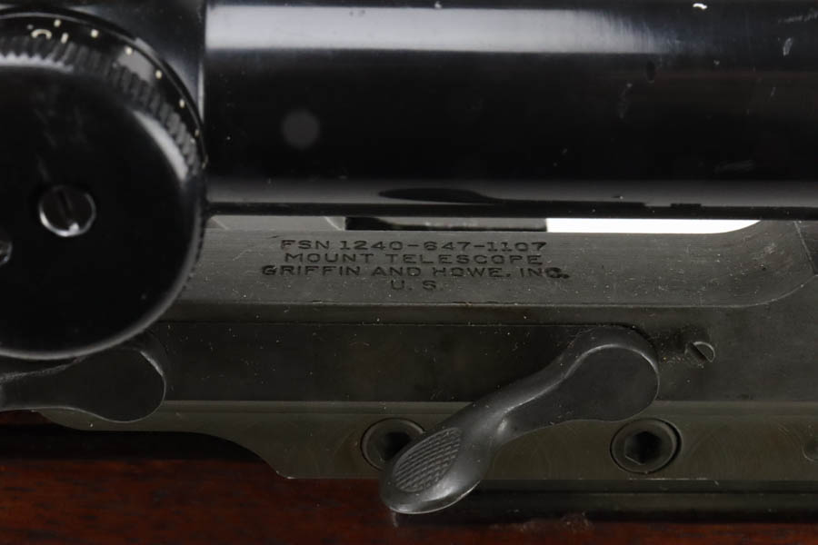 8/7/24 – This is a rare, late WWII production (February,1945) Springfield Armory M1C Sniper rifle rebuilt by Springfield Armory during the Korean War (c. 1952) and fitted with a USMC Stith Kollmorgen MC-1 telescopic sight with special Griffin & Howe mount and rings. This rifle was originally one of the approximately 7,900 M1C Sniper Rifles manufactured by the SA from January-December 1945. The WWII production M1C rifles fall generally within the 3,250,000 – 3,790,000 serial number range. This rifle was rebuilt by Springfield Armory during the Korean War. Following the Korean War the Marine Corps adopted the 4X Kollmorgen MC-1 telescopic sight with a larger Griffin & Howe mount and one-inch rings for use on the M1C sniper rifles. The Marines designated these rifles as the “1952 Sniper Rifle” and issued them is limited numbers from c.1954-1967. Scope is marked ‘4X DOUBLE SMITH MOUNTS’ over ‘KOLLMORGEN OPTICAL CORP’. The letters/numbers ‘MC 1196′ are also hand etched on the side of the scope. The First Style MC-1 mount is parkerized and has distinctive angular locking levers. The top of the base is roll stamped “FSN1240-647-1107 MOUNT TELESCOPE GRIFFIN & HOWE’. The receiver mount has the matching serial number of the rifle on the underside. Stock is in excellent condition and has late-war Springfield inspection cartouch. Barrel is dated to August of 1951. Minty bore, ME & TE are both under 2. Comes with canvas sling.