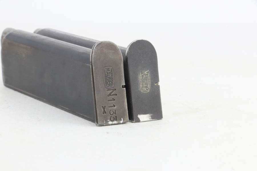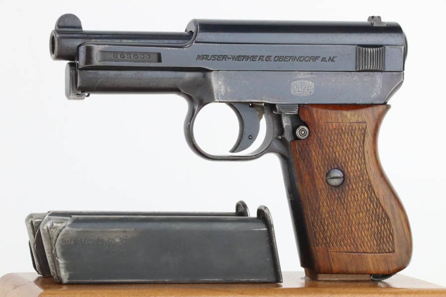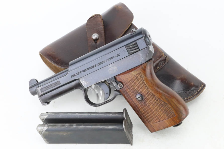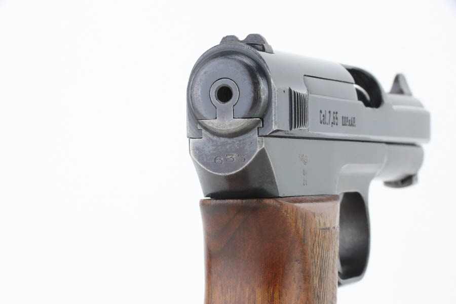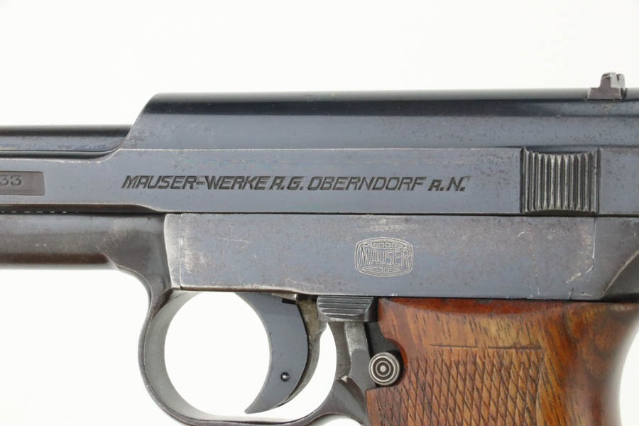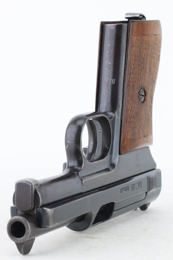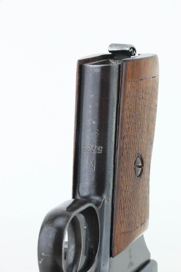 10/29/24 – This is a scarce Navy 1934 Mauser. It is a variation 3 Navy 1934 with a closed wing eagle on the right side of the frame with a “N5725” property mark on the front strap. There were only an estimated 6,000 of this variation procured. It comes as a rig with one “N 113” Navy property marked magazine (doesn’t match), one Mauser marked magazine, and an excellent Navy-style holster – partially visible Mauser ink stamp on the inside and a faint “Eagle M” stamp on the back. The gun has retained about 94% of its original high polish finish. There is little actual finish loss, but there are some areas of pin-pricking here and there – most noticeable on the left side. A few more noticeable pits on the front strap. Excellent wood grip. Very nice bore with good rifling.