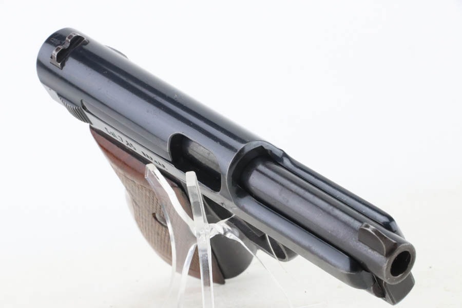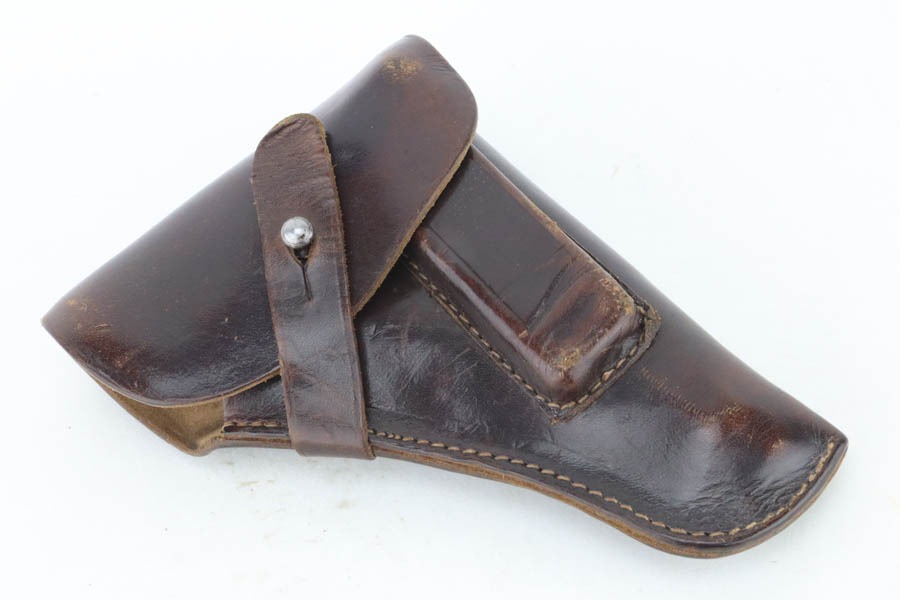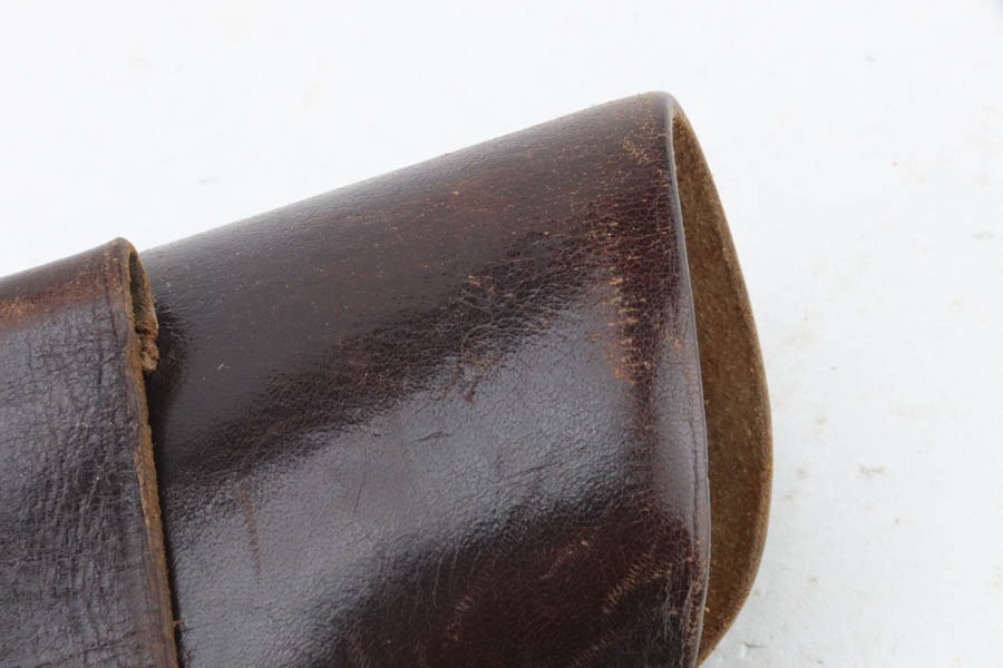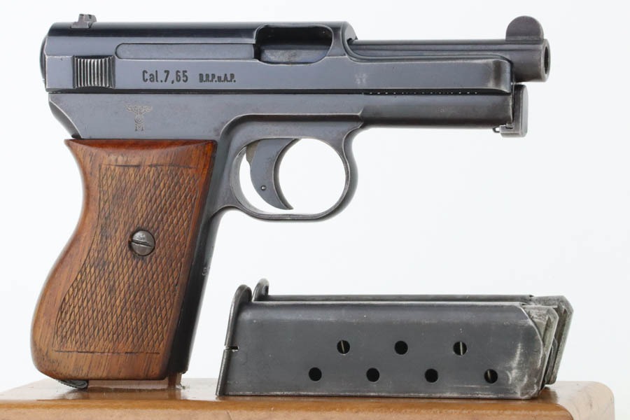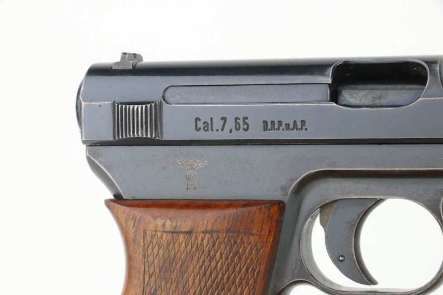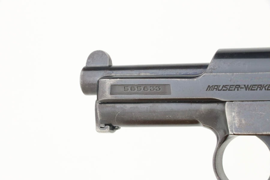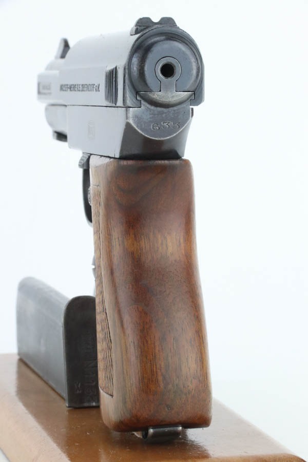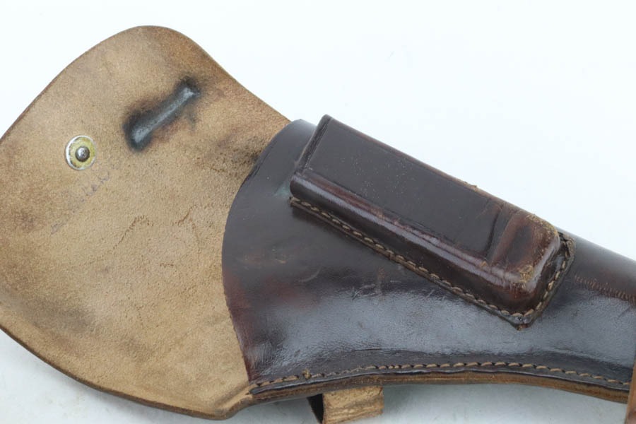 10/29/24 – This is a scarce Navy 1934 Mauser. It is a variation 3 Navy 1934 with a closed wing eagle on the right side of the frame with a “N5725” property mark on the front strap. There were only an estimated 6,000 of this variation procured. It comes as a rig with one “N 113” Navy property marked magazine (doesn’t match), one Mauser marked magazine, and an excellent Navy-style holster – partially visible Mauser ink stamp on the inside and a faint “Eagle M” stamp on the back. The gun has retained about 94% of its original high polish finish. There is little actual finish loss, but there are some areas of pin-pricking here and there – most noticeable on the left side. A few more noticeable pits on the front strap. Excellent wood grip. Very nice bore with good rifling.