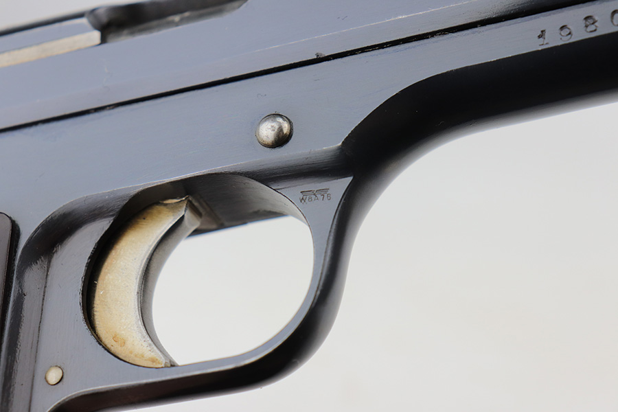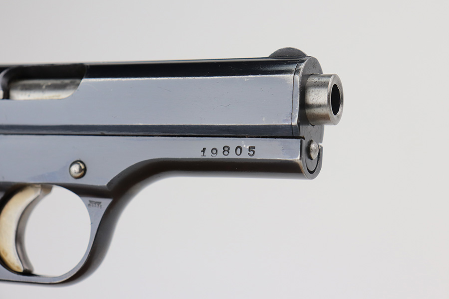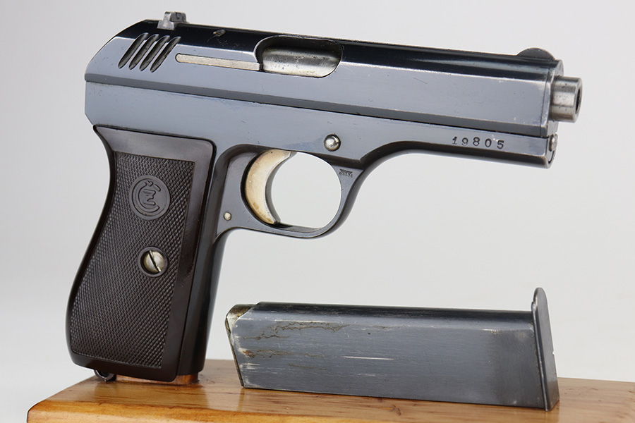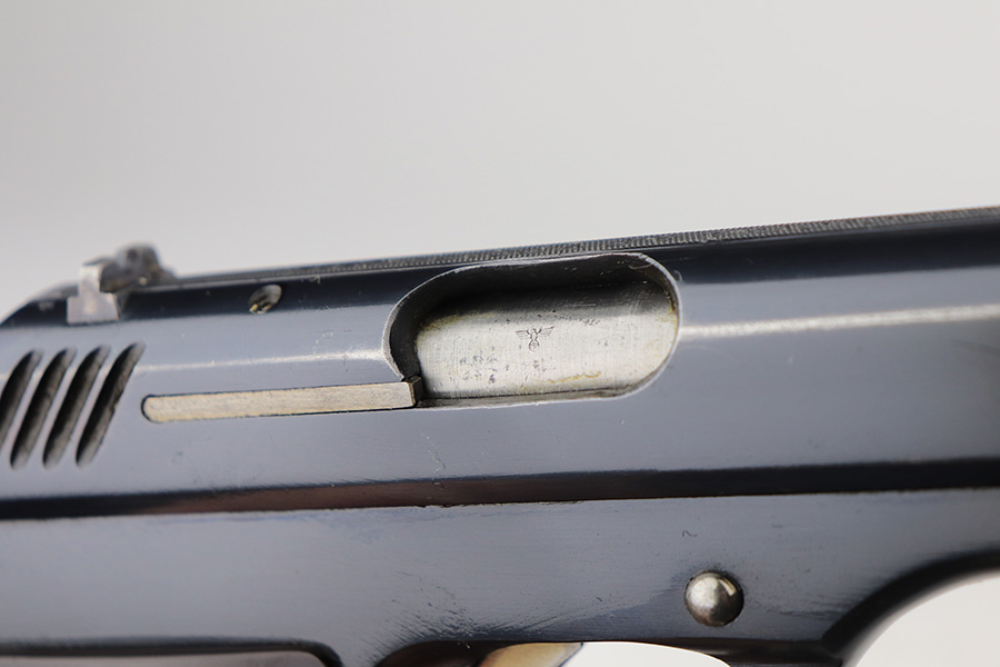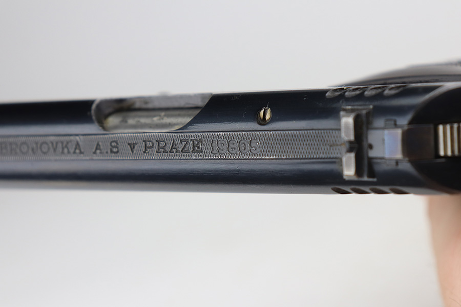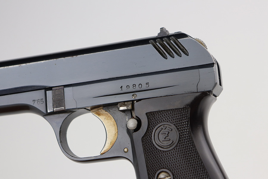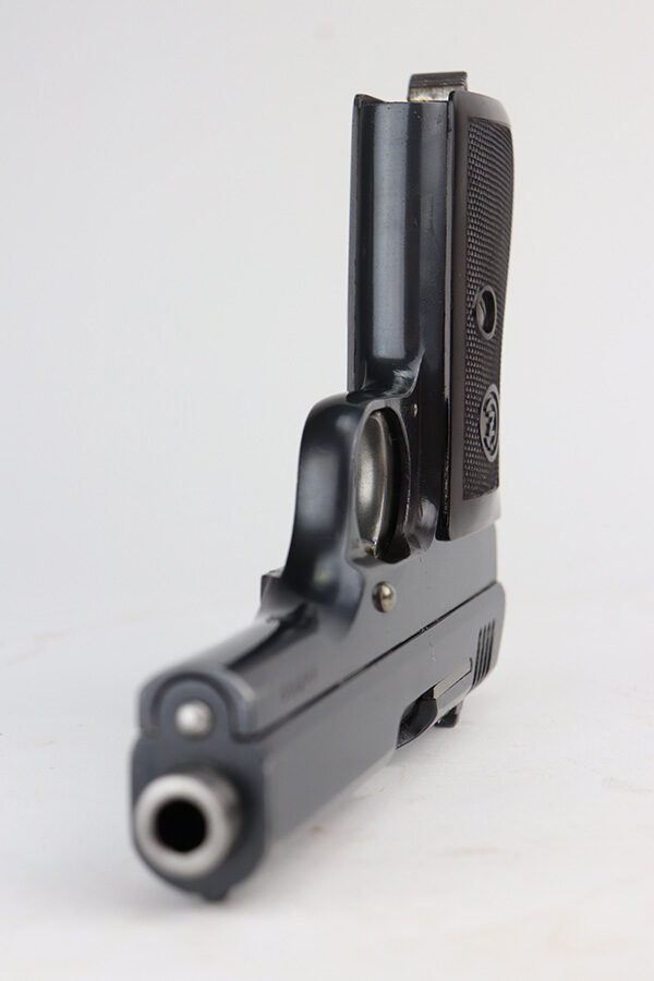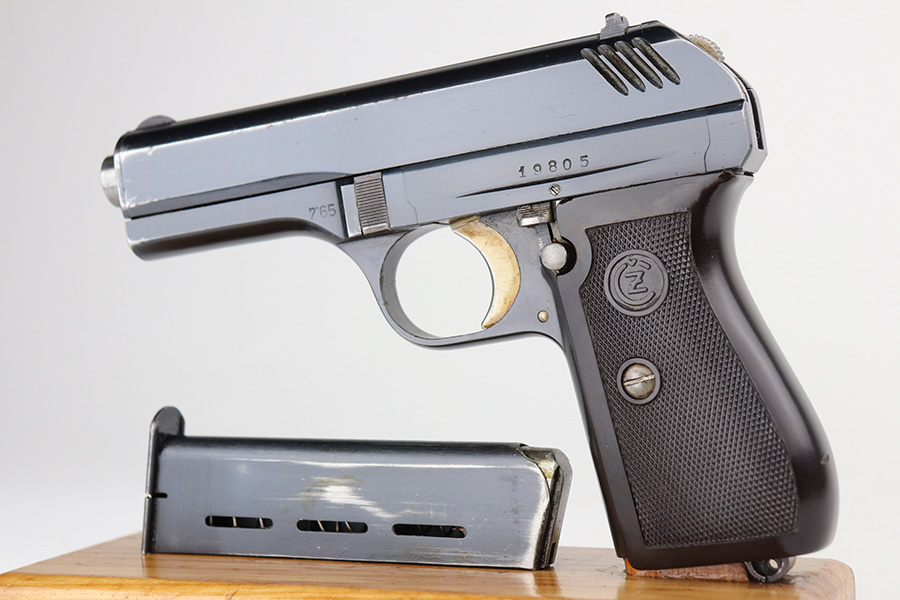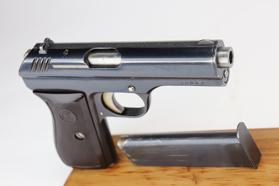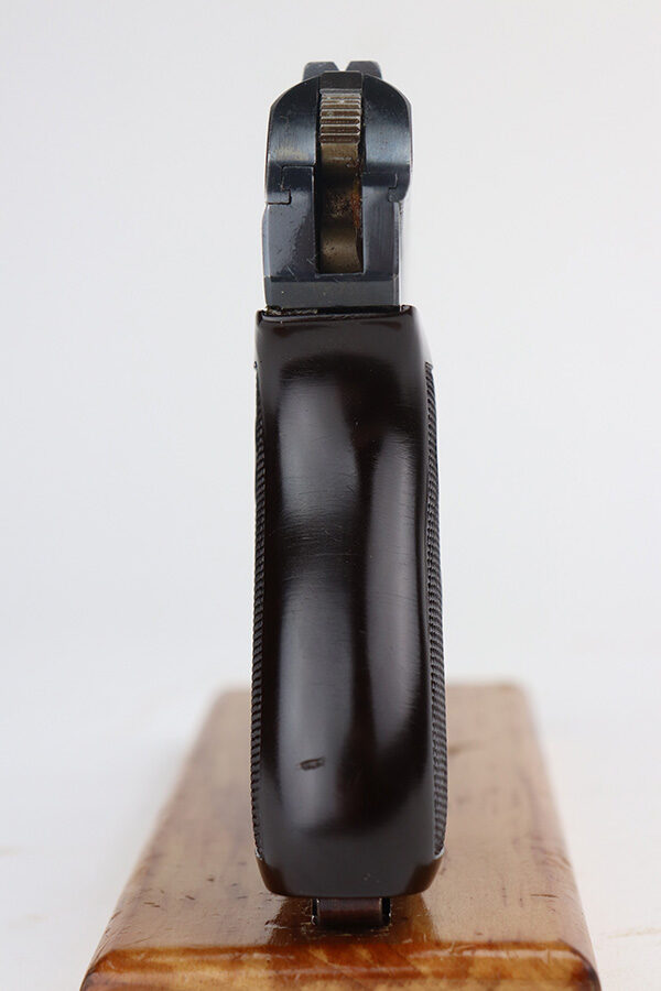 6/8/21 – This is an excellent example of a rare and very early CZ Model 27 issued to the Nazi military around 1940. This gun is known as being of the “Ceska Variation”, characterized by a “Ceska” slide legend, slanted slide serrations, a Nazi test proof on the chamber, a “Waffen 76” military proof on the right side of the trigger guard, and found in the 16000 – 21400 serial range. Only a few thousand were made. They were issued to the Nazi military before the Nazis changed the slide legend to the “Bohmische” (or Bohemian in German) variation. This gun has retained about 96-97% of its high polish finish. There is minor wear on the high edges of the slide and around the muzzle. Comes with an excellent grip with no cracks or chips. Also comes with a proper magazine. Mint bore.