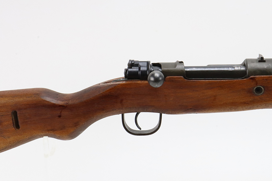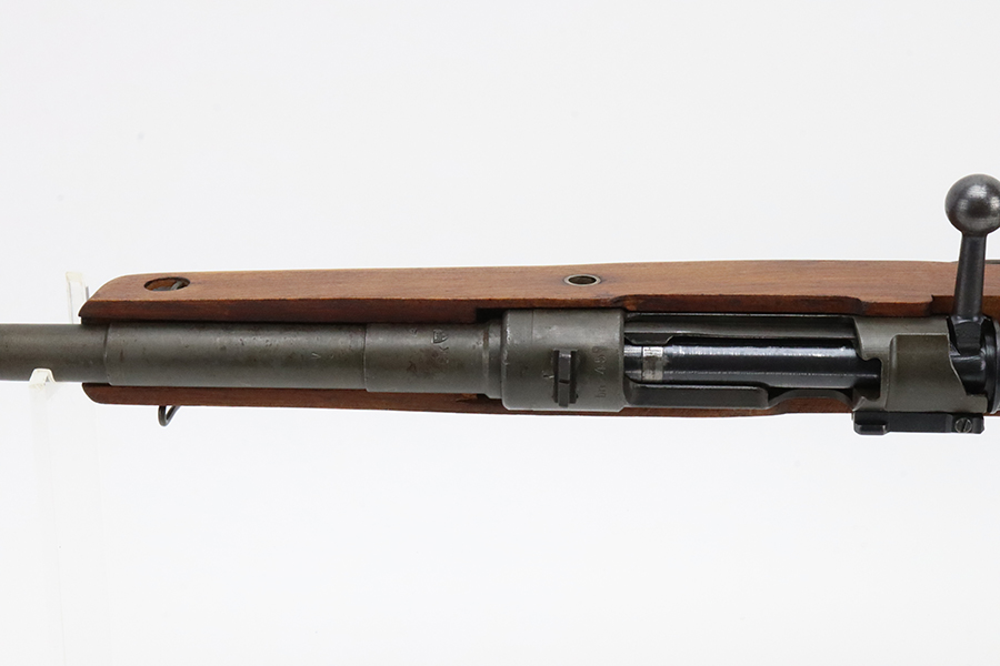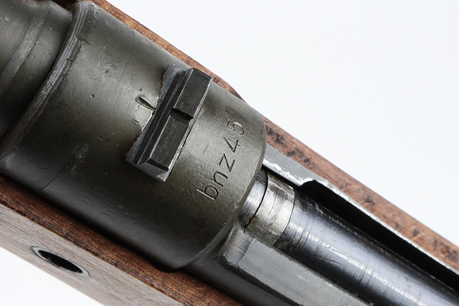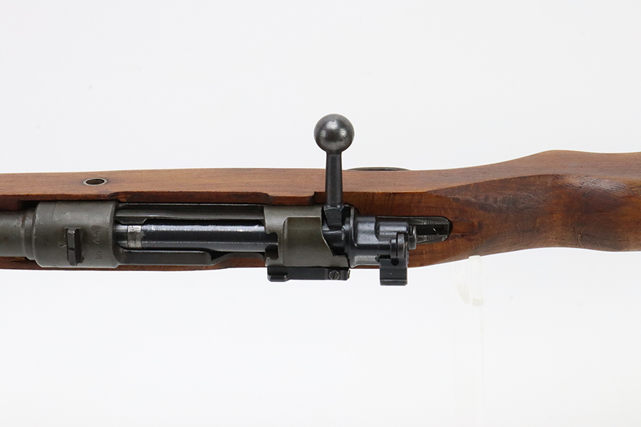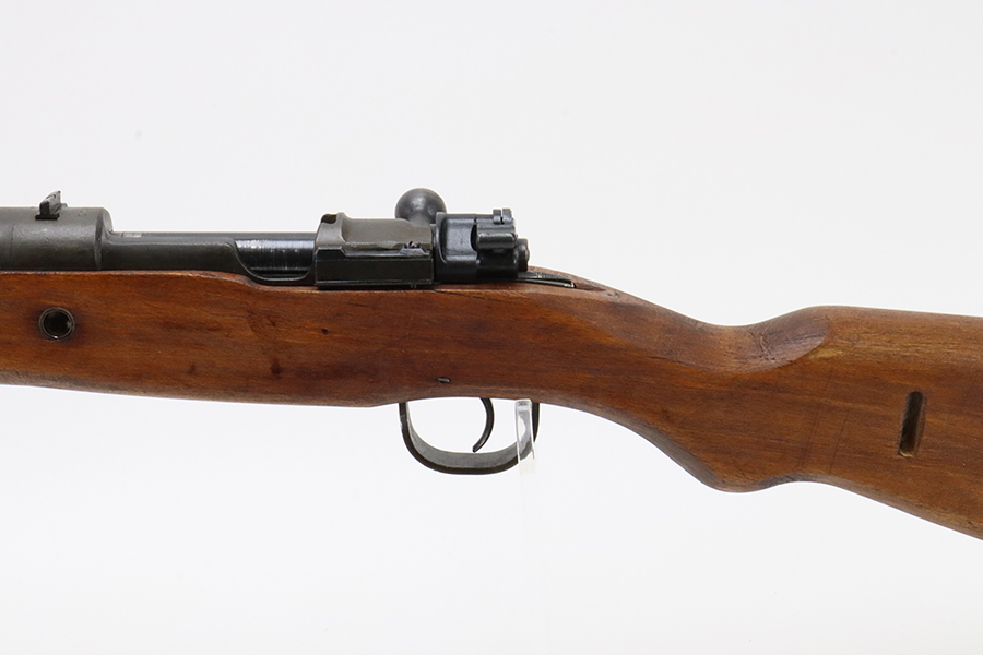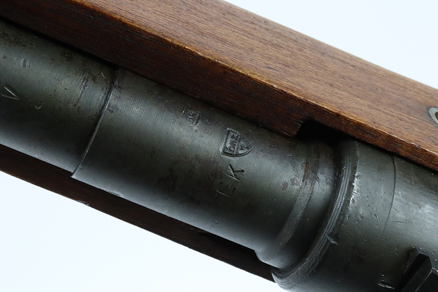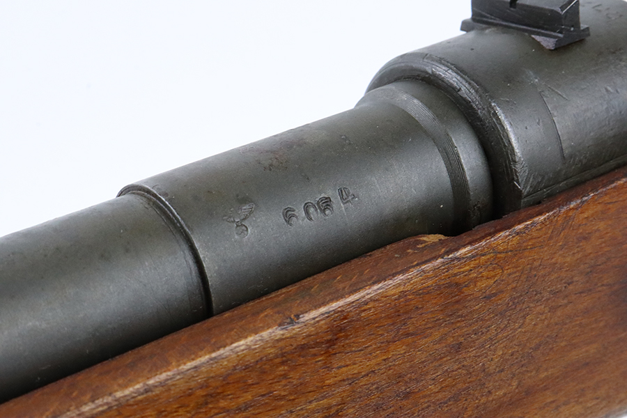 2/29/24 – This is an excellent example of a rare Steyr VG-98 rifle. Manufactured at the very tail end of the WWII, the VG-98 was part of the “Volkswaffen” (People’s Weapon) series of armaments, intended to gear up German 2nd line defensive formations without diverting higher quality armaments still needed by the main formations of the Wehrmacht and Waffen-SS. Most of the units destined to receive these weapons were “Volksturm” (People’s Storm or People’s Assault), which consisted mostly of men too old and boys too young to be properly drafted. When the war came to an end, few VG98s were picked up by Allied trophy hunters since they weren’t as “pretty” as the more common 98k or mechanically novel like some other Volks weapons, resulting in very few being available on the contemporary American market. The heart of the VG98 is a Model 98 receiver, with crude fixed sights, a roughly finished barrel, and a one-piece stock. This particular example is marked ‘bnz 45’, denoting it was made in 1945 at the Steyr factory. The finish is shows minimal wear, and is a mix of phosphated and blued parts. There is some light spotty oxidation on the phosphate parts. Unique straight-bolt. Bolt and receiver are matching. Excellent wood. Mint bore.