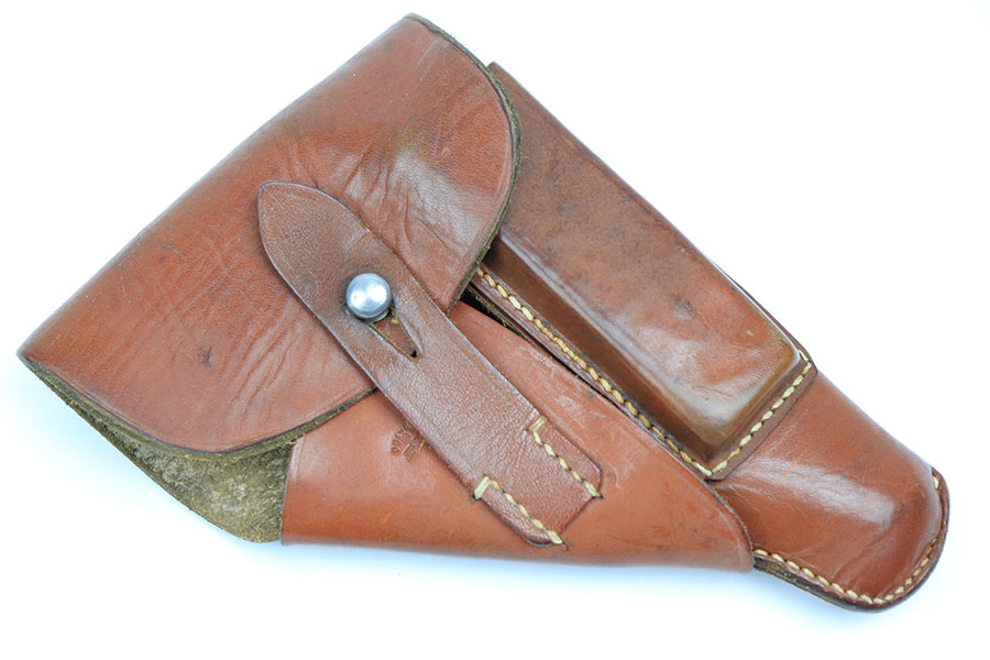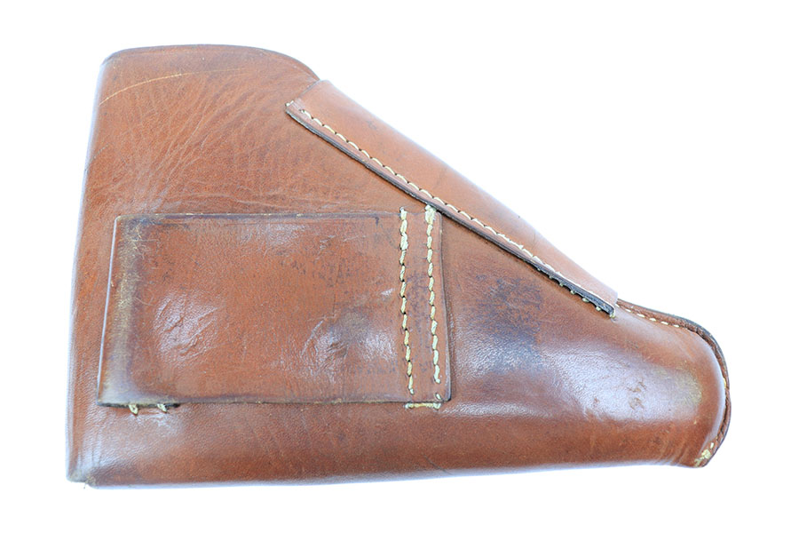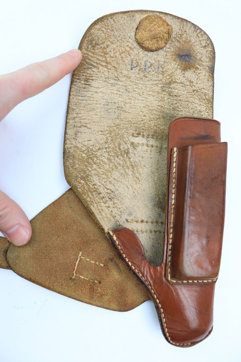 1/21/21 – This is an original, rare variation waffen proofed Walther PPK holster from WW2. Under the closure strap is a WaA100 proof eagle. No other markings. Very nice brown leather has some discoloration and minor scuffing but no major issues. All original stitching in tact. Perfect holster for your waffen proofed PPK, or luftwaffe PPK.