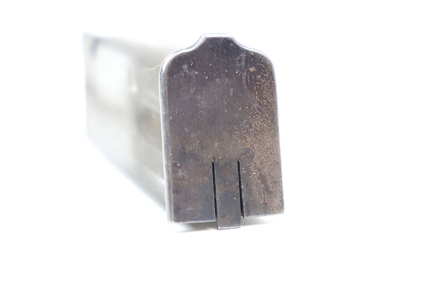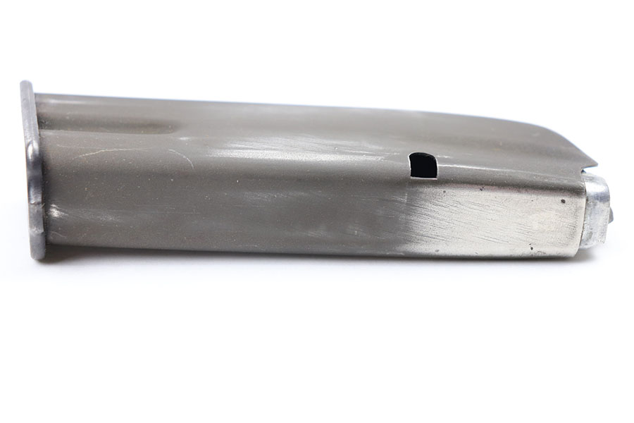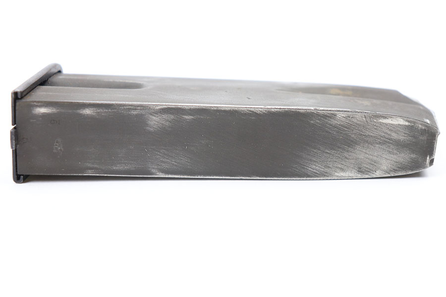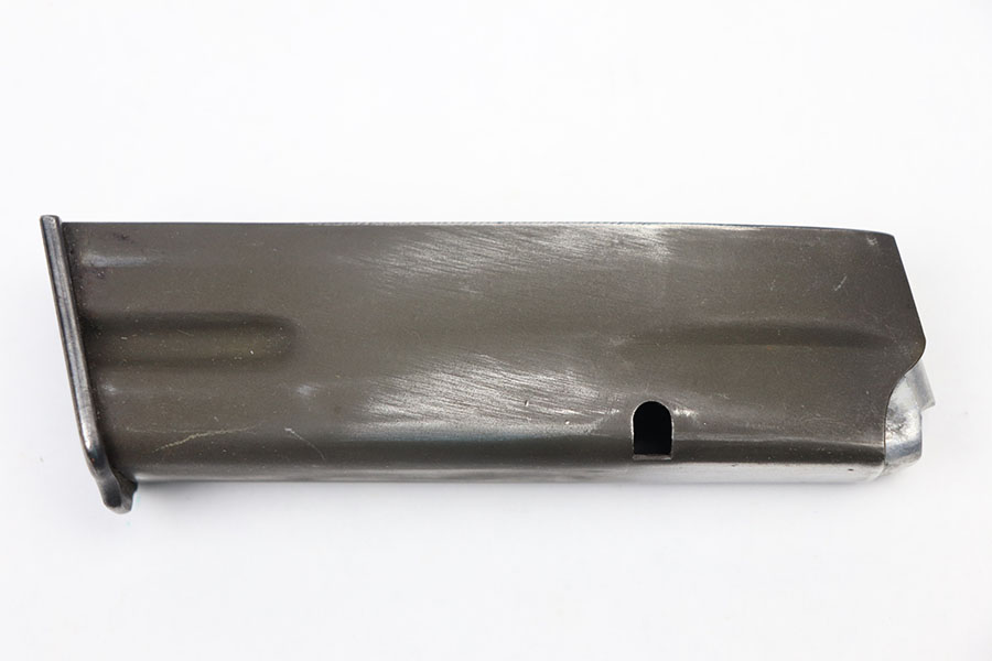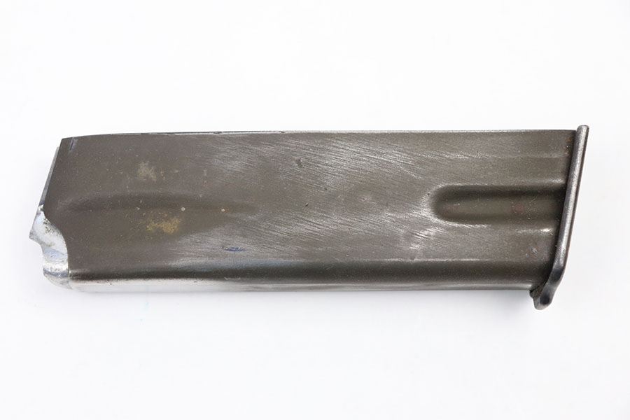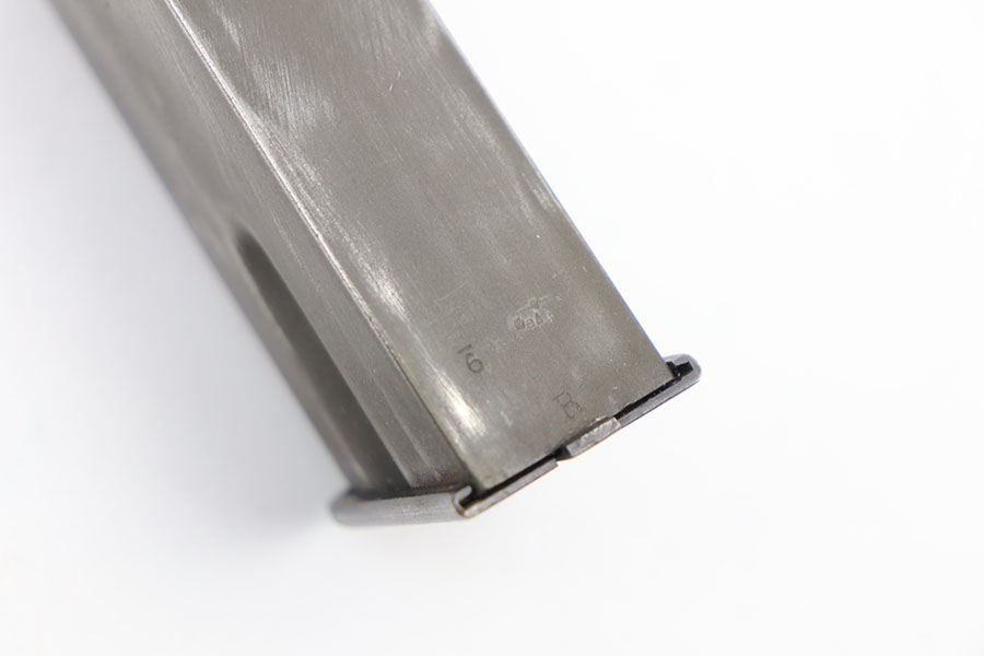2/10/21 – This is an original WW2 FN Browning High Power magazine with a waffen proof stamp on the spine. The stamp is fairly weak, but the eagle wings and “WaA” is visible. Under very close inspection, we can see the first digit is a “6”, which only leads to the conclusion that this is a WaA613 proof stamp (rare). The price is lowered because of the weak stamp. The magazine has a strong fully functional spring. Some mild finish loss and wear but no major damage.