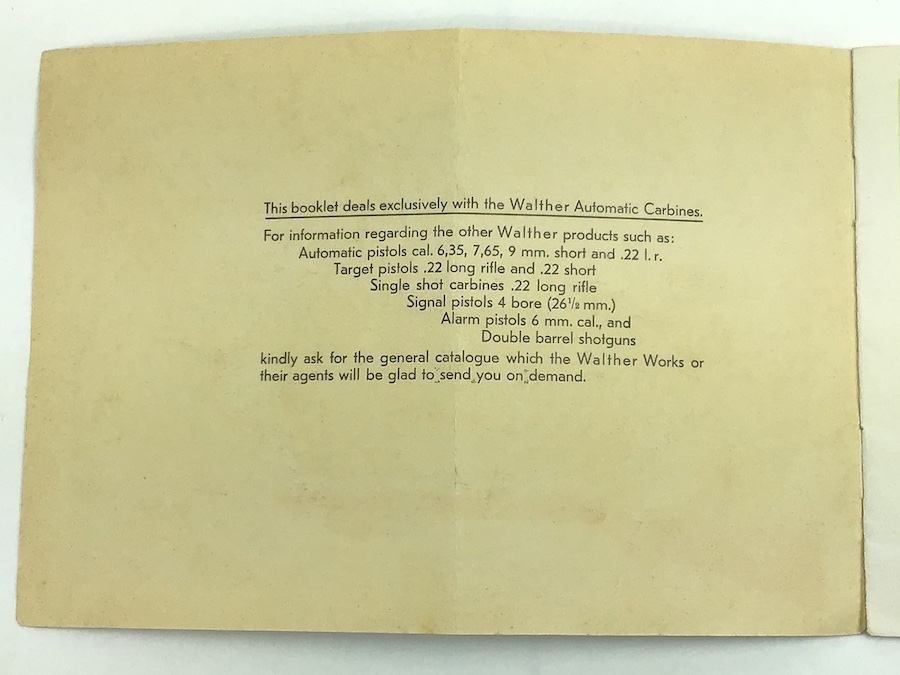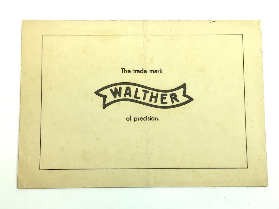 6/14/21 – Original and excellent condition. Printed in English for the commercial market, this rare catalog features details of the Walther Model I and Model II carbines. Fully intact. Great addition to any Walther collection.