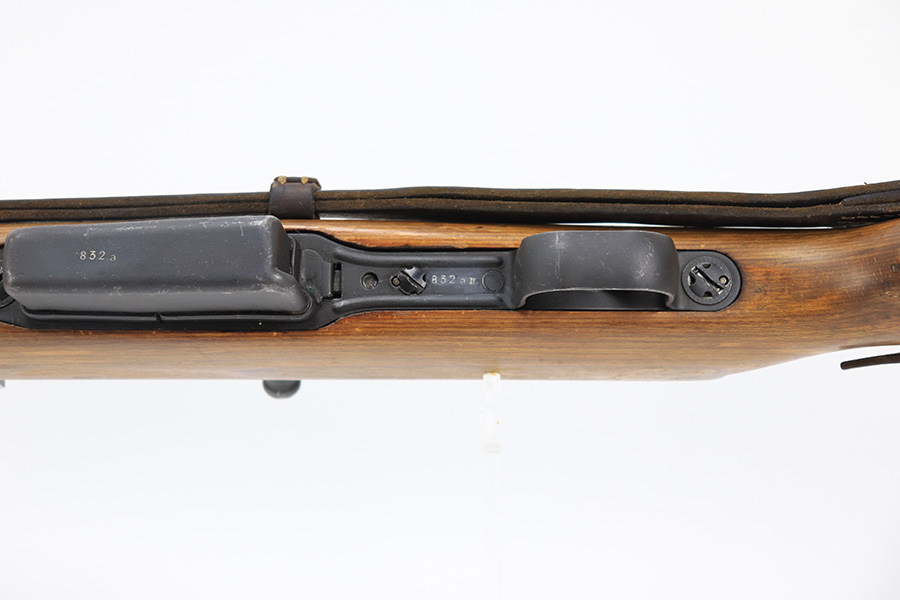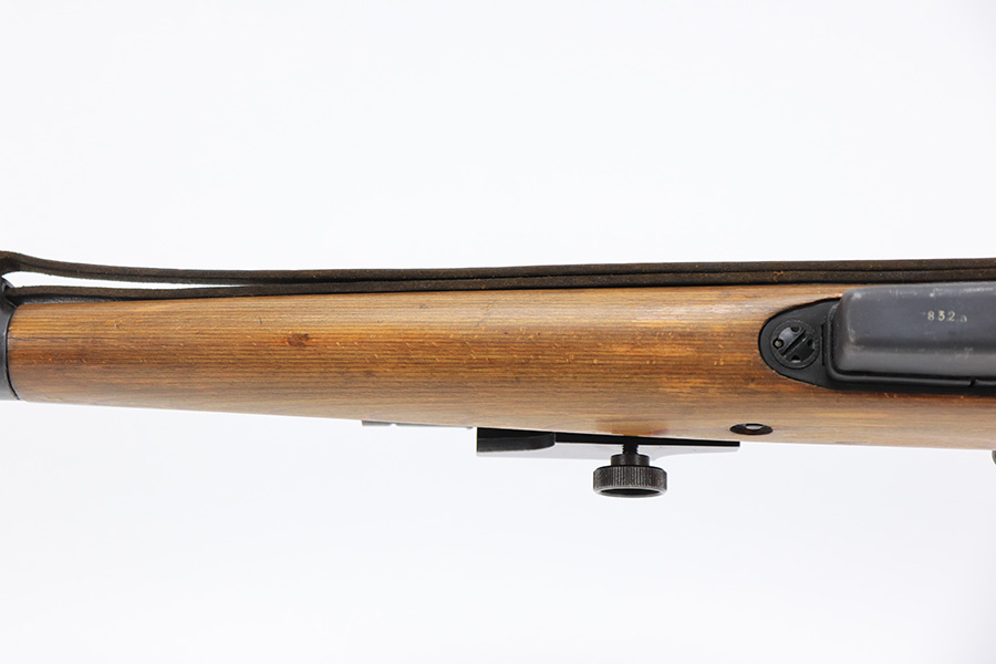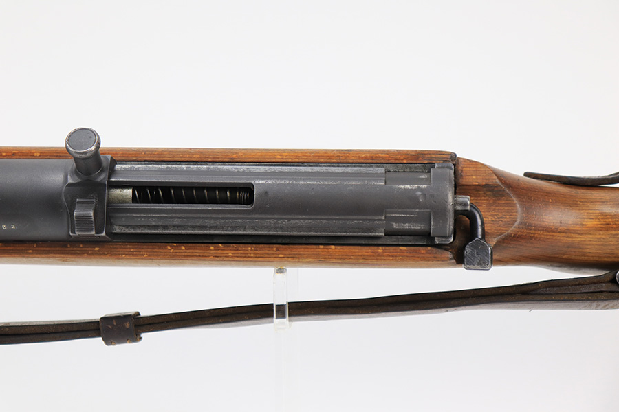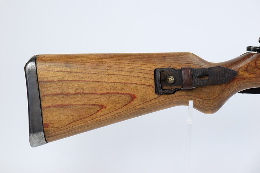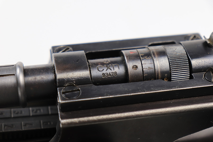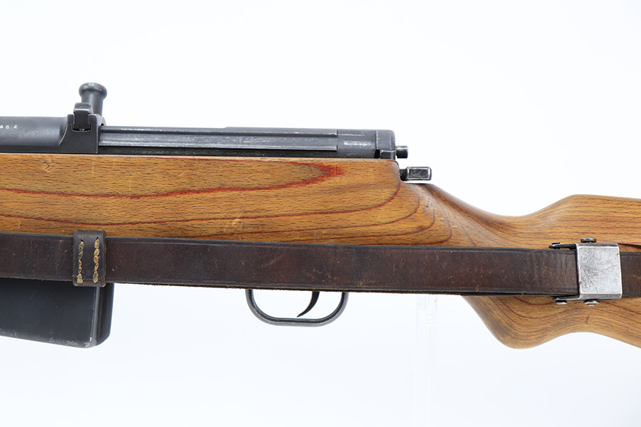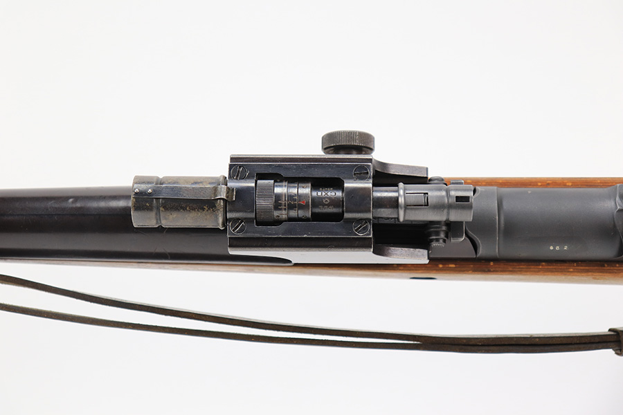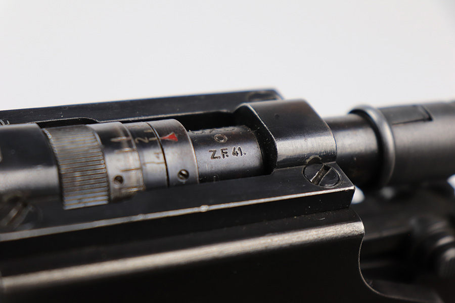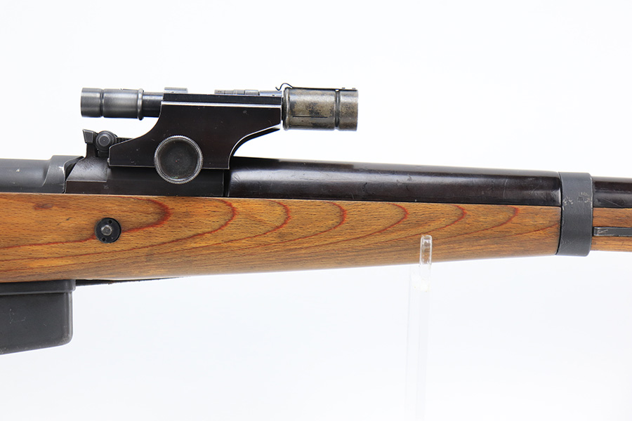 6/8/23 – This is a rare Walther G.41 in sniper configuration from 1943. It features a ZF41 scope with reproduction mount, as well as a rare and original painted scope case. The finish on the rifle has been restored though, looking similar to a parkerized finish. All numbered parts on the rifle match but the bolt carrier has an overstamp. Bore has strong rifling but some frost and freckling in the grooves. Stock is in terrific condition but was sanded at some point. Scope optics are a little cloudy but the reticle is fairly clear. Rifle comes with a cleaning rod and sight hood. Also has a period original sling.